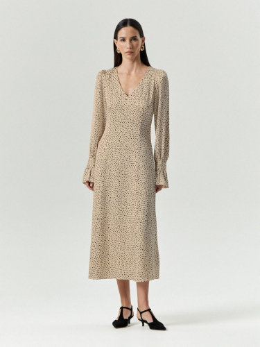 Эффектное платье в цвете морской волны идеально подойдёт для свидания, фуршета или презентации. Изюминка модели — пояс на короткой кулиске спереди. За счёт этой детали платье роскошно смотрится и комфортно садится на разные типы фигур. Впечатление роскошного, волнующего и летящего образа также усиливают высокие разрезы для свободы шага. Модель прямого кроя имеет глубокий и острый V-образный вырез, длинные втачные рукава, присборенные у манжет, и прорезные карманы на уровне бёдер. Платье выполнено из вискозы, без подкладки