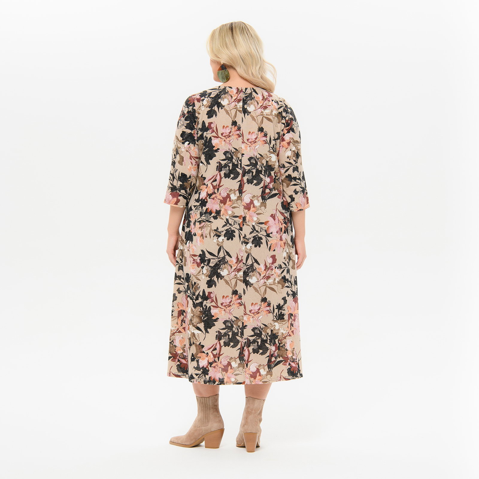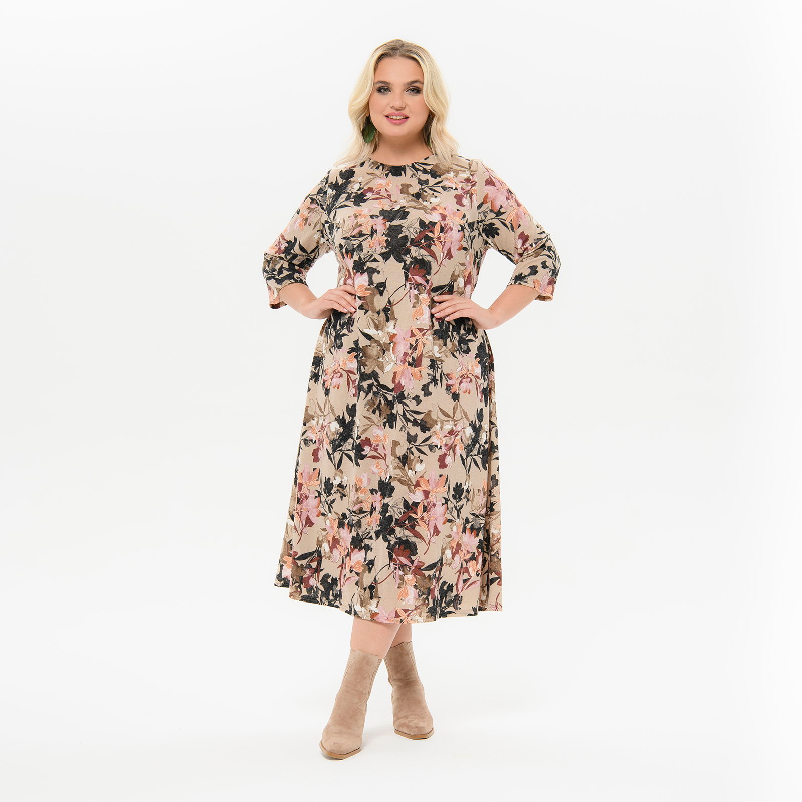 Платье миди, полуприлегающего силуэта, джерси-ангора бежевая, принт цветочный *