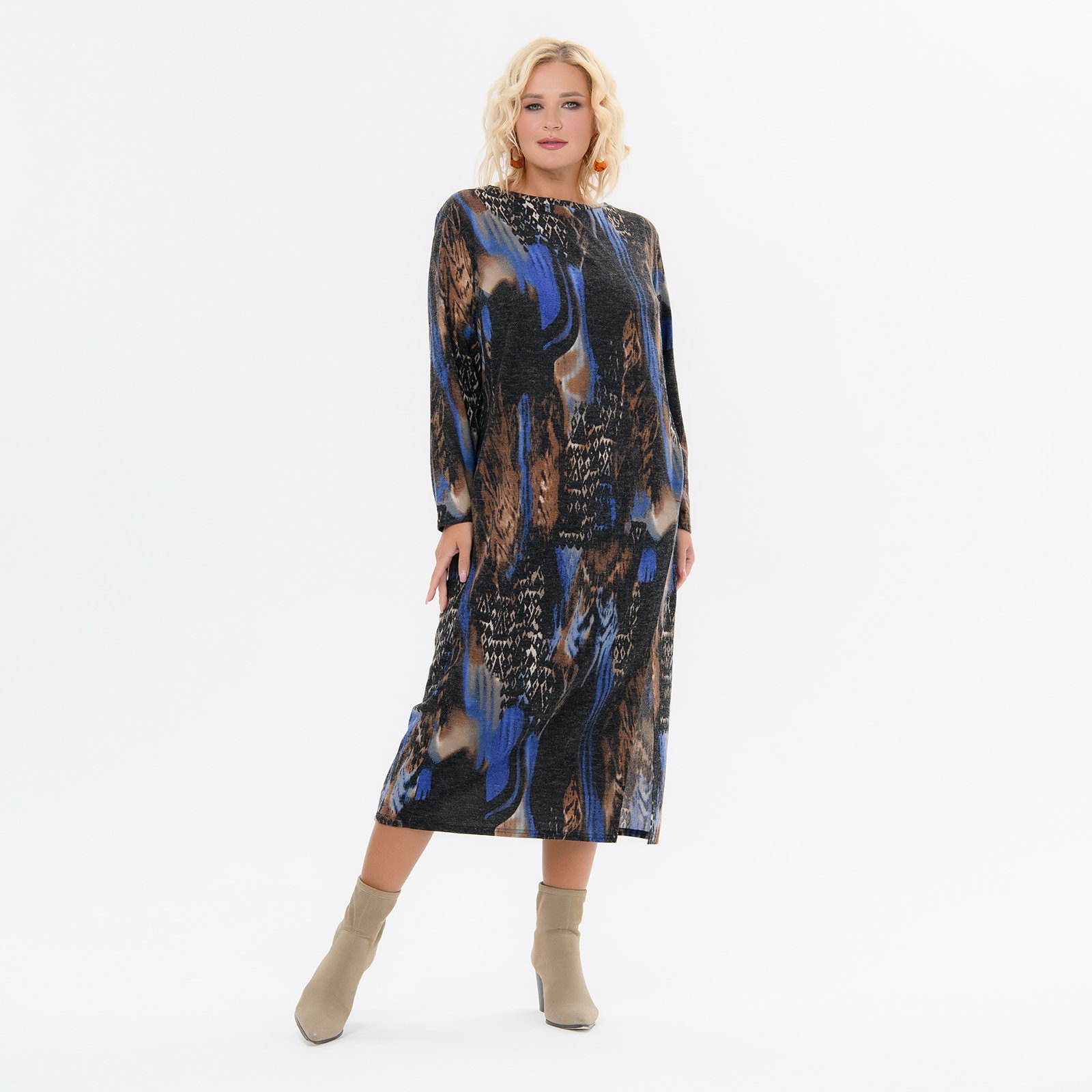 Платье силуэта"кокон" с длинным рукавом из джерси средней плотности, имитирующего ангору.