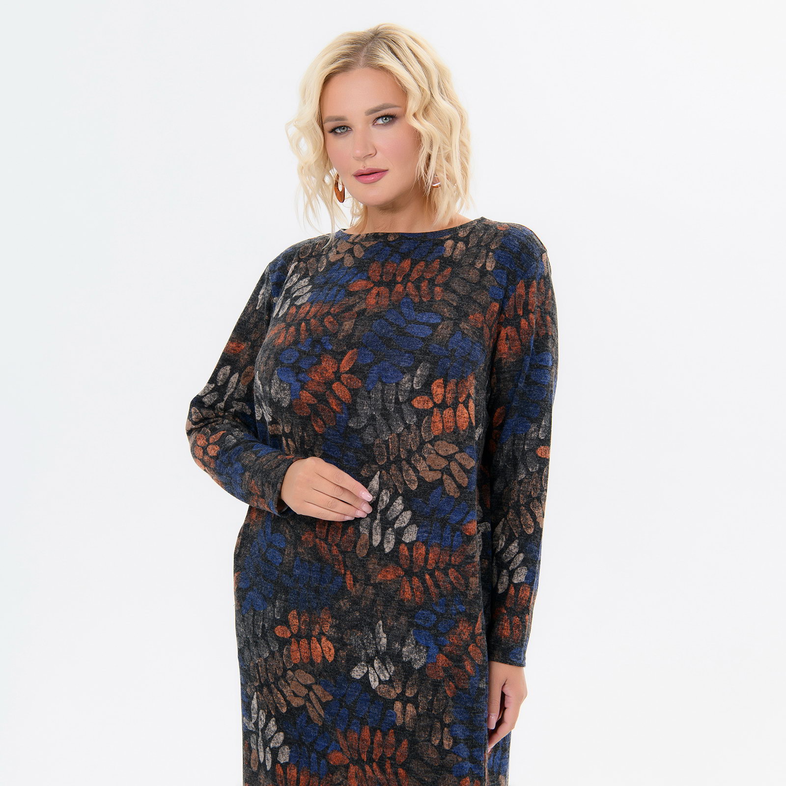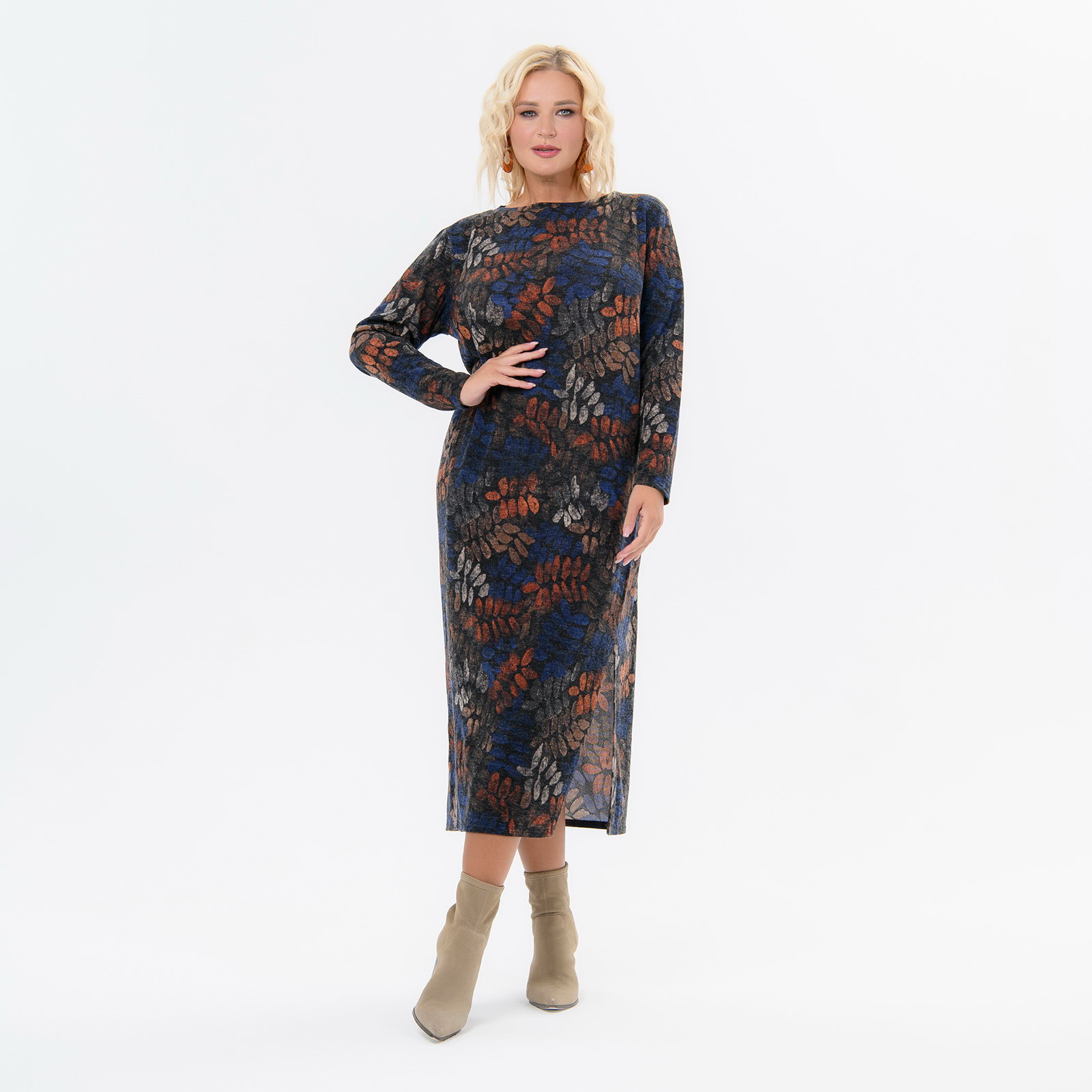 Платье миди с карманами и разрезом, силуэт "кокон", ангора, принт "краски осени"