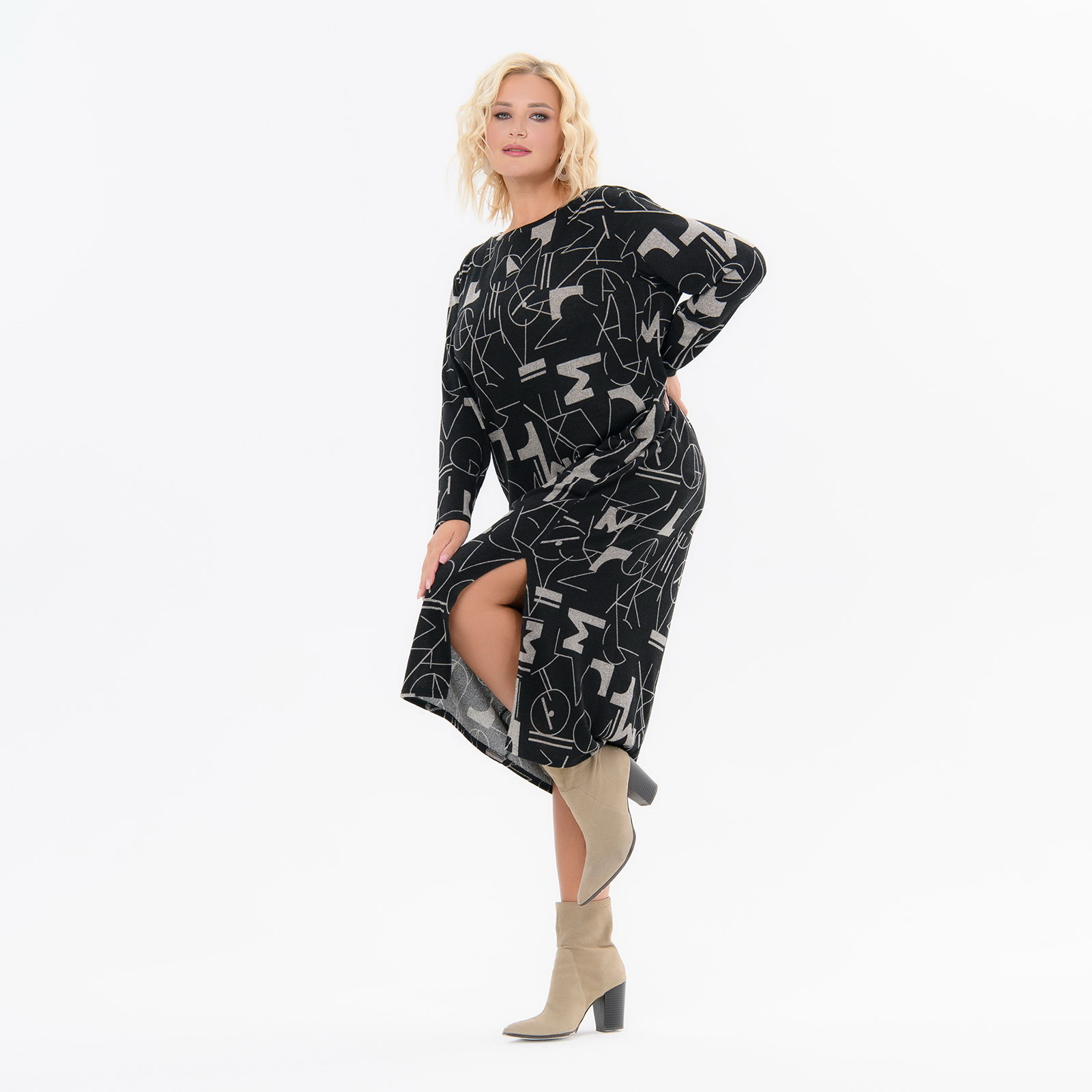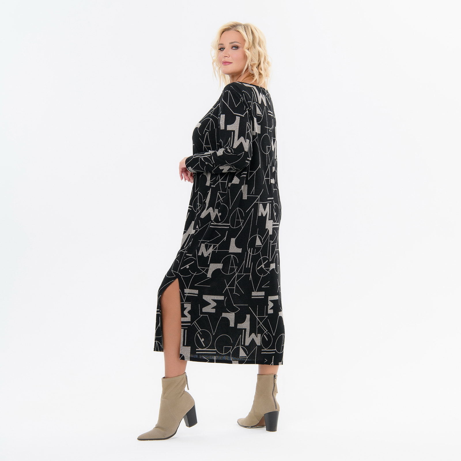 Платье миди с карманами и разрезом, силуэт "кокон", ангора, принт "символы"