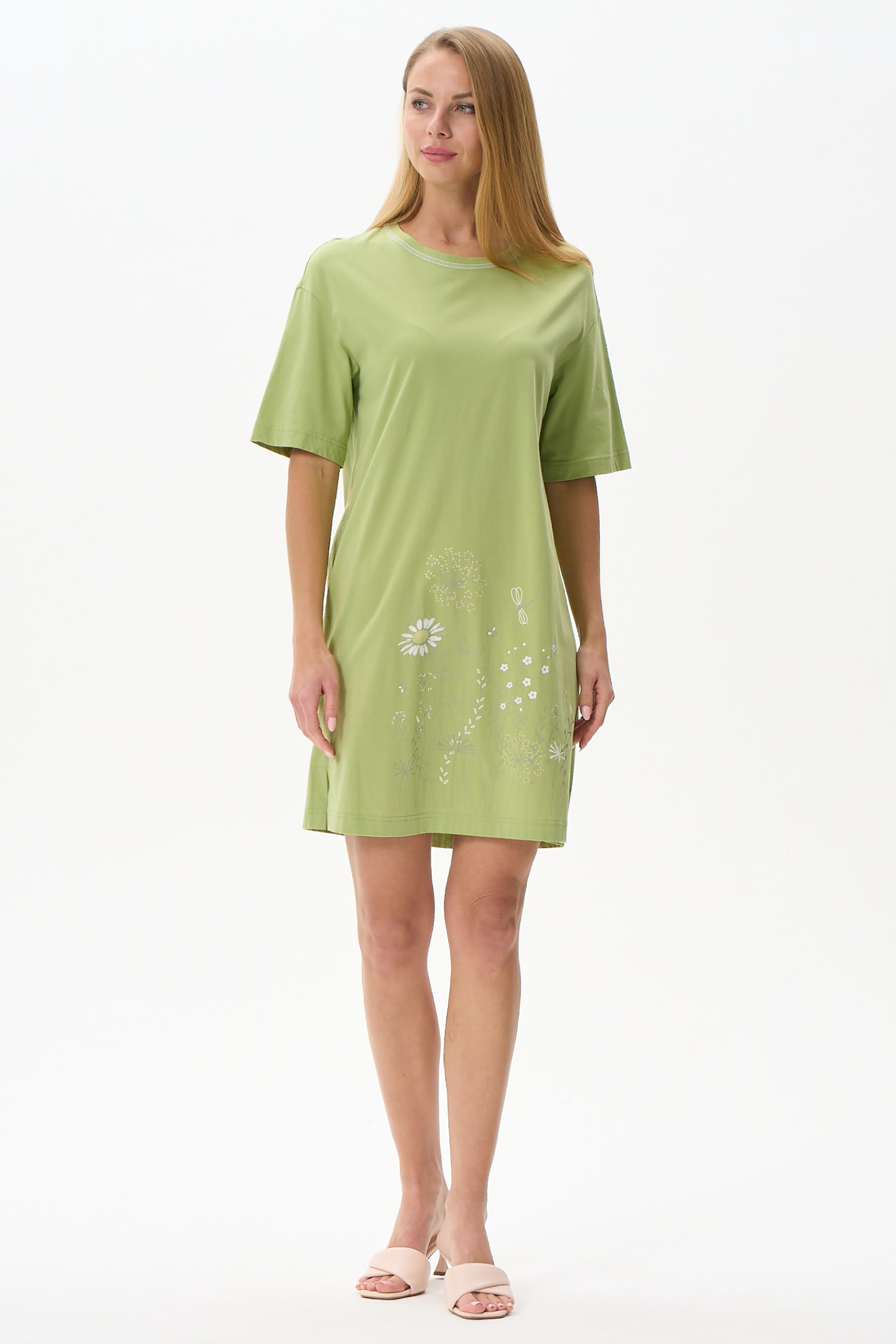 Платье из хлопкового полотна с принтом. Круглый вырез горловины, спущенная линия плеча, длина рукавов чуть ниже локтя, по низу изделия в боковых швах разрезы. Длина платья по колено. Рост модели на фото 175