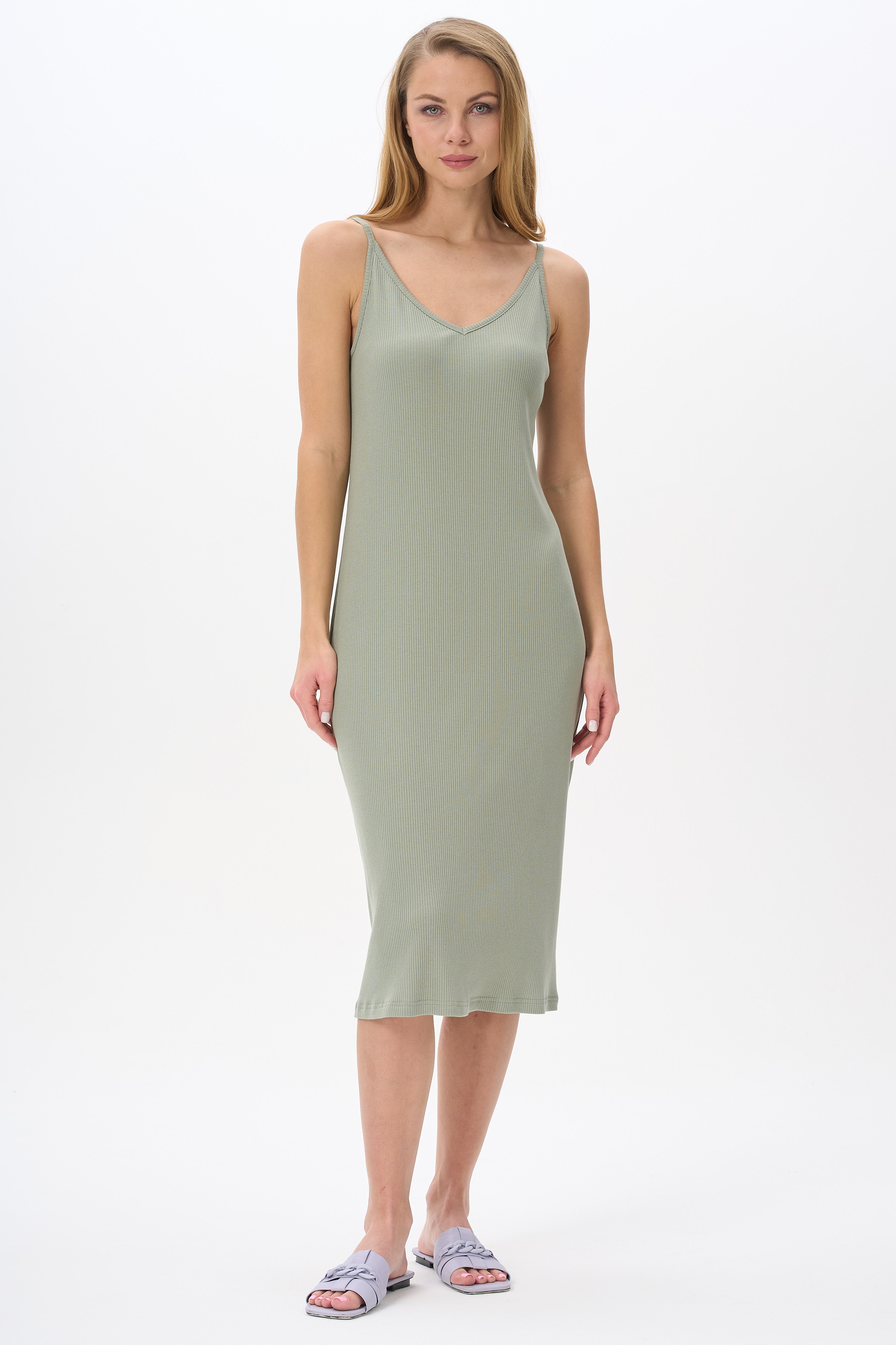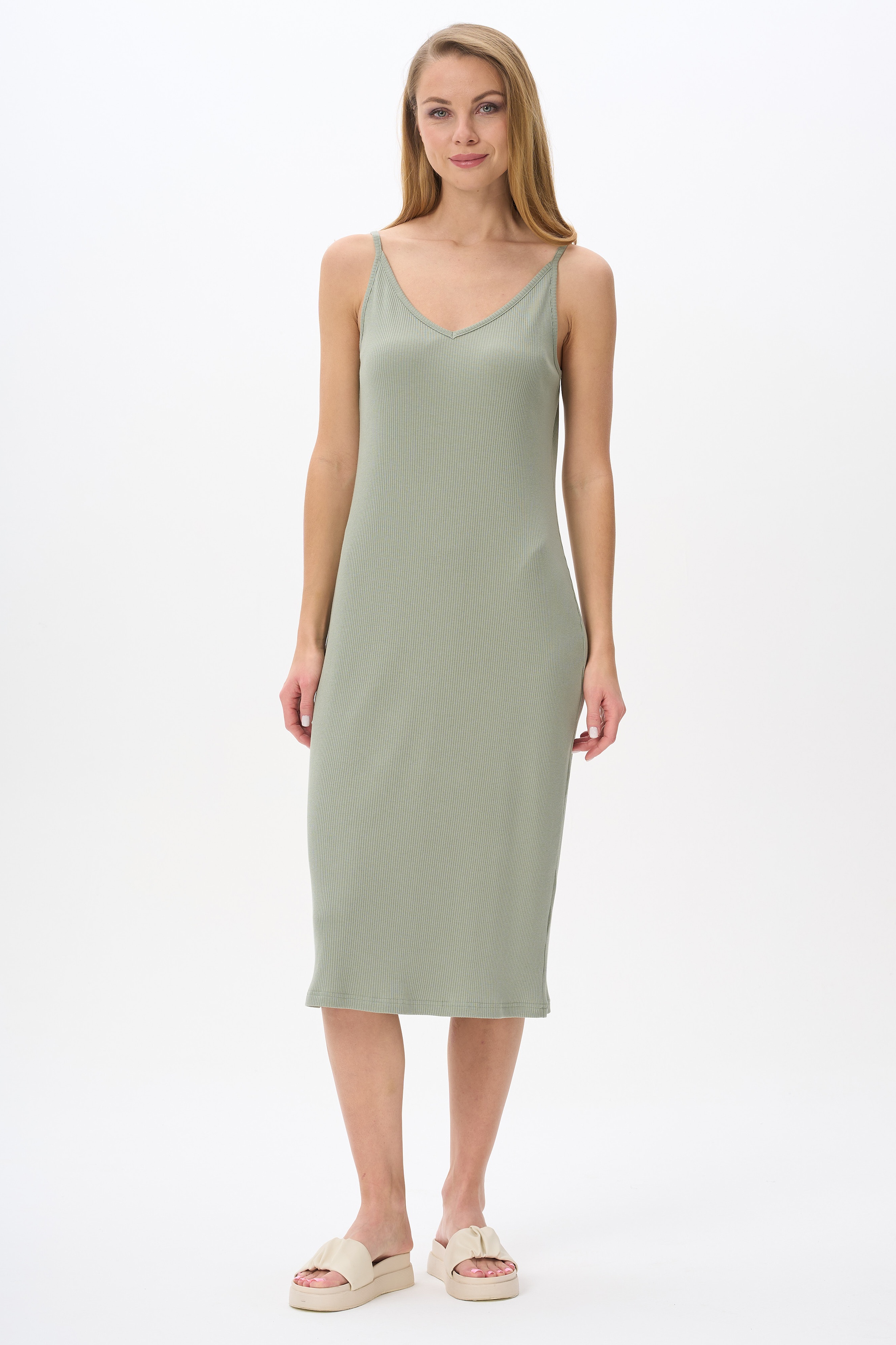 Платье прямого силуэта из фактурного хлопкового полотна с модалом. V-образный вырез горловины, длина изделия ниже колена. Рост модели на фото 170.