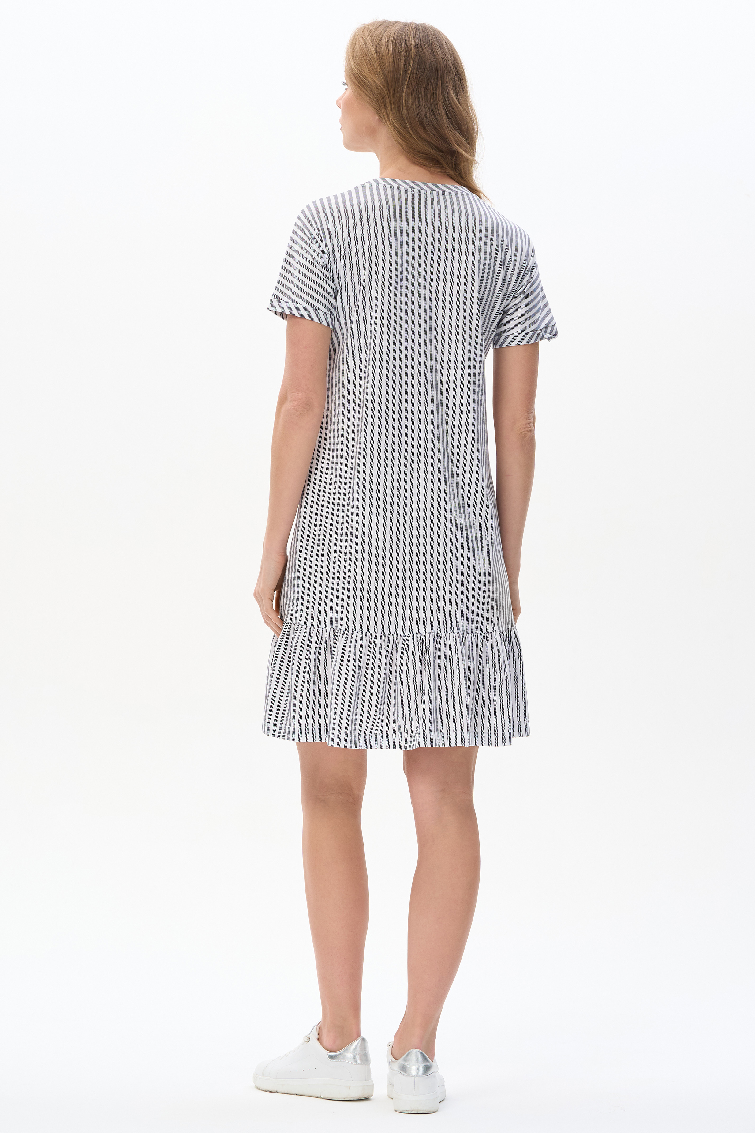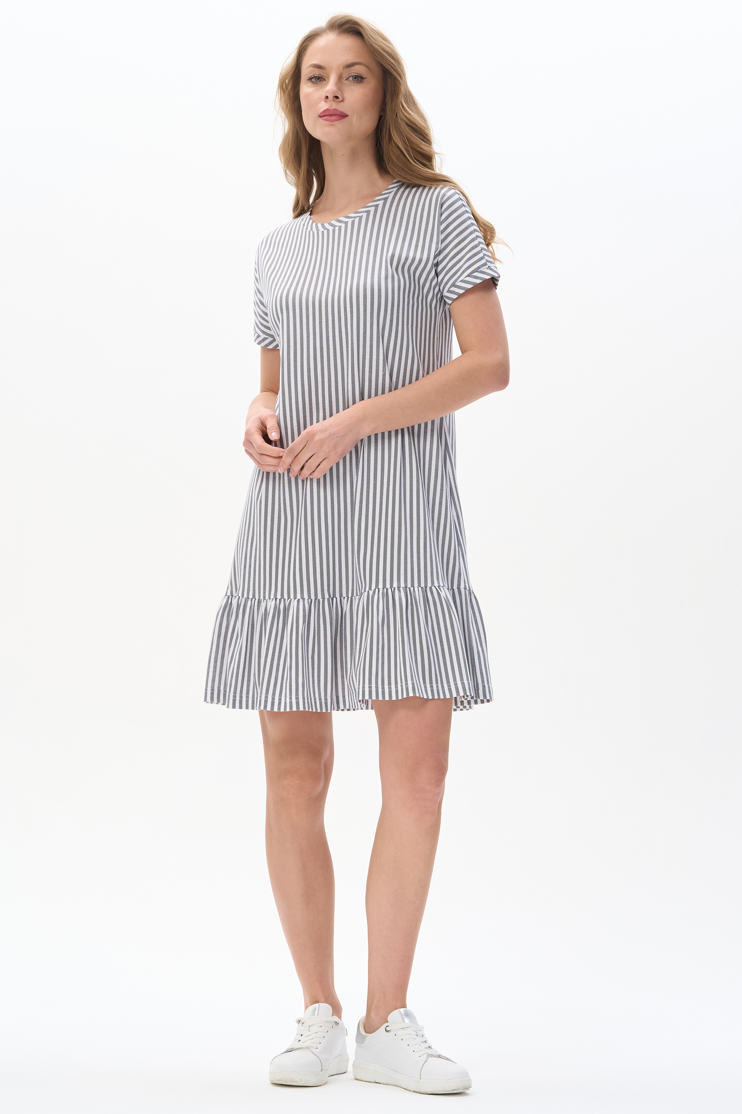 Лёгкое платье из кулирка качества ПЕ 150 гр рисунок - вертикальные диагональные полоски в оттенках Тёмный сапфир и Чистый белый. Круглый вырез горловины, спущенная линия плеча, цельнокроенные короткие рукава, по низу оборка, длина ниже колена. Эффектная полоска добавляет модели динамику и стиль. Идеальная модель для летнего сезона. Рост модели 175 см