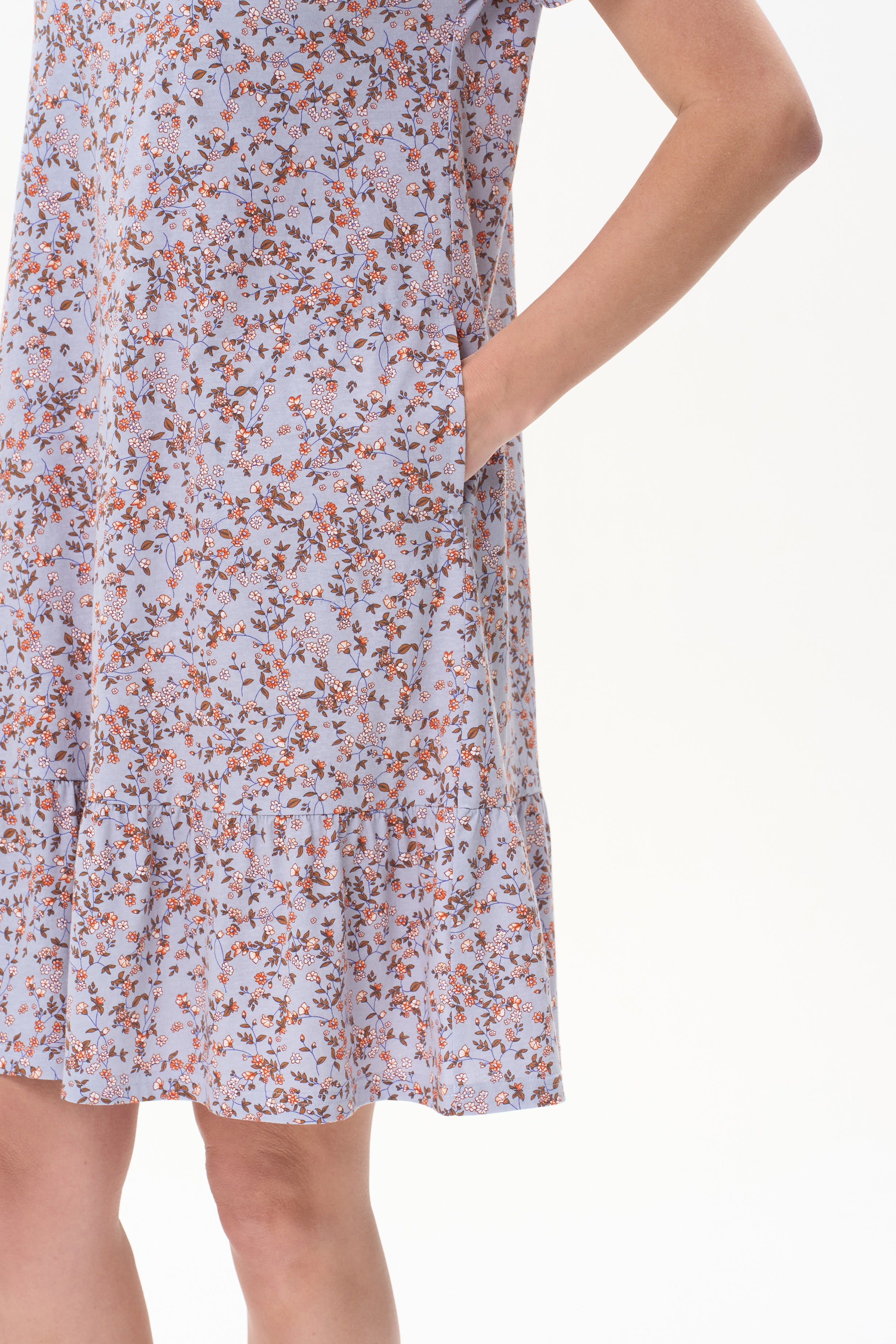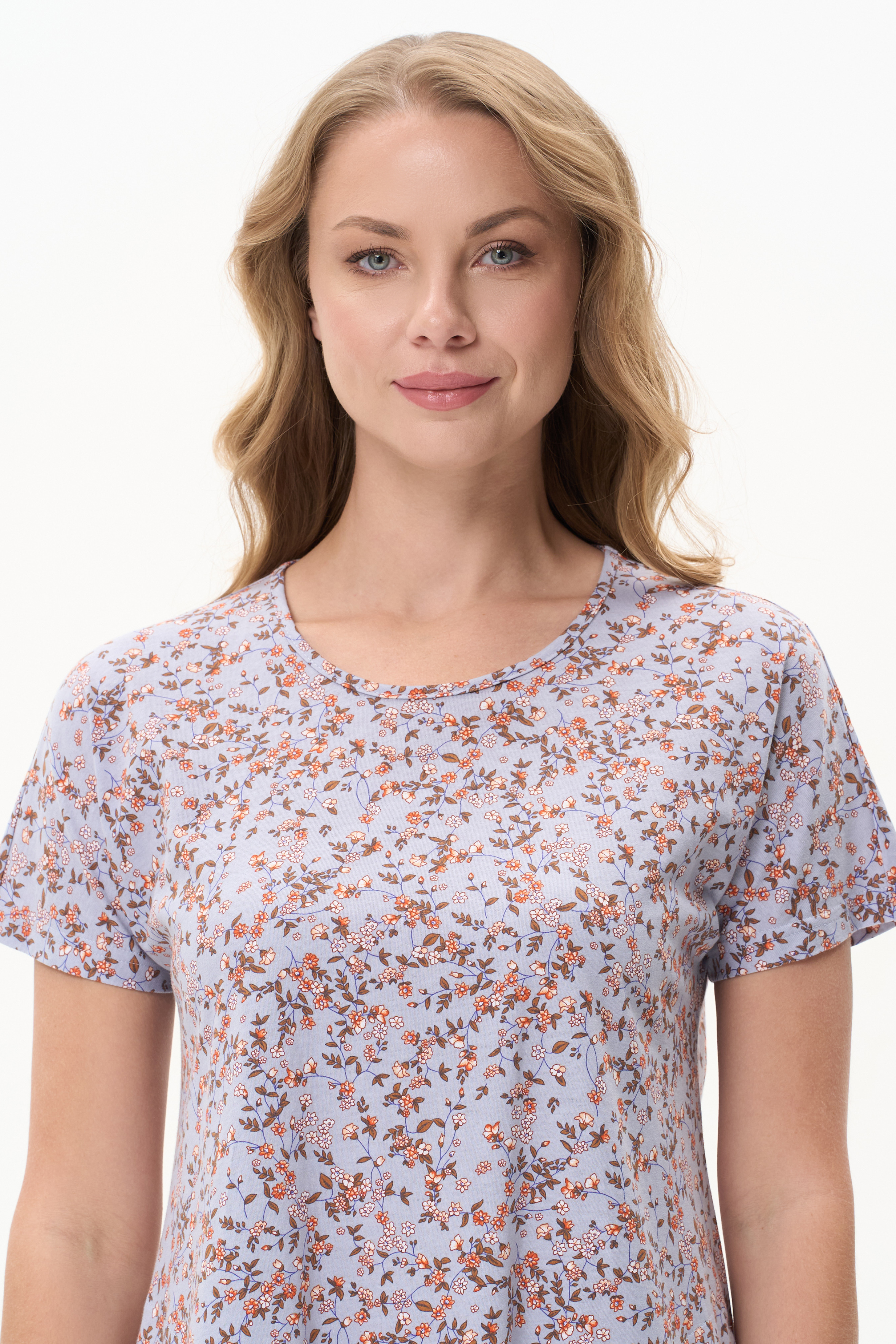 Платье А-образного силуэта, выполнено из хлопкового трикотажного полотна. Круглый вырез горловины, короткие втачные рукава. Длина изделия до колена. Рост модели 175 см.