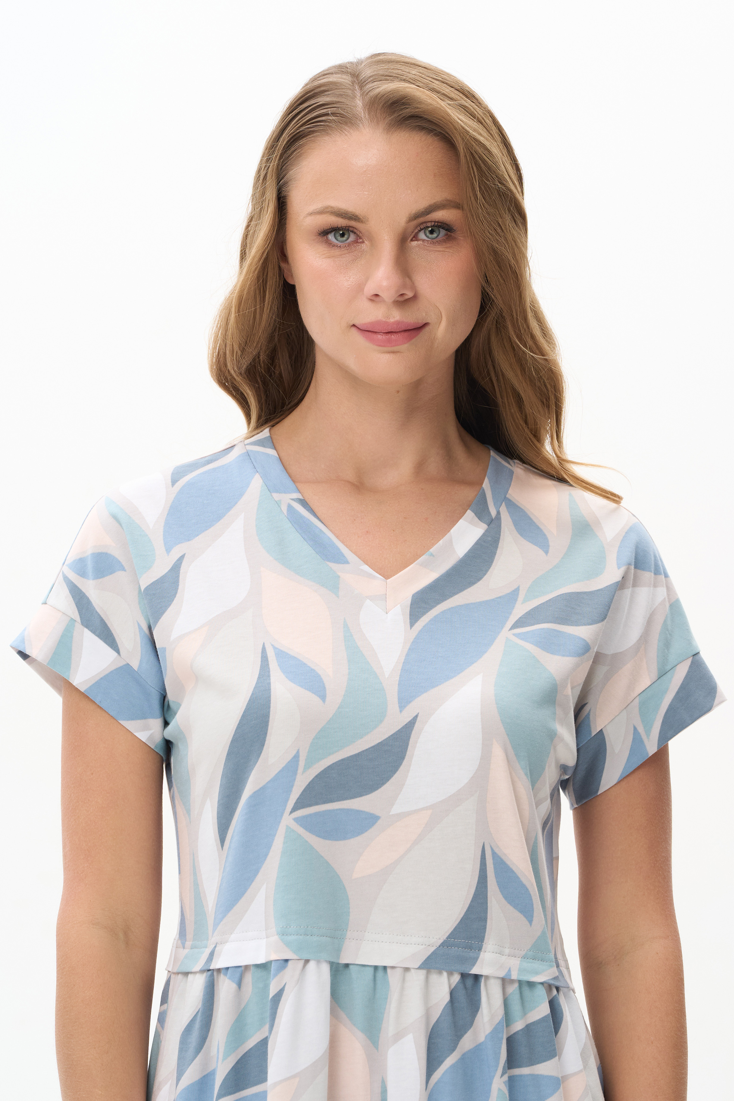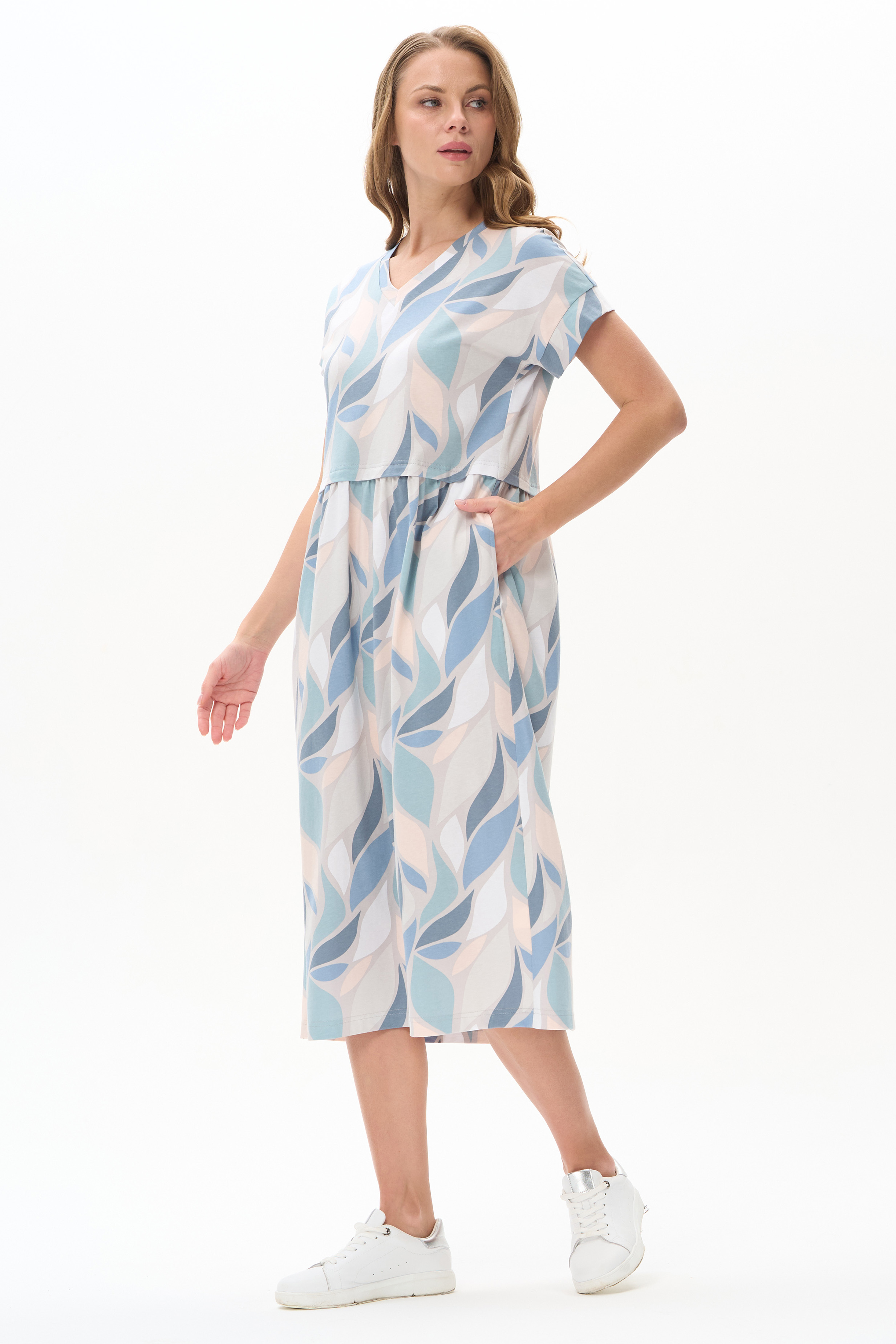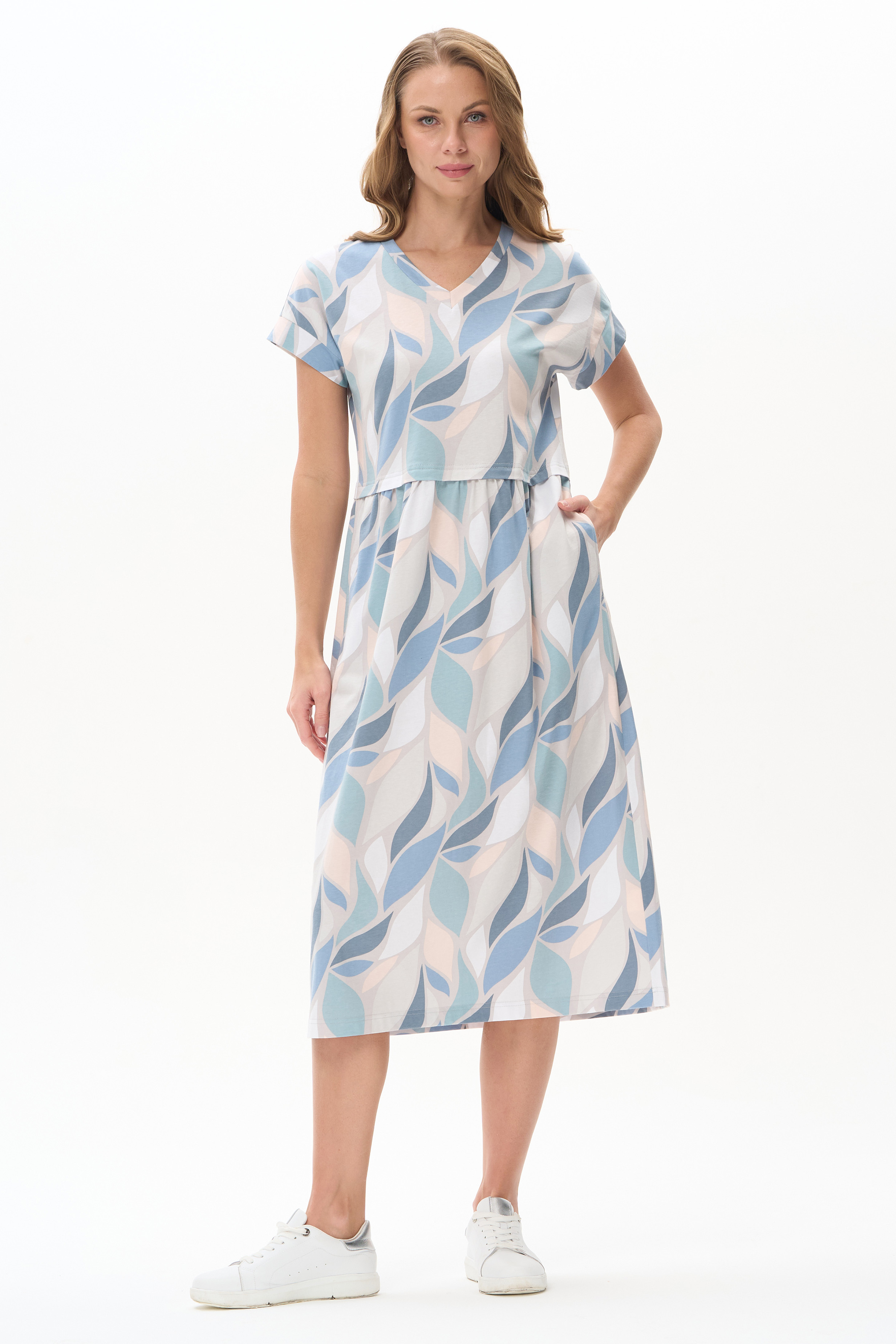 Платье трапецевидного силуэта из кулирки c дизайнерским рисунком - растительная абстракция. Подрез выше линии талии и V-образный вырез - конструктивные особенности этой модели. Спущенная линия плеча, цельнокроенные короткие рукава, в боковых швах карманы. Эффектная расцветка переводит платье в разряд повседневных и нарядных изделий. Рост модели 175 см