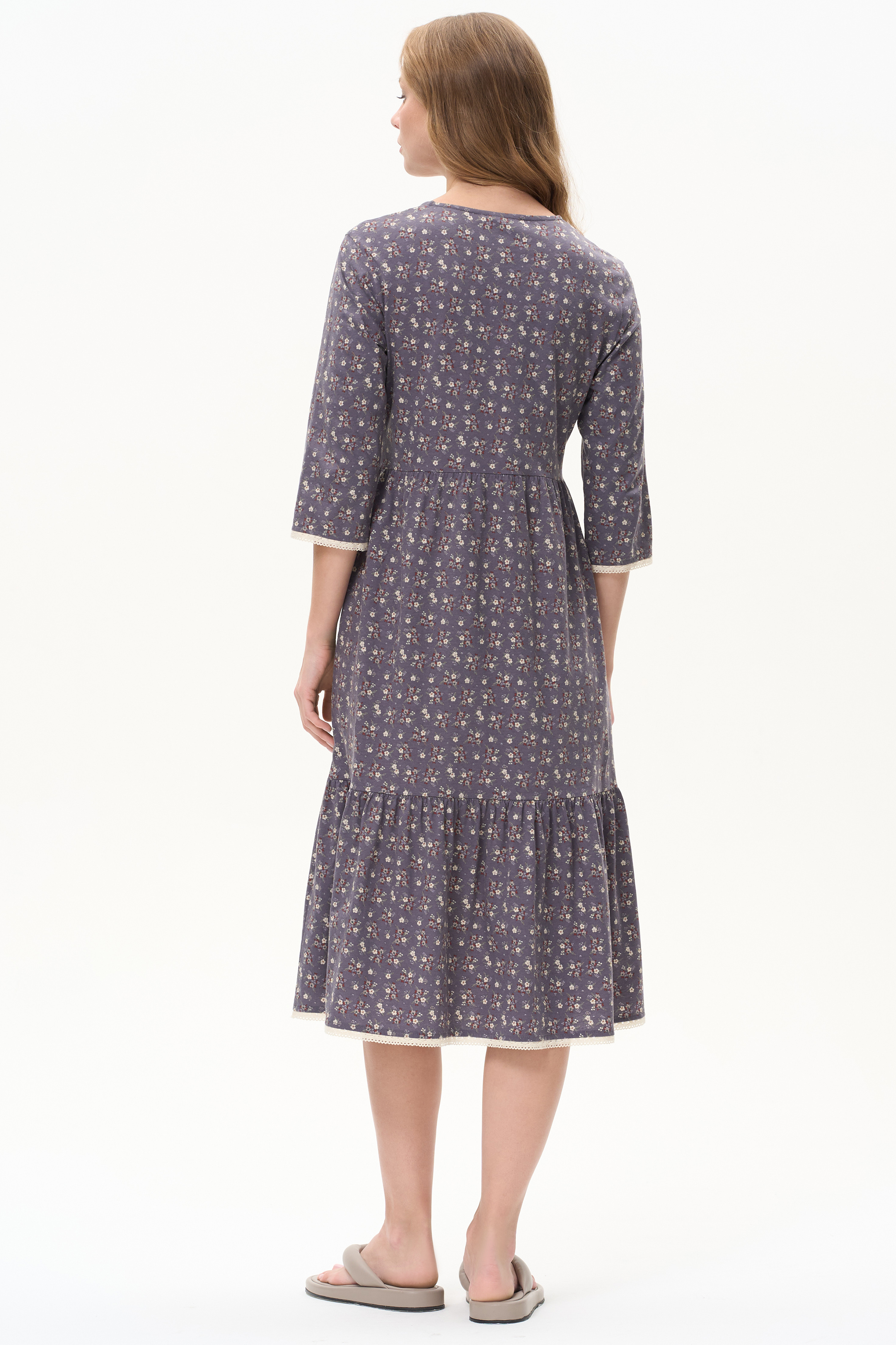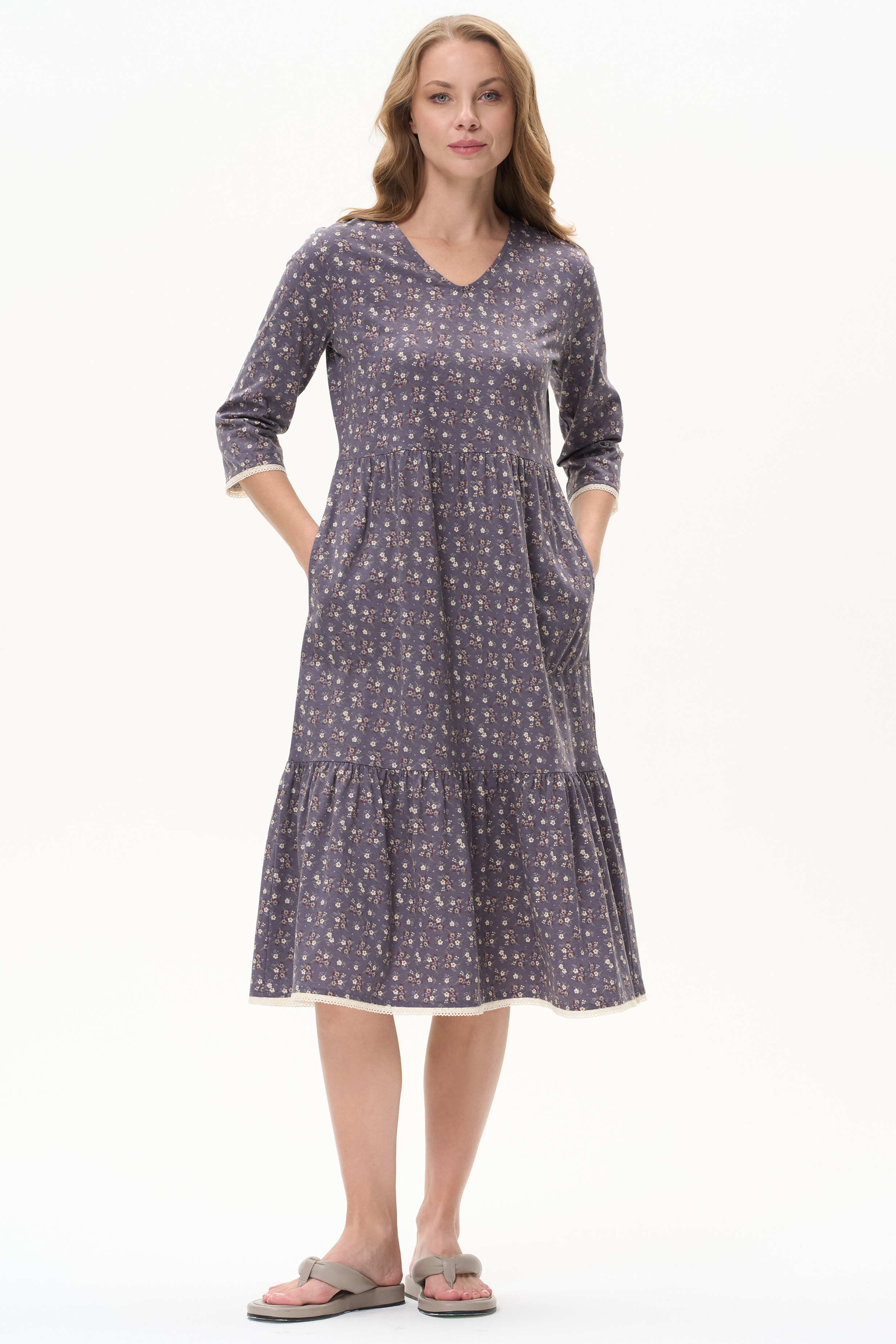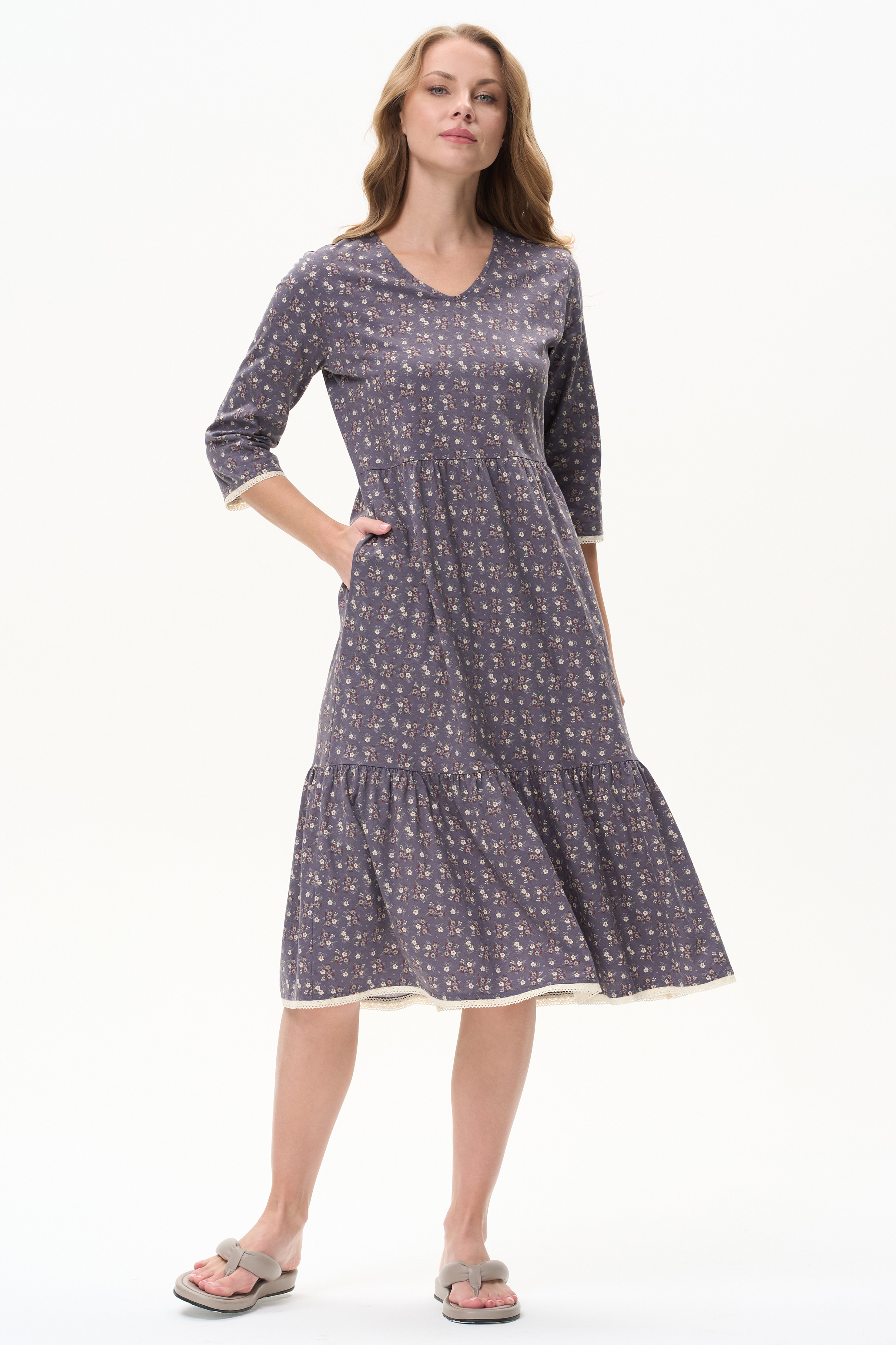 Платье расклешенного силуэта из хлопкового полотна. Вырез горловины V- образной формы, длина рукавов чуть ниже локтя, в боковых швах карманы. Длина изделия ниже колена. Отделка кружевом по низу изделия и рукавов. Рост модели 175 см.