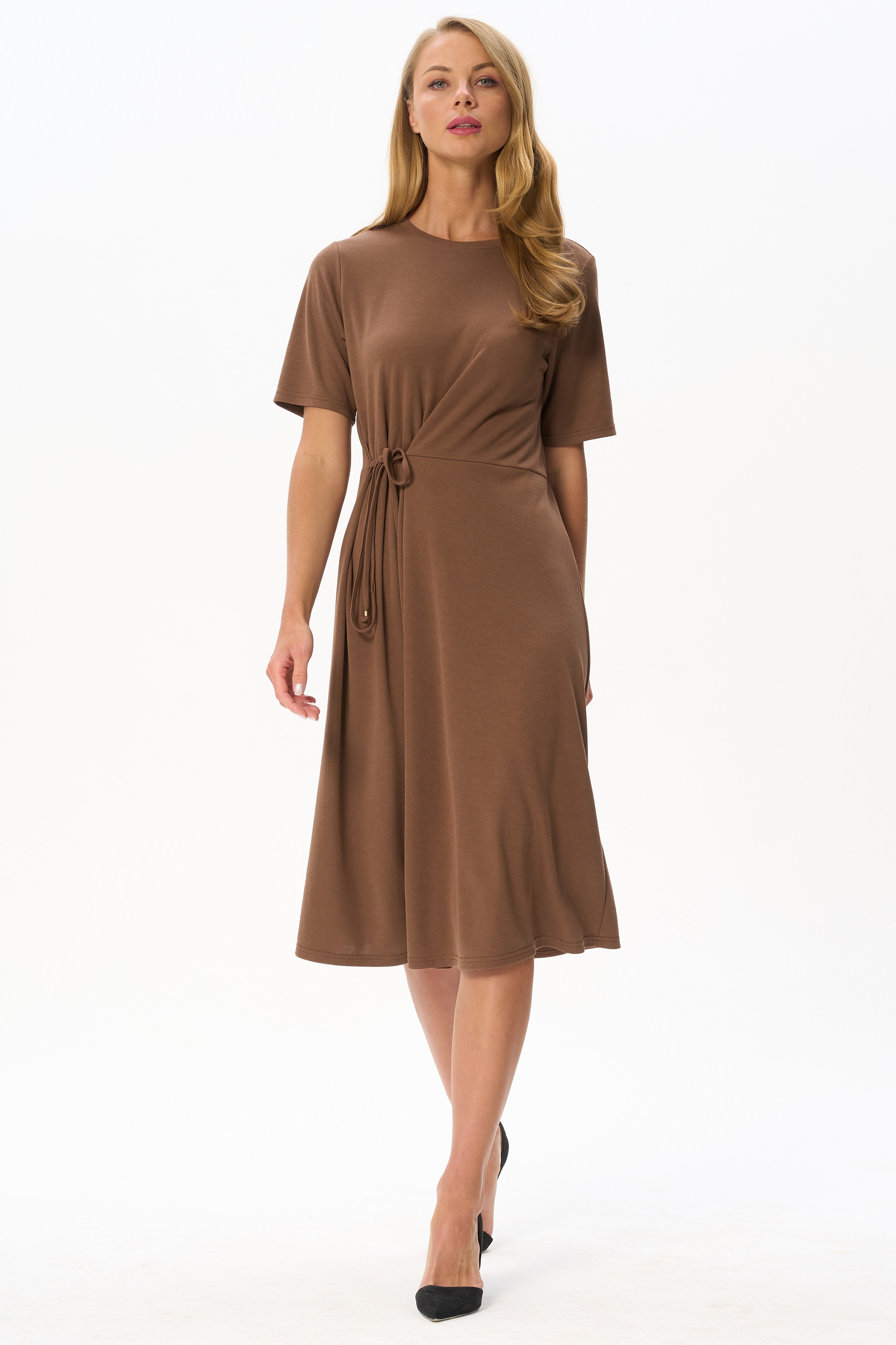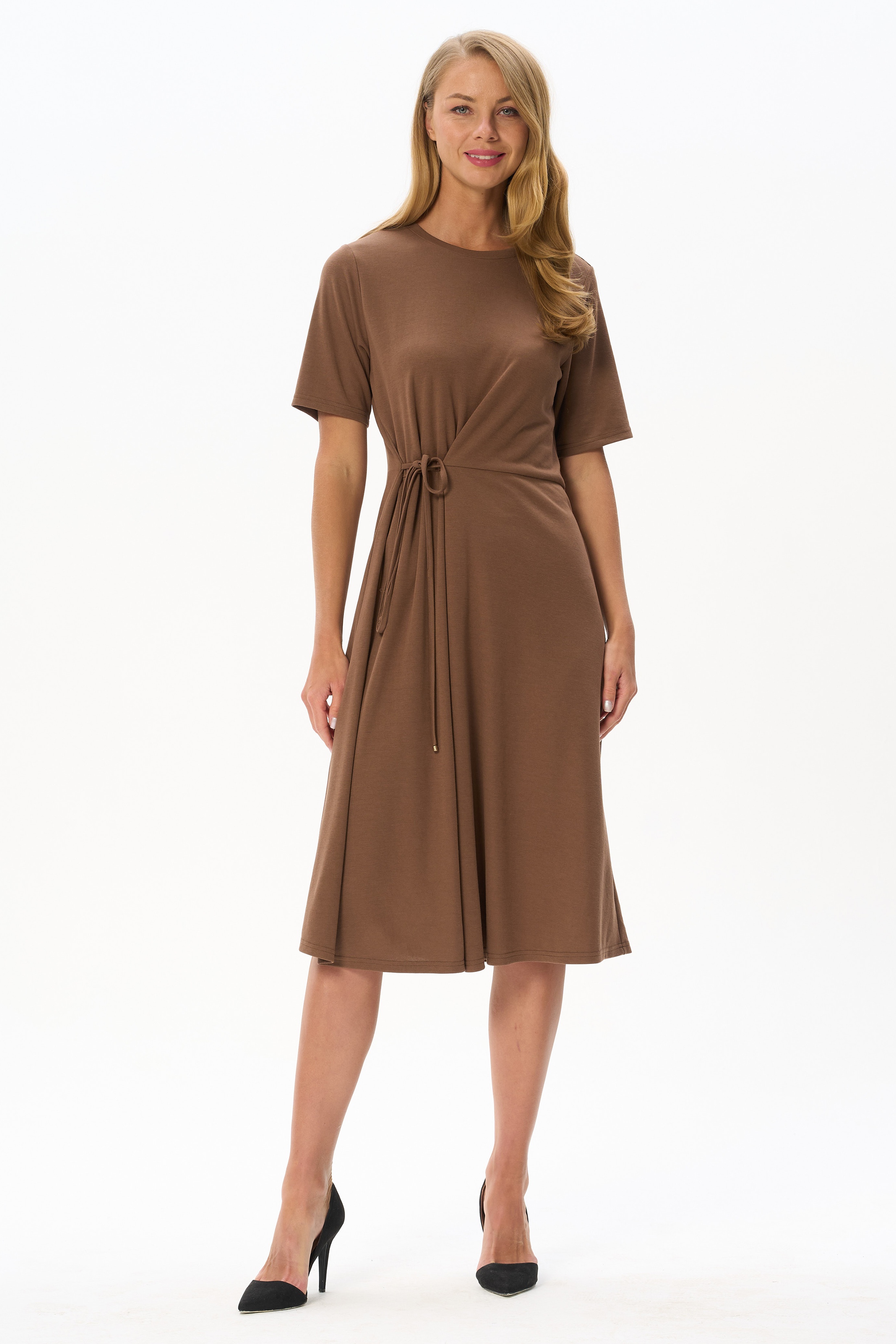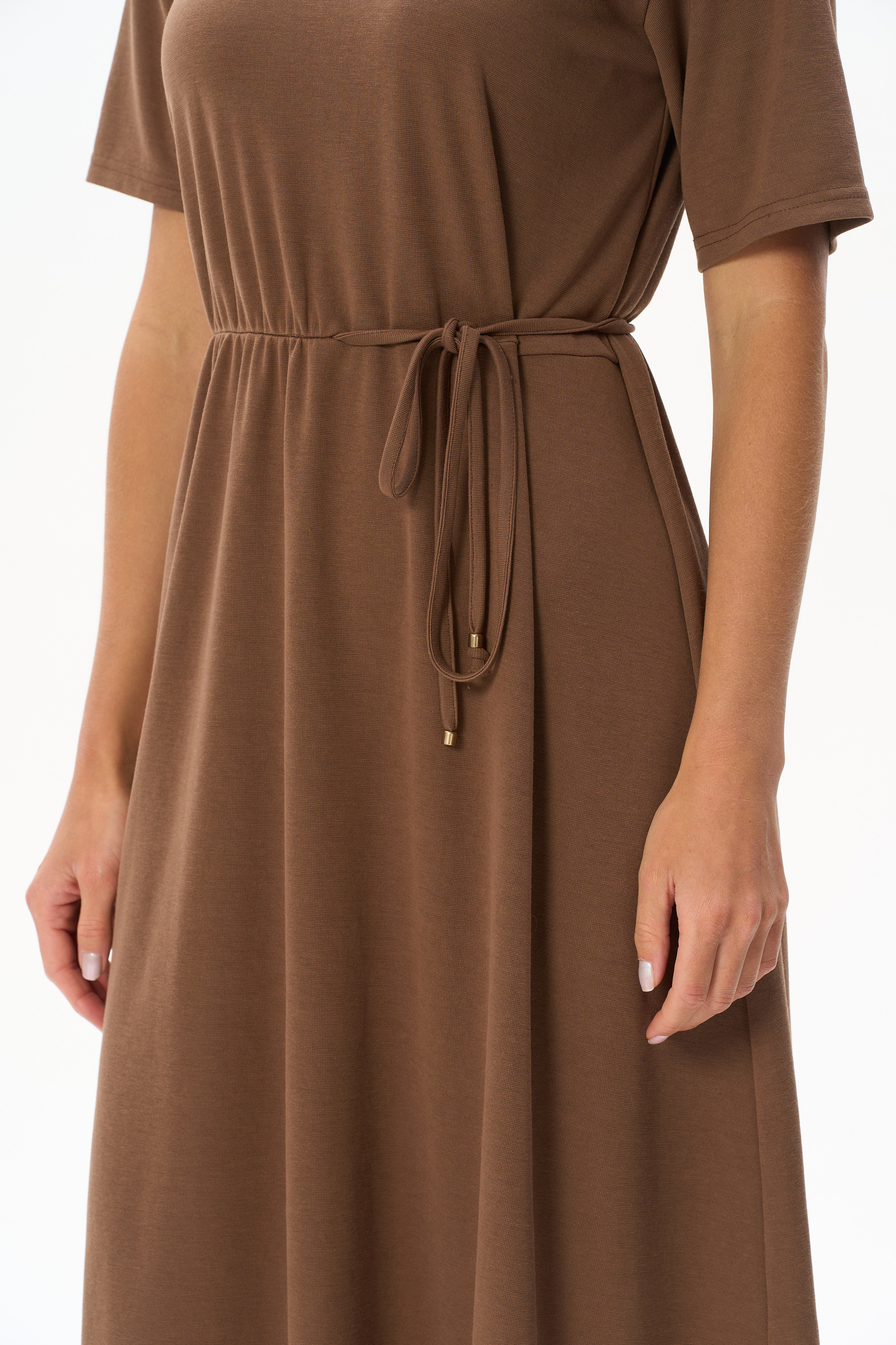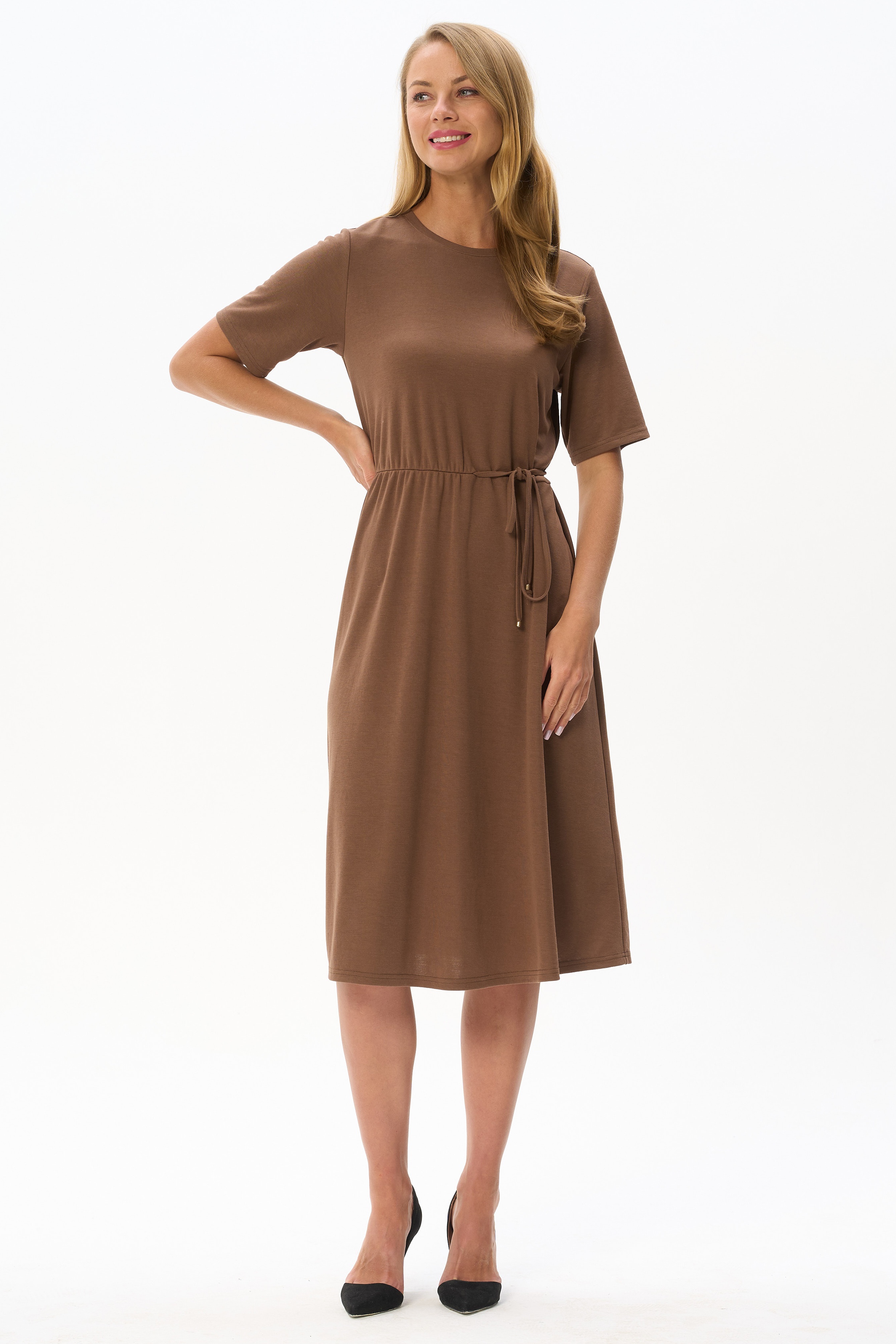 Платье из вискозного джерси, устойчивого к деформации. Модель с поясом, который дает возможность менять объем и силуэт. Круглый вырез горловины, короткие втачные рукава. Длина изделия ниже колена. Рост модели на фото 178см.
