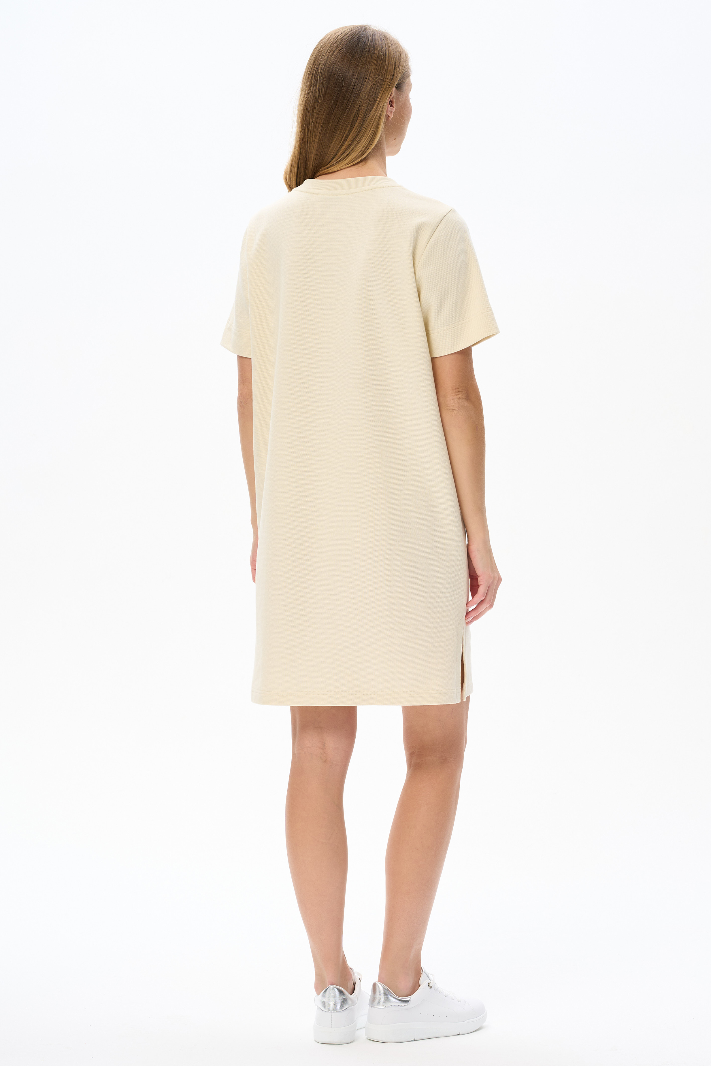 Платье прямого силуэта из хлопкового трикотажного полотна - пике, качества пенье. Круглый вырез горловины обработан хлопковым полотном кашкорсе, втачные короткие рукава. По низу изделия в боковом шве разрез. Рост модели 175 см.