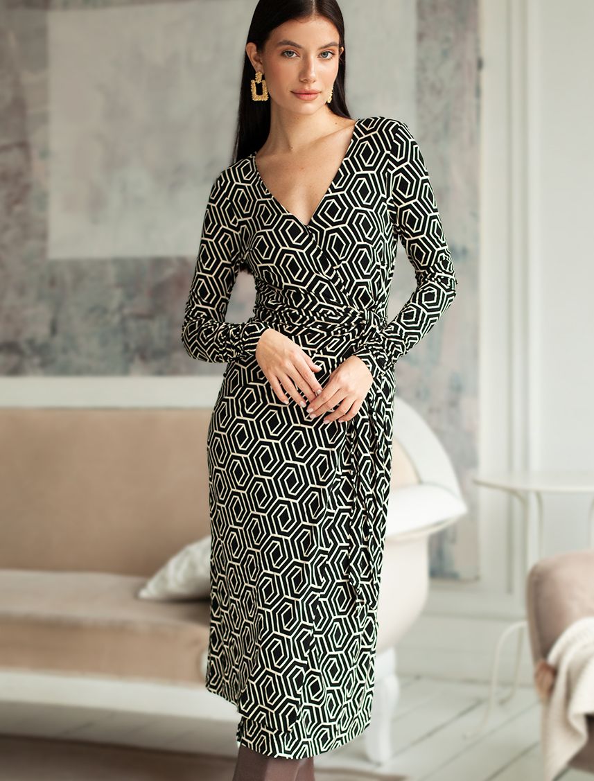 Платье на запАх сшито из трикотажной вискозы с эластаном. V-вырез с мини-копкой на борте с внутренней стороны для фиксации выреза декольте. Запах сходится и завязывается на боковой-пояс ленту. Модель подчеркивает достоинства и изгибы фигуры. А геометрический принт скрывает любые неровности. Роскошь и комфорт, одновременно подчеркивающие стиль, женственность и красоту. черный-бежевый