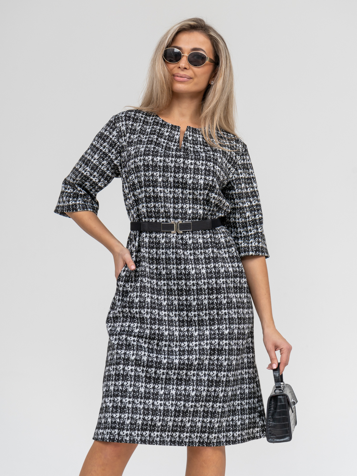 Платье выполнено из легкого и теплого футера-жаккарда, идеально подходящего для прохладных дней. Его стильный прямой крой сделает ваш образ неповторимым, а отделка горловины в виде галочки станет изюминкой вашего образа. Комфорт и удобство обеспечены благодаря свободному крою,, большим размерам, плотному материалу и оригинальной длине рукава. Платье также имеет 2 кармана.