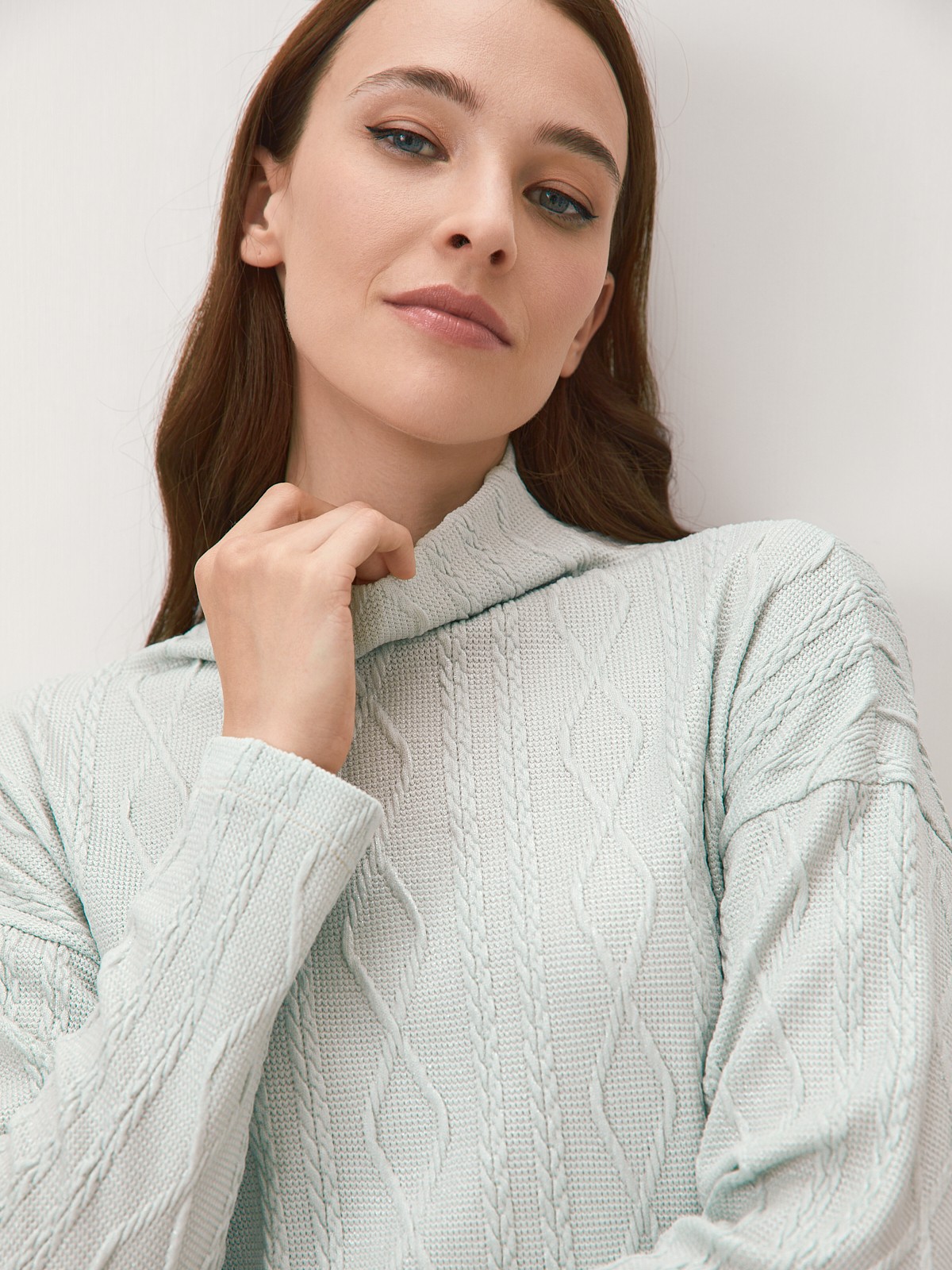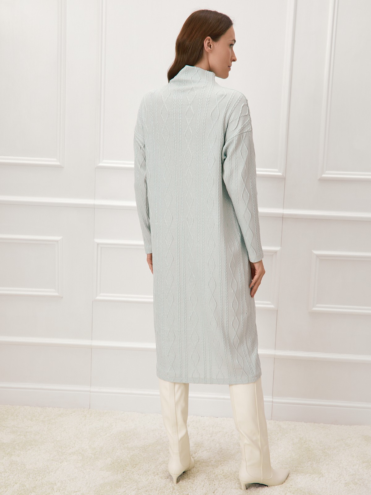 Трикотажное платье прямого силуэта, в мятном оттенке, выполнено из трикотажа с фактурой «косы», с легким мерцающим напылением на поверхности. Цельнокроеный воротник-стойка, спущенная линия плеч, низкая пройма и зауженные длинные рукава обеспечивают безупречную посадку на фигуре. Длина миди.