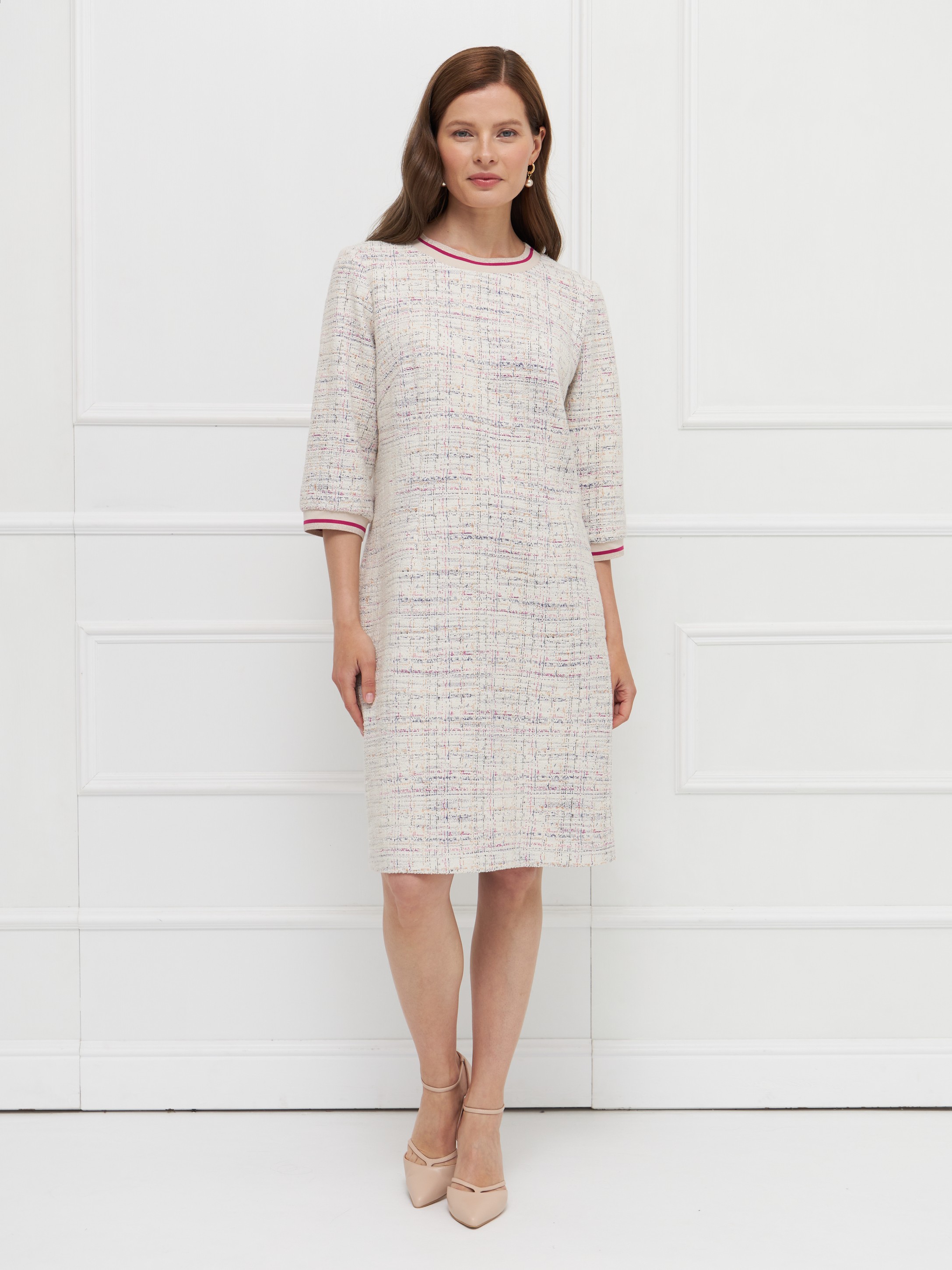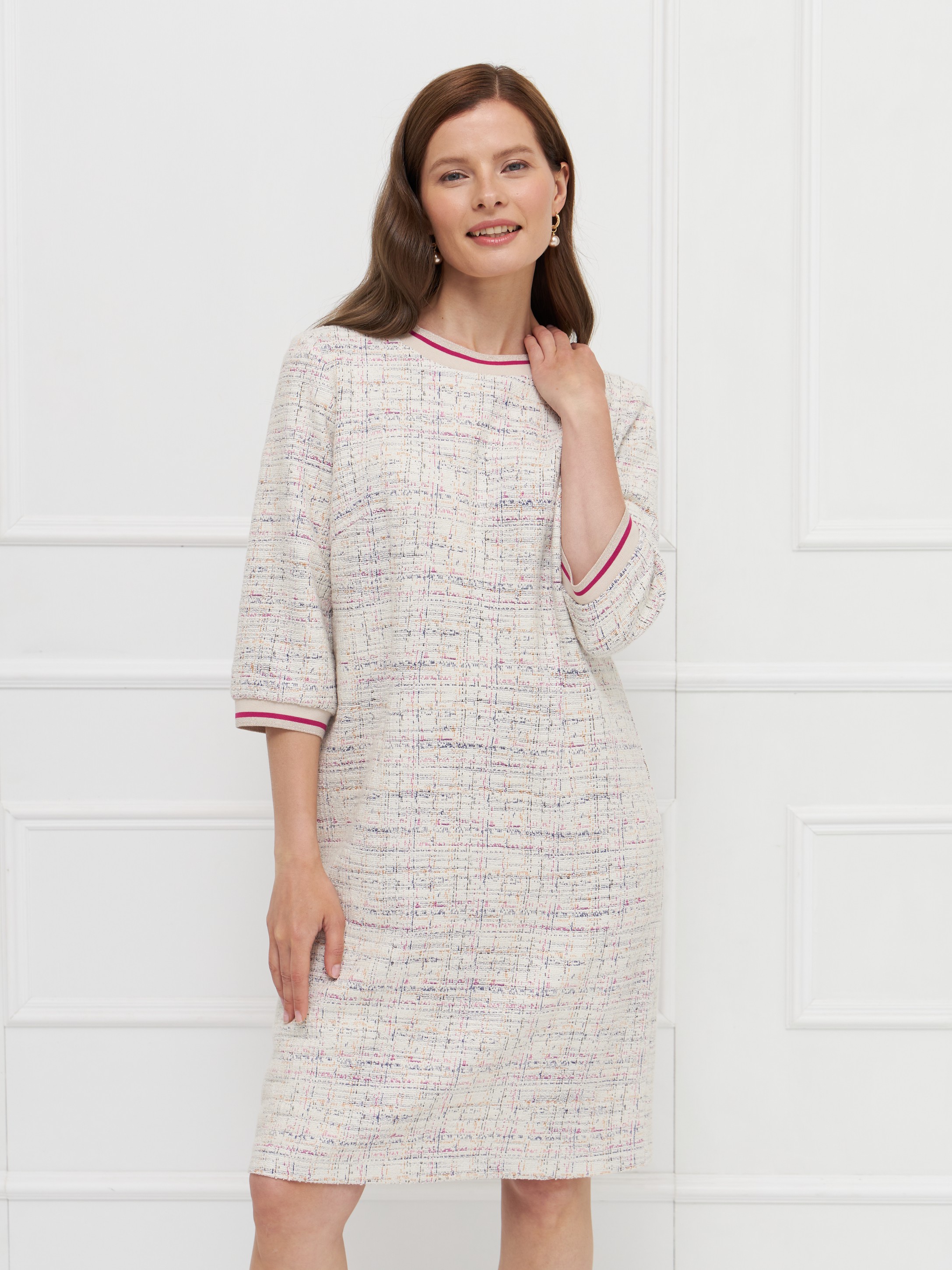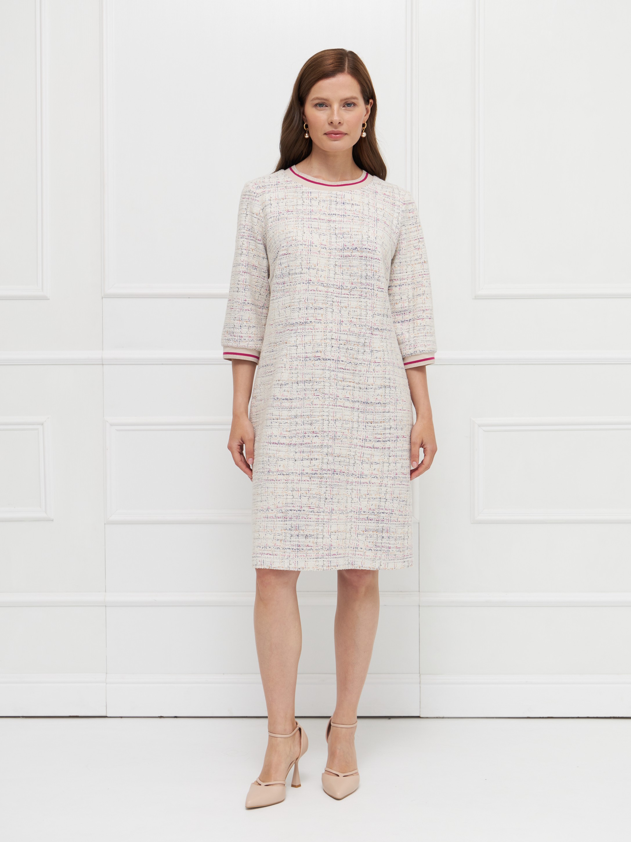 Платье выполнено из плотного трикотажа с твидовой структурой — материал не мнется и комфортно садится по фигуре. Прямой силуэт и длина до середины колена создают сдержанный, уравновешенный образ. На спинке предусмотрена шлица для свободы движений. Круглая горловина и рукава 3/4 украшены трикотажным подвязом, который выступает аккуратным декоративным акцентом. Эта модель сочетает функциональность с элегантной отделкой и подходит как для офиса, так и для деловых встреч.