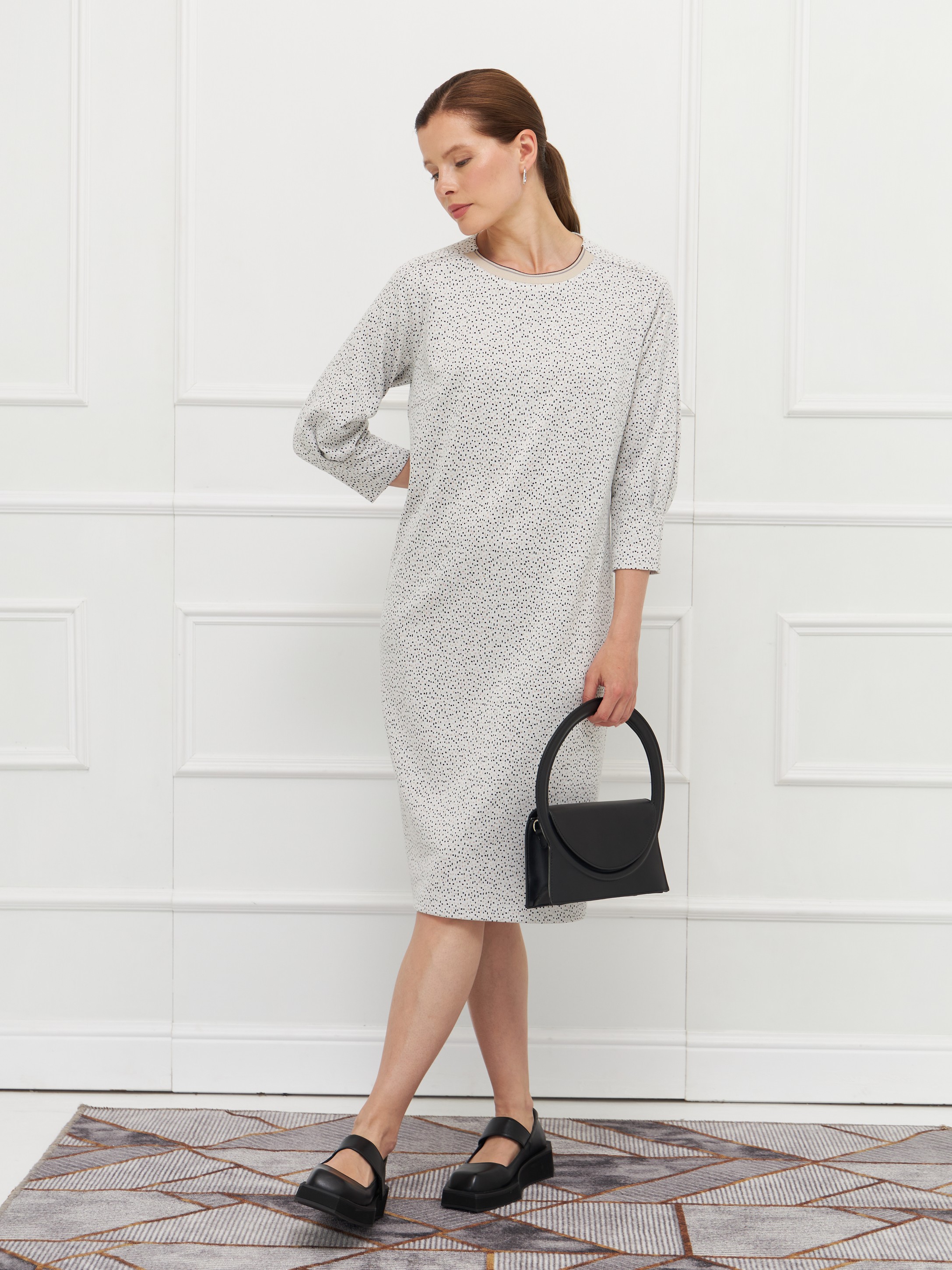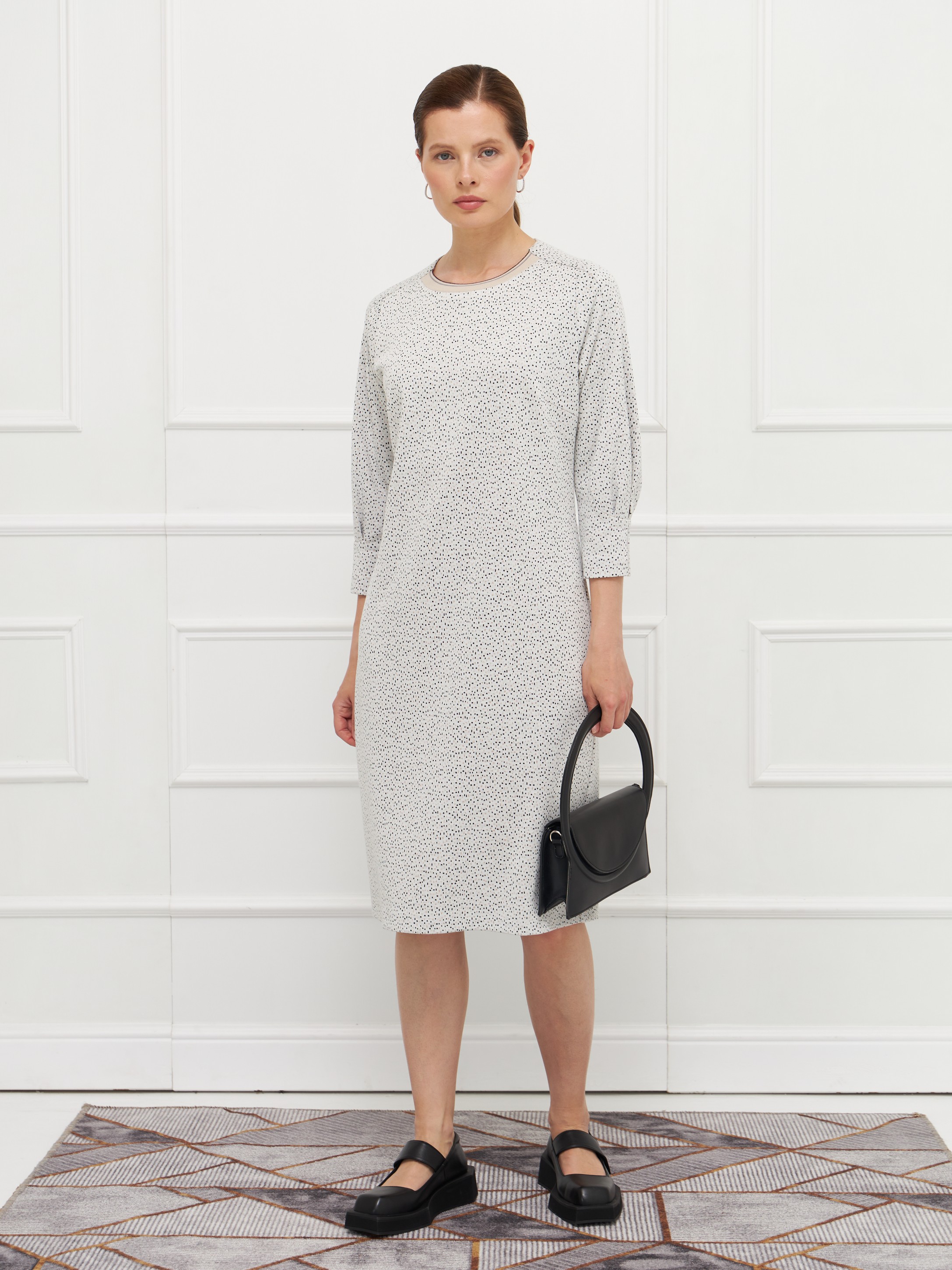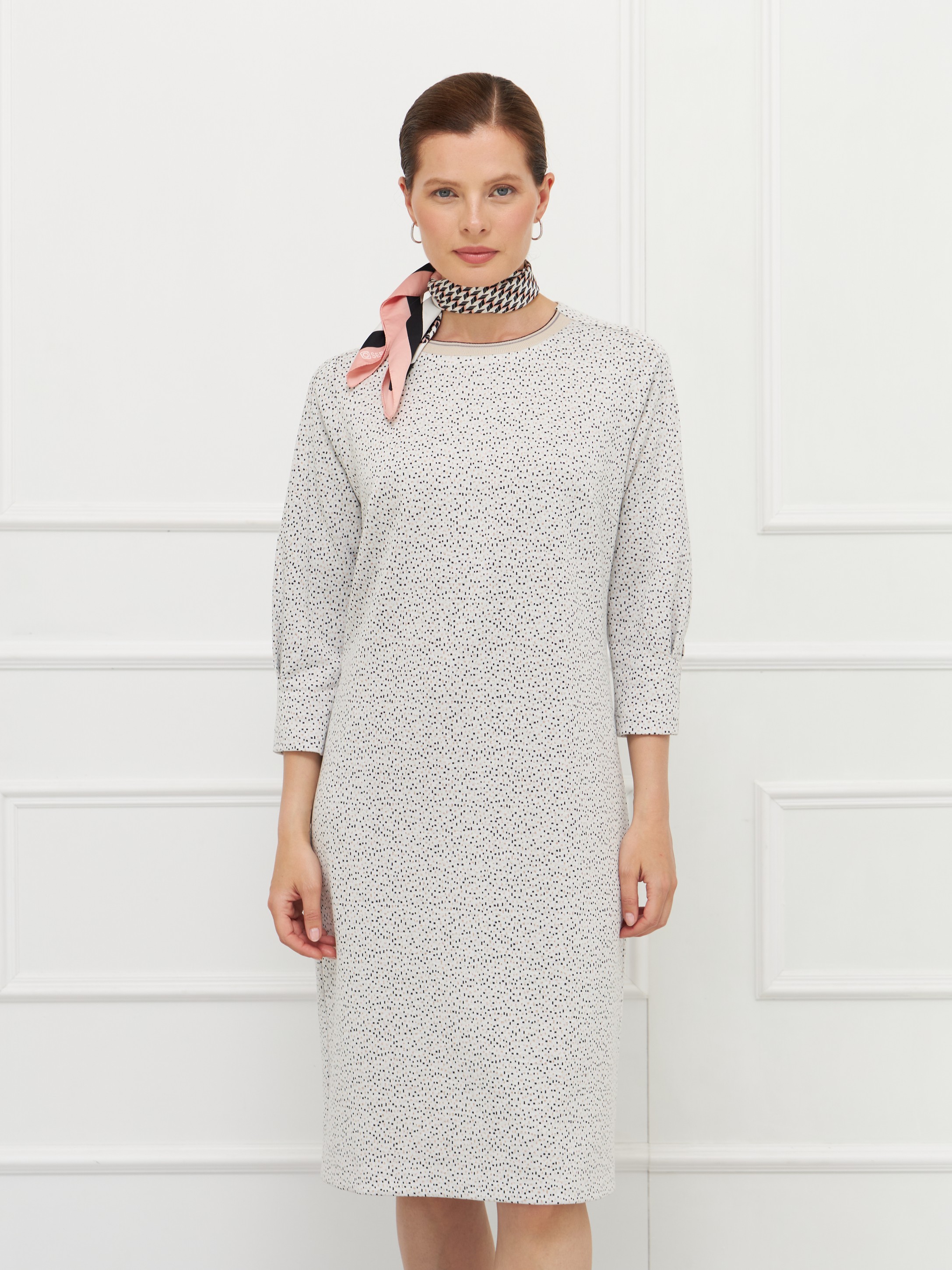 Платье полуприлегающего силуэта выполнено из мягкого трикотажа с мелким принтом — материал приятен к телу и обеспечивает комфорт в течение дня. Горловина оформлена вязаной вставкой, которая добавляет фактурный акцент. Рукава-реглан длиной 3/4 украшены аккуратными складками и собраны на манжеты. Прямой крой мягко подчеркивает фигуру, не сковывая движений. Сзади предусмотрена шлица для свободы шага. Длина до середины колена делает платье универсальным и подходящим как для офиса, так и для неформальных повседневных образов.