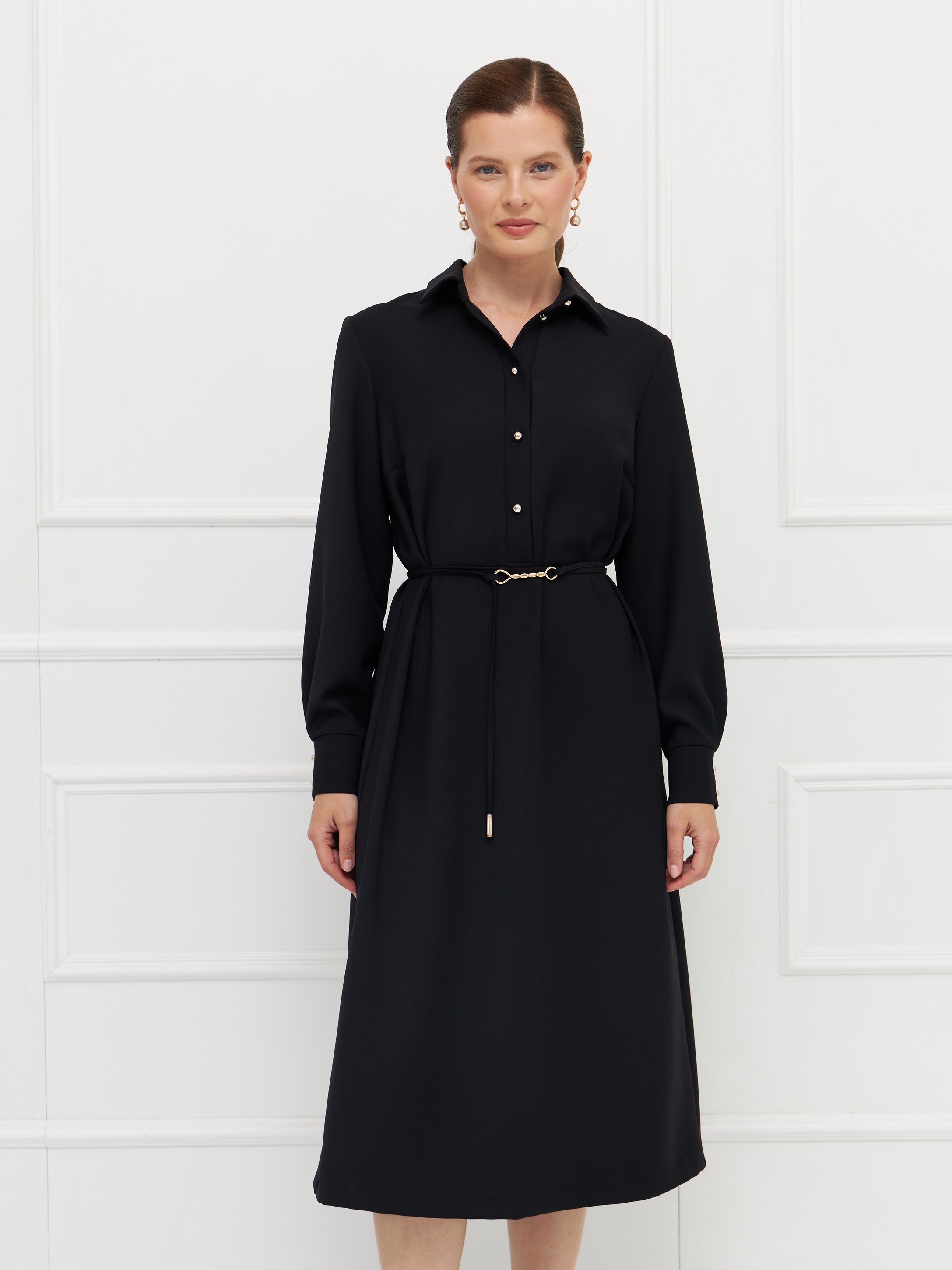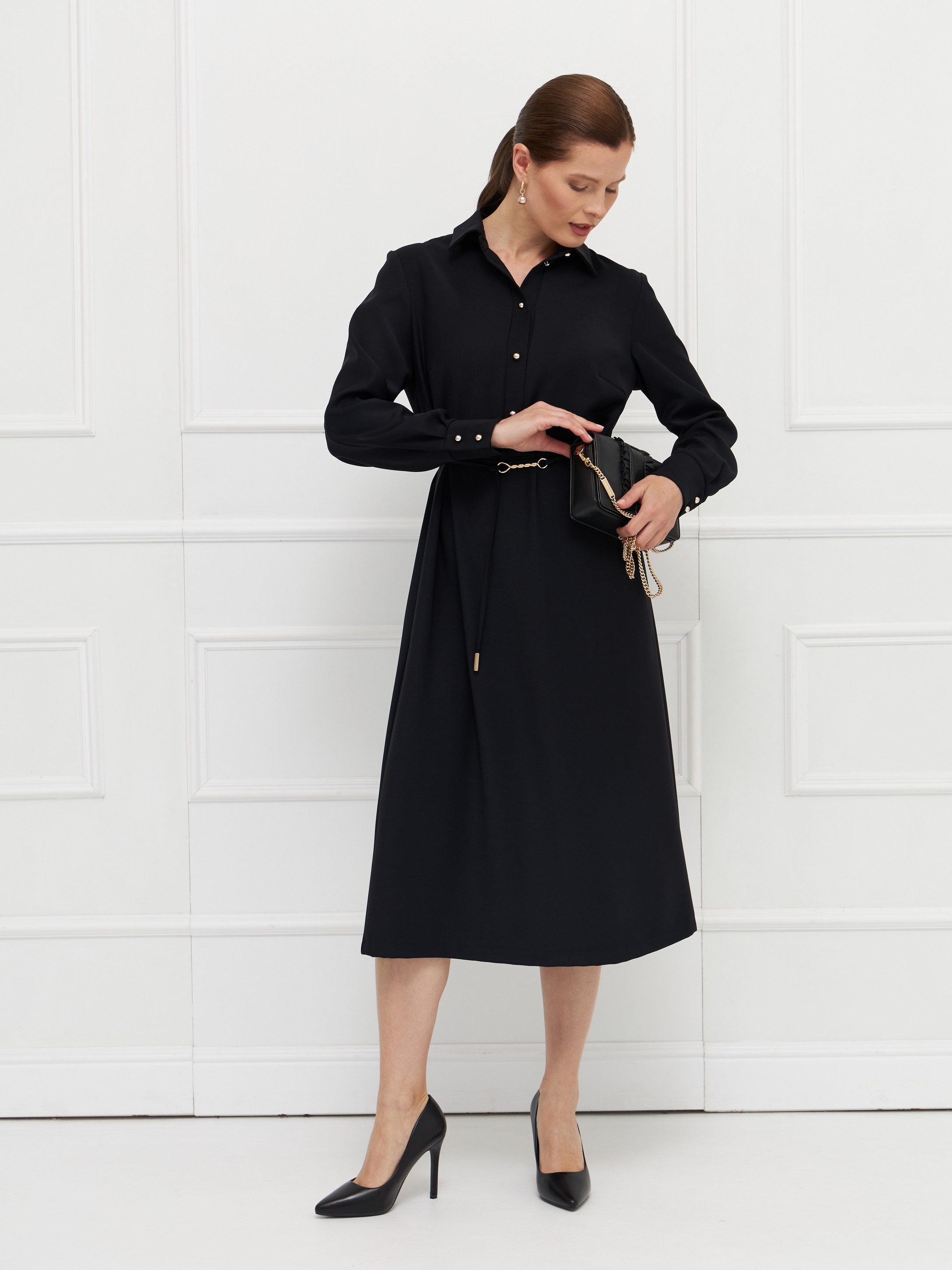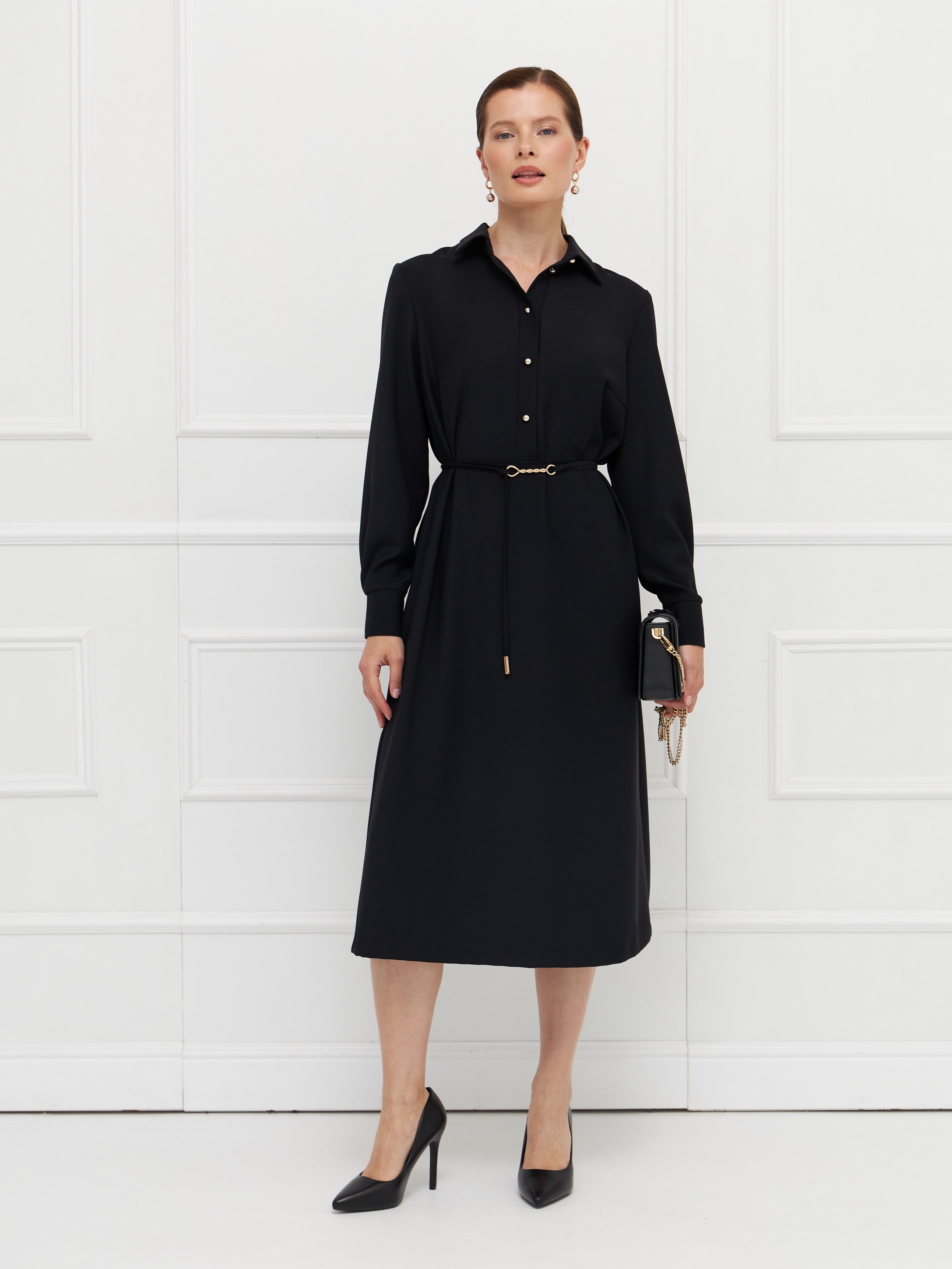 Платье прямого силуэта выполнено из черной ткани, которая хорошо драпируется и пропускает воздух, обеспечивая комфорт в течение дня. Классический рубашечный воротник и вертикальная планка с пуговицами придают модели строгий, собранный вид. Длинные рукава заканчиваются манжетами, на спинке кокетка. Акцентами выступают контрастные пуговицы и пояс-шнурок с изящной пряжкой, который позволяет подчеркнуть талию. Длина миди делает платье универсальным для делового гардероба.