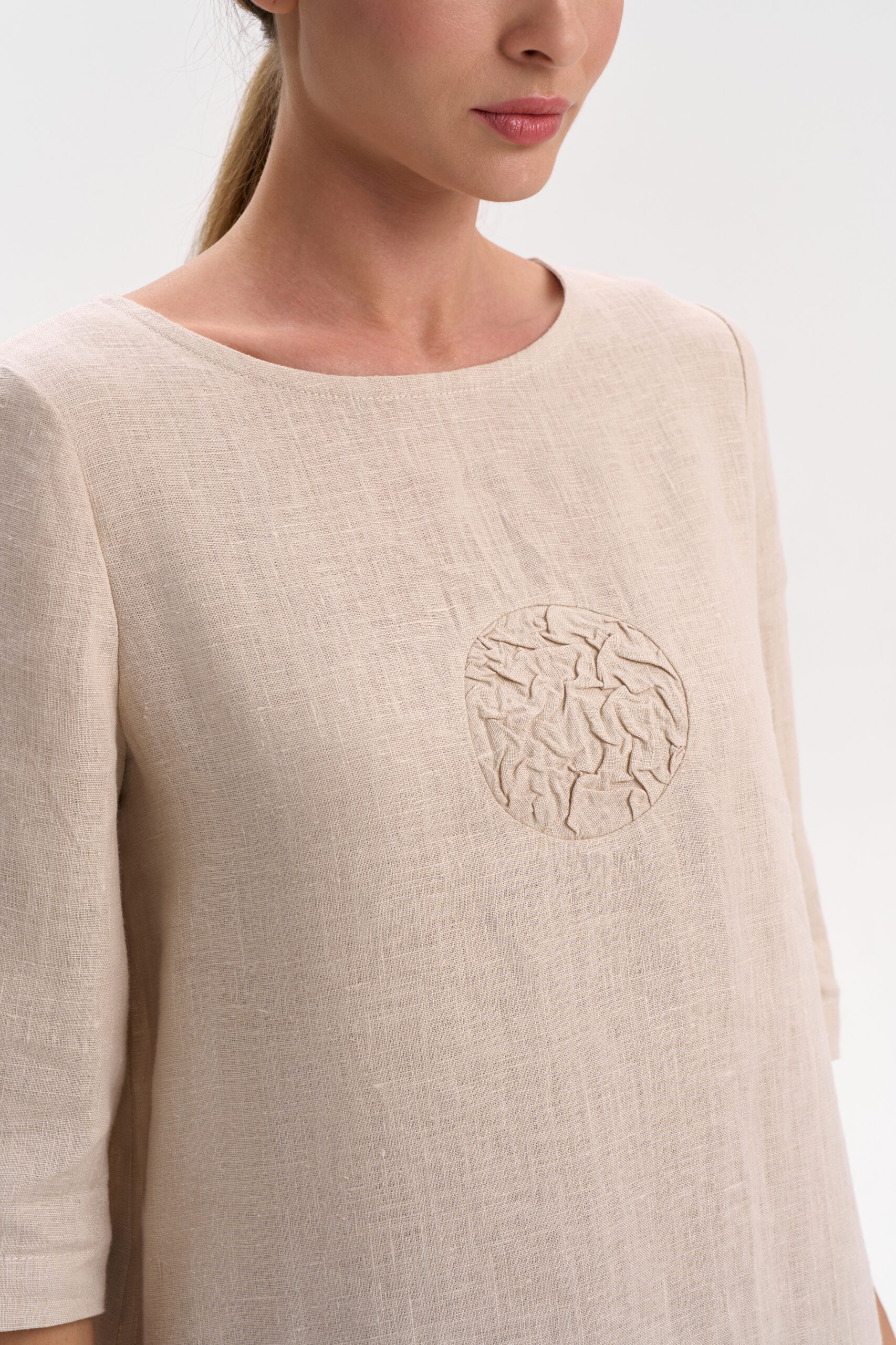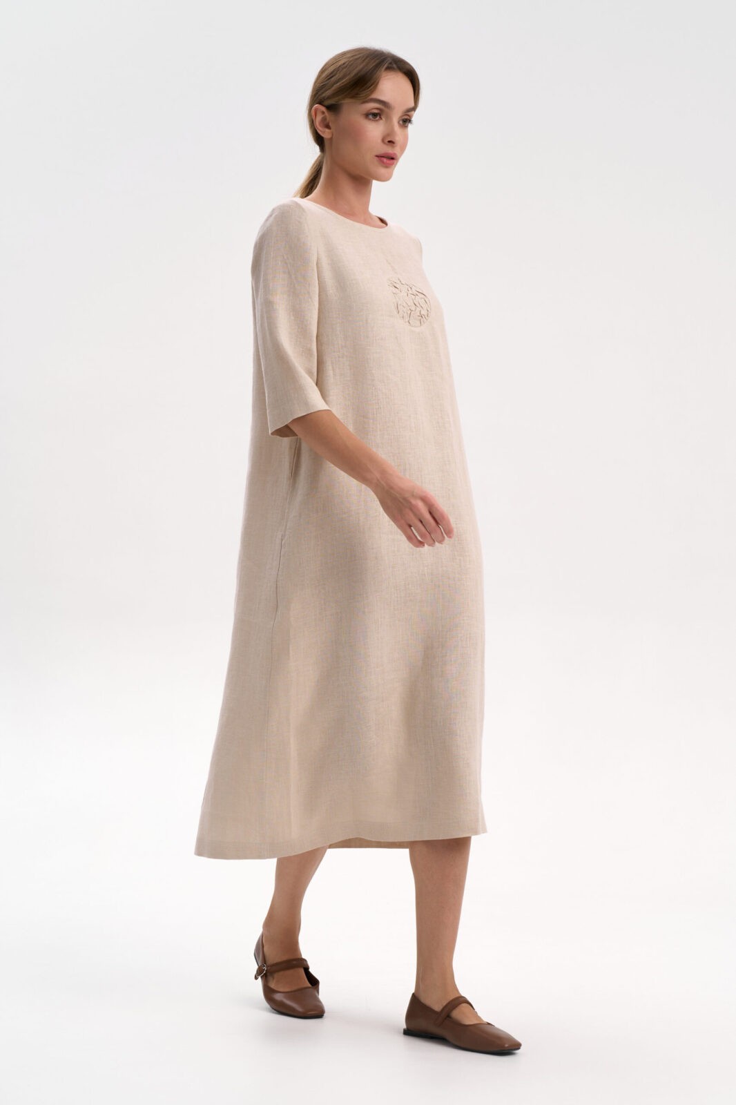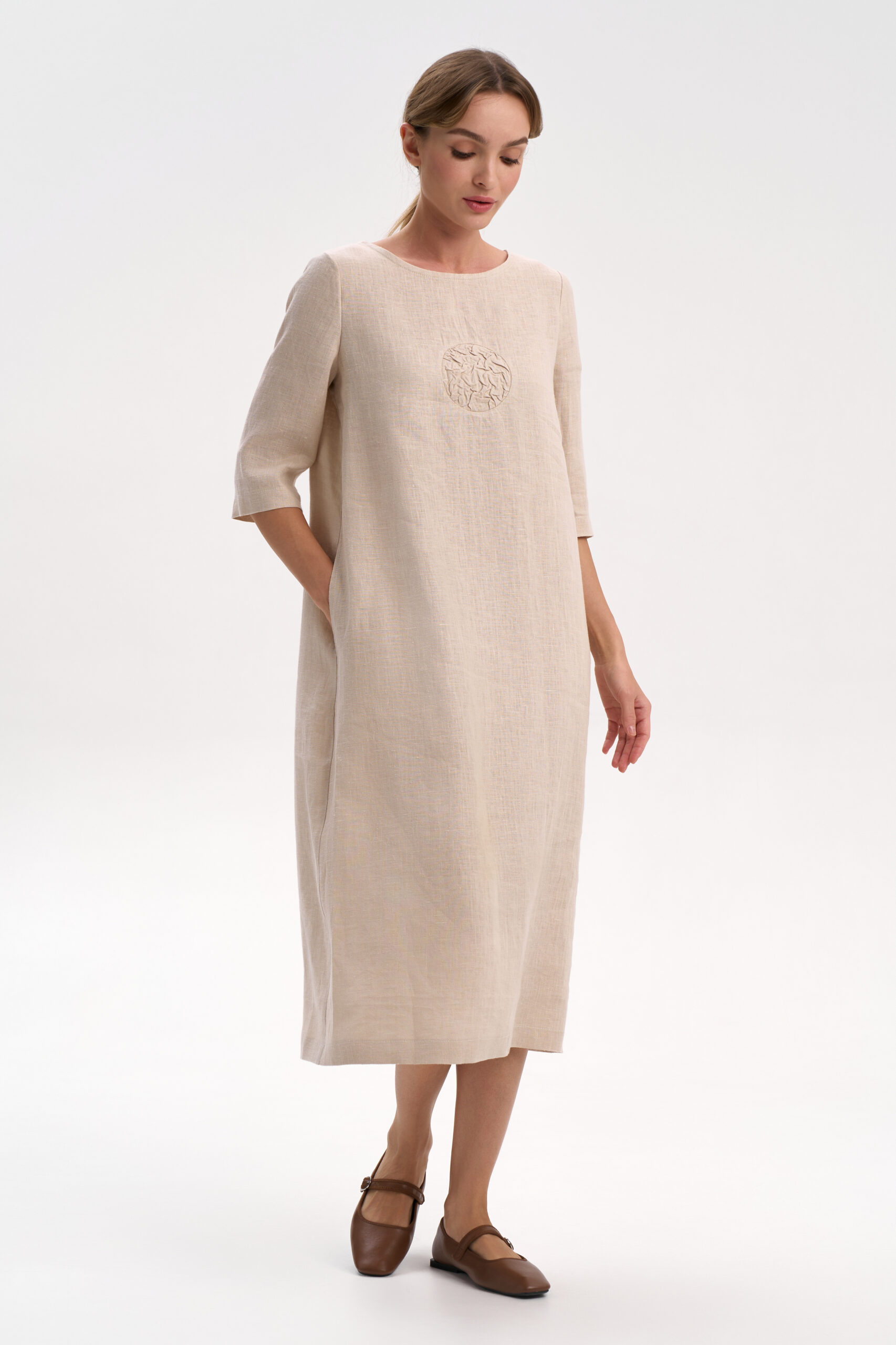 Платье миди прямого силуэта с декоративной вставкой на груди. Сзади шлица. Рукав втачной до локтя. Вырез горловины округлой формы. В боковых швах карманы.