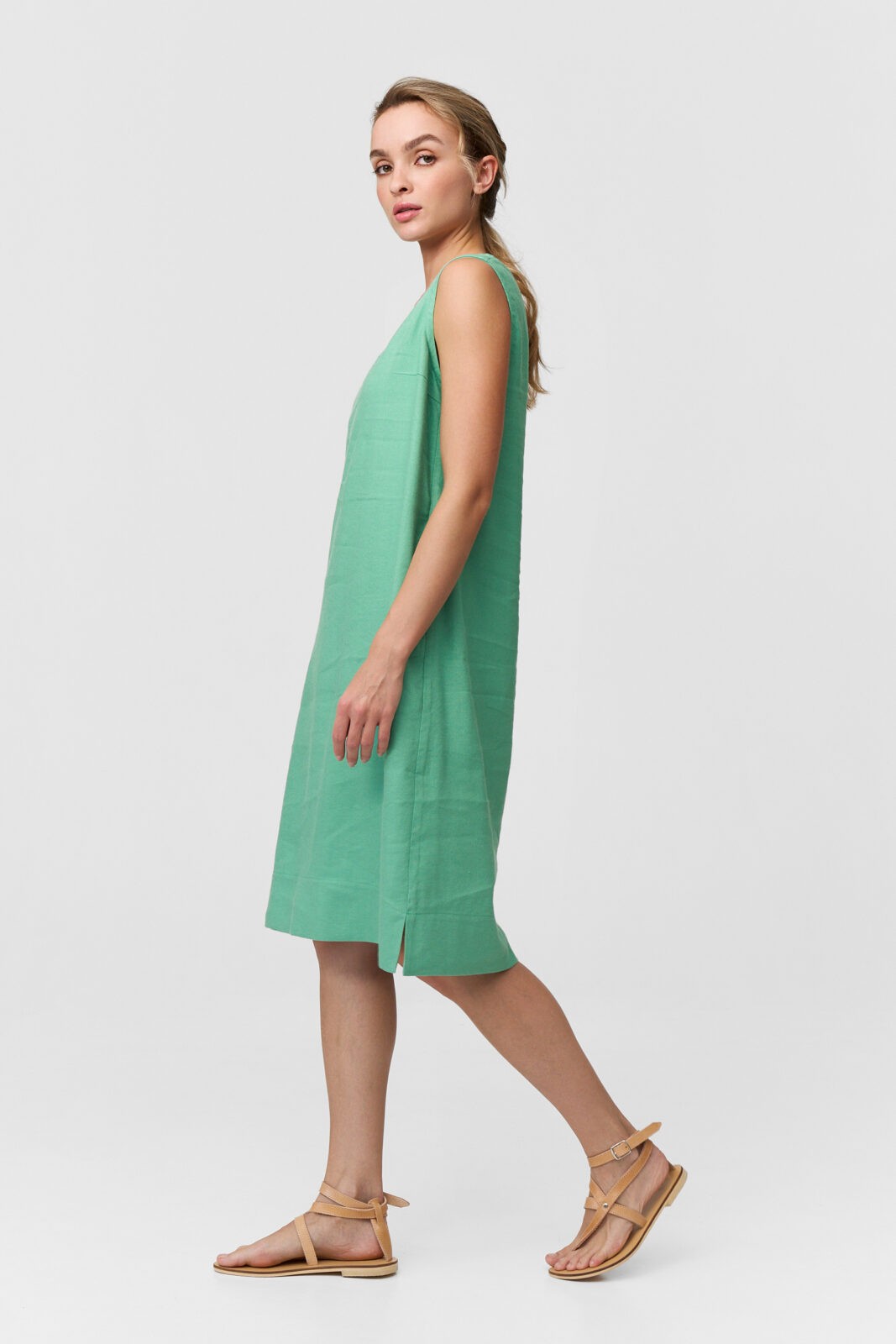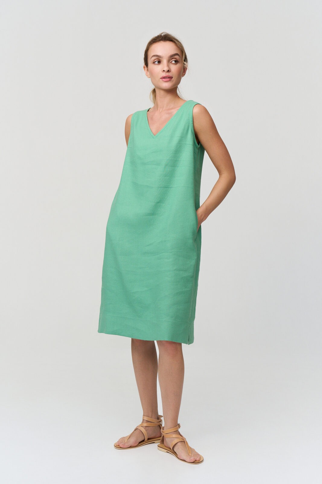 Платье расклешенное без рукавов длиной до середины колена. Горловина V-образная В боках карманы и небольшие разрезы.
