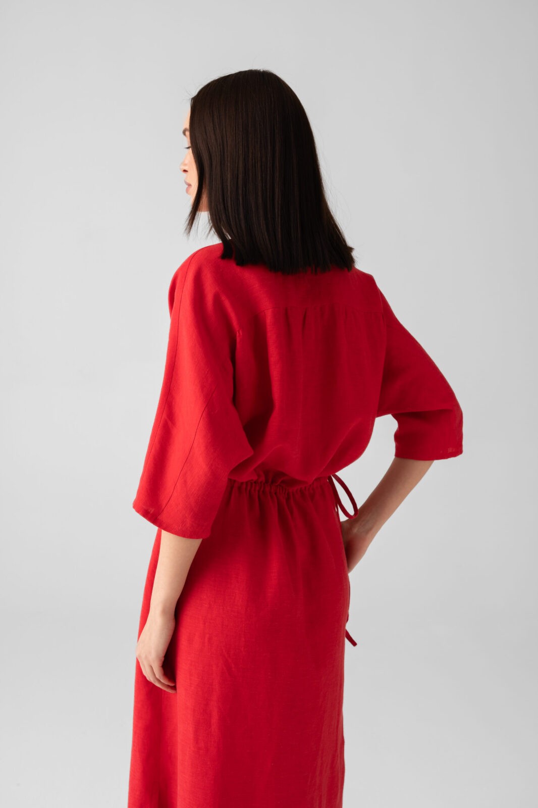 Платье прямое длинное отрезное по талии с регулируемым поясом на эластичной тесьме. Перед лифа на запах, спинка на кокетке со сборкой. Рукав цельнокроенный до локтя. В боковых швах карманы и разрезы.