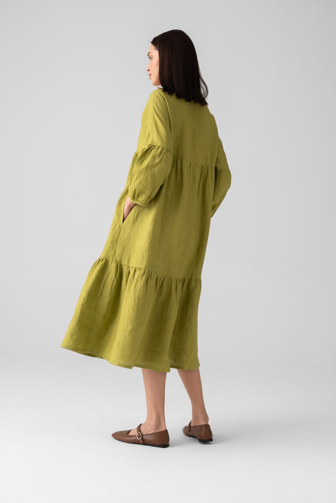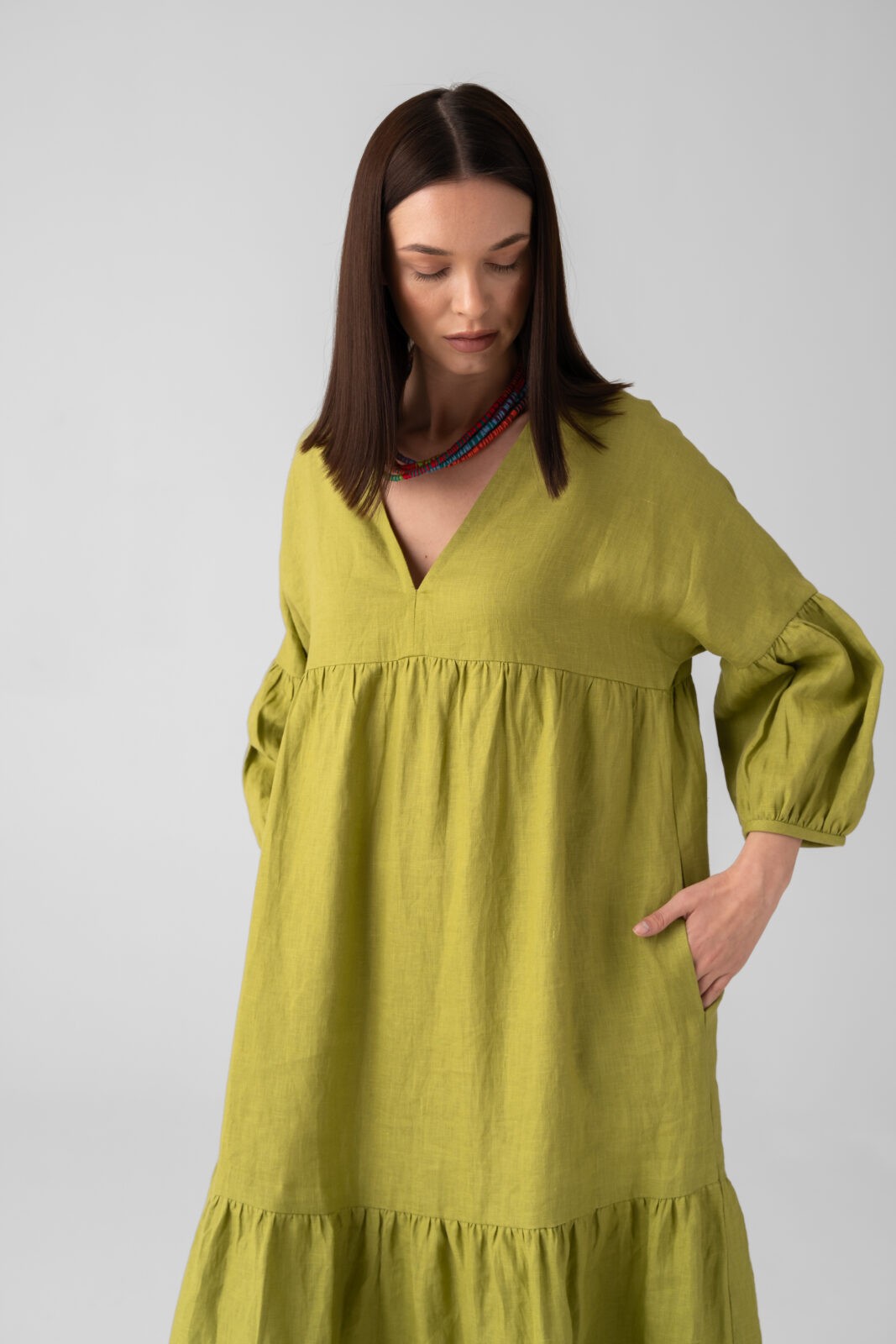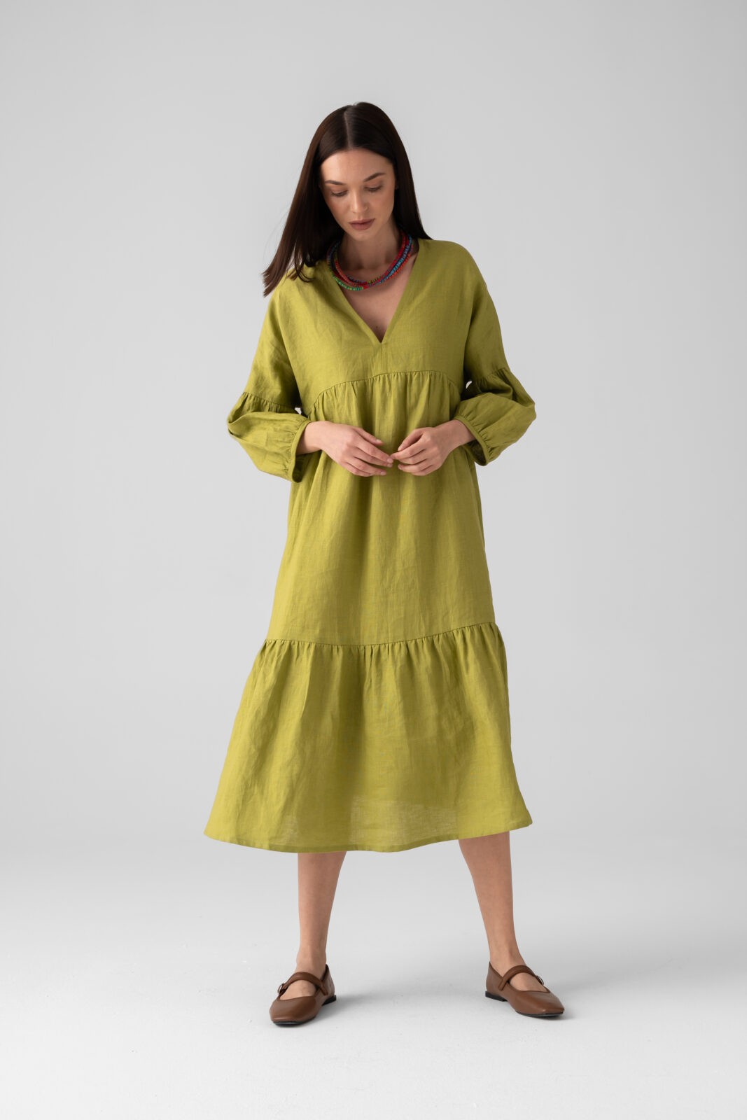 Платье ярусное свободное отрезное под грудью. Рукав цельнокроеный с отрезной частью на сборке. Горловина V-образной формы. Карманы в боковых швах.