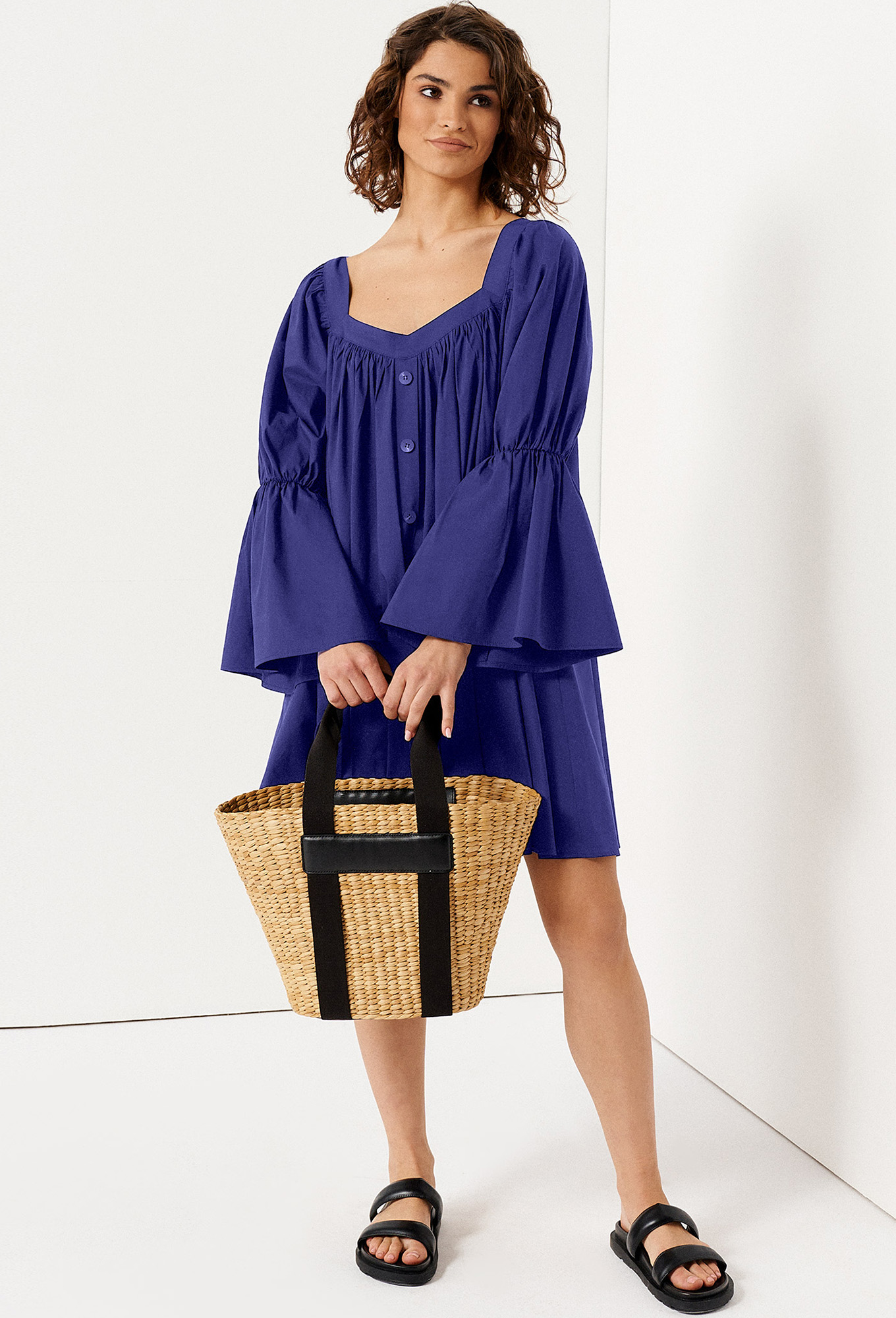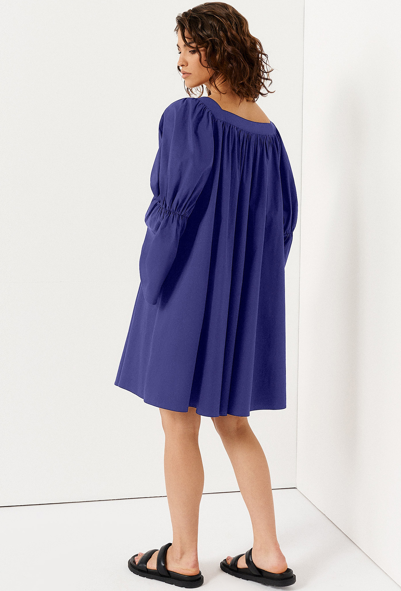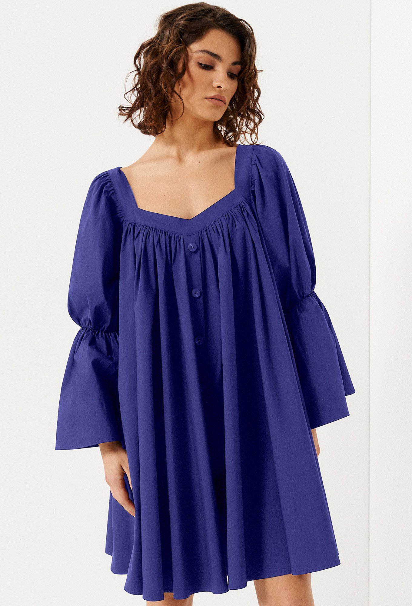 Короткое пышное платье – отличный выбор для стильного вечернего образа. Женское хлопковое платье длиной выше колена скроено в свободном фасоне, полностью скрывает фигуру. Пятиугольный глубокий вырез горловины с акцентом на декольте. От него вниз спускается планка с пуговицами. Оригинальный вид имеет длинный широкий рукав, перехваченный резинкой на локте. Защипы в верхней части лифа создают плавные складки.