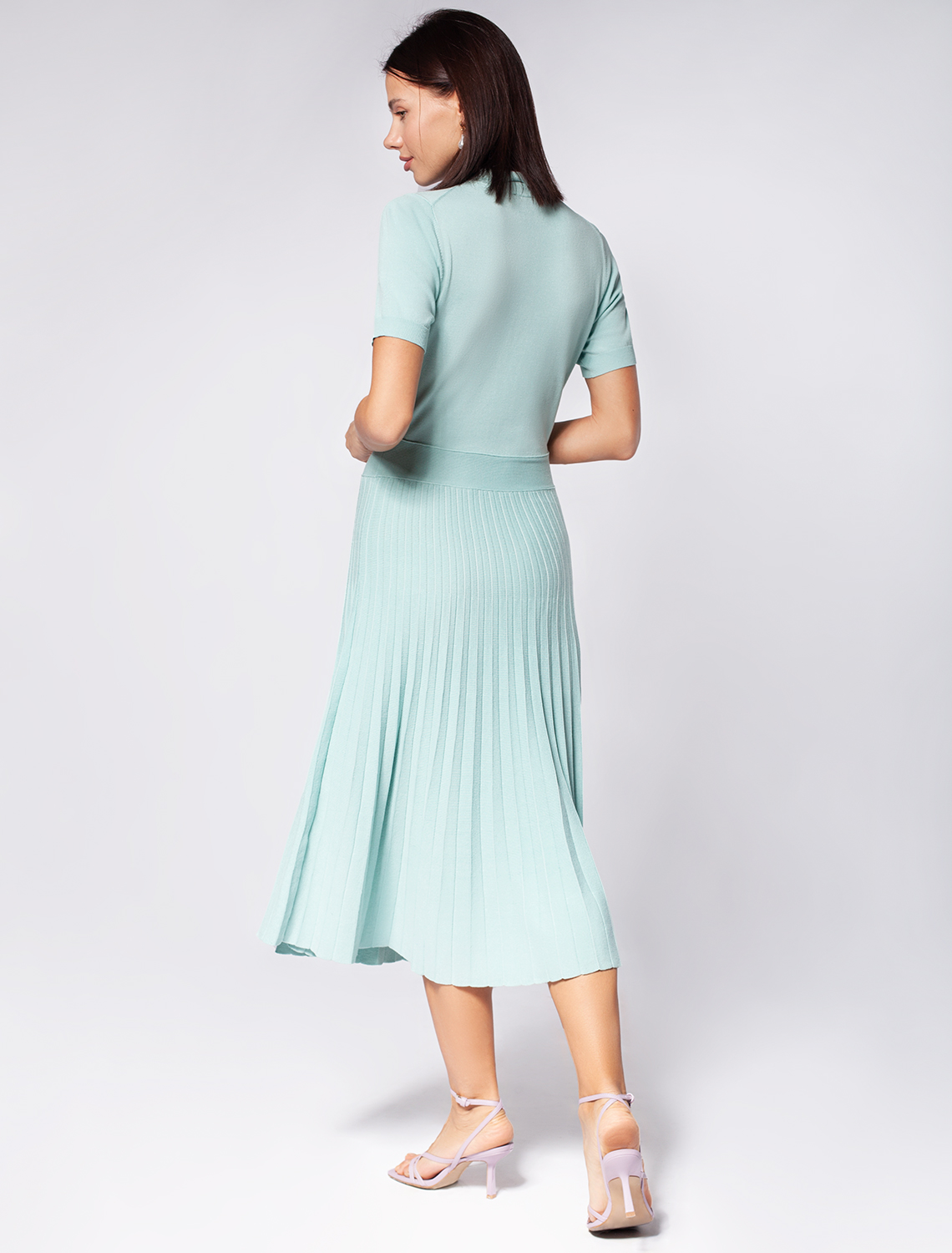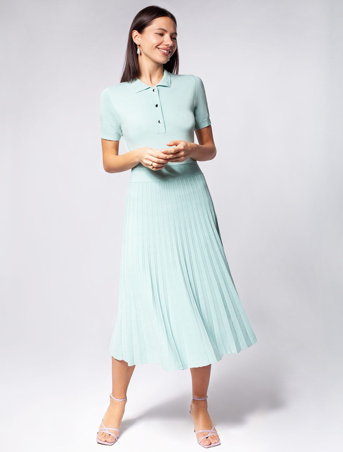 Платье-поло тонкой вязки из вискозы. Идеально подчеркивает силуэт. Поперечная резинка на талии визуально делает талию уже, создавая эффект песочных часов. Юбка со складками в стиле "гофре" струится по бедрам. Золотистые пуговицы добавляют роскоши. Мягкая пряжа очень приятная к телу идеально подходит в теплое время года. мятный