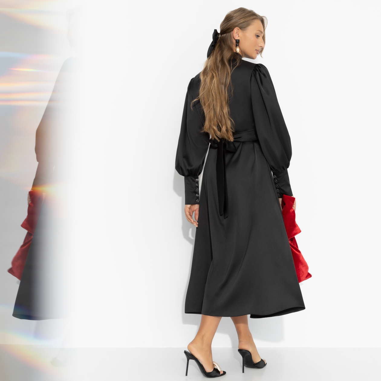 Она появилась, как строчка из романа – беззвучно, но запоминаясь навсегда. Атлас ловит свет и дыхание, обволакивая ее в мягкий полумрак роскоши. Это платье – как чёрная магия: чарует без слов. Платье миди из гладкого атласа с поясом подчёркивает талию и мягко струится по силуэту. Высокий ворот и рукава с пуговицами создают элегантный акцент.