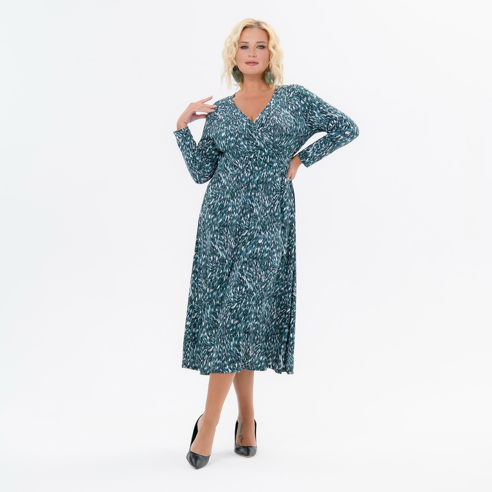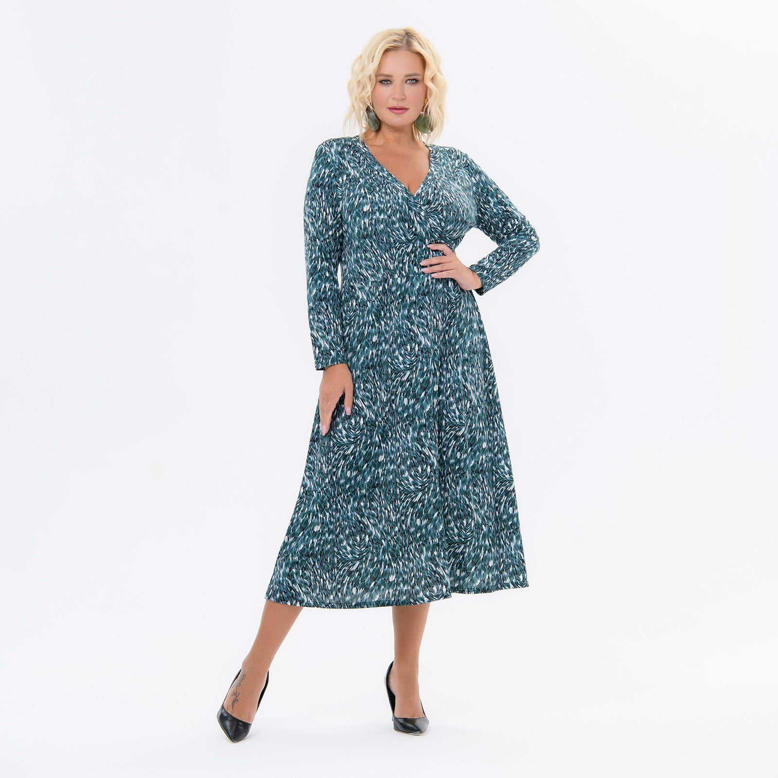 Платье приталенное, лиф с запАхом, принт изумрудно-зеленый