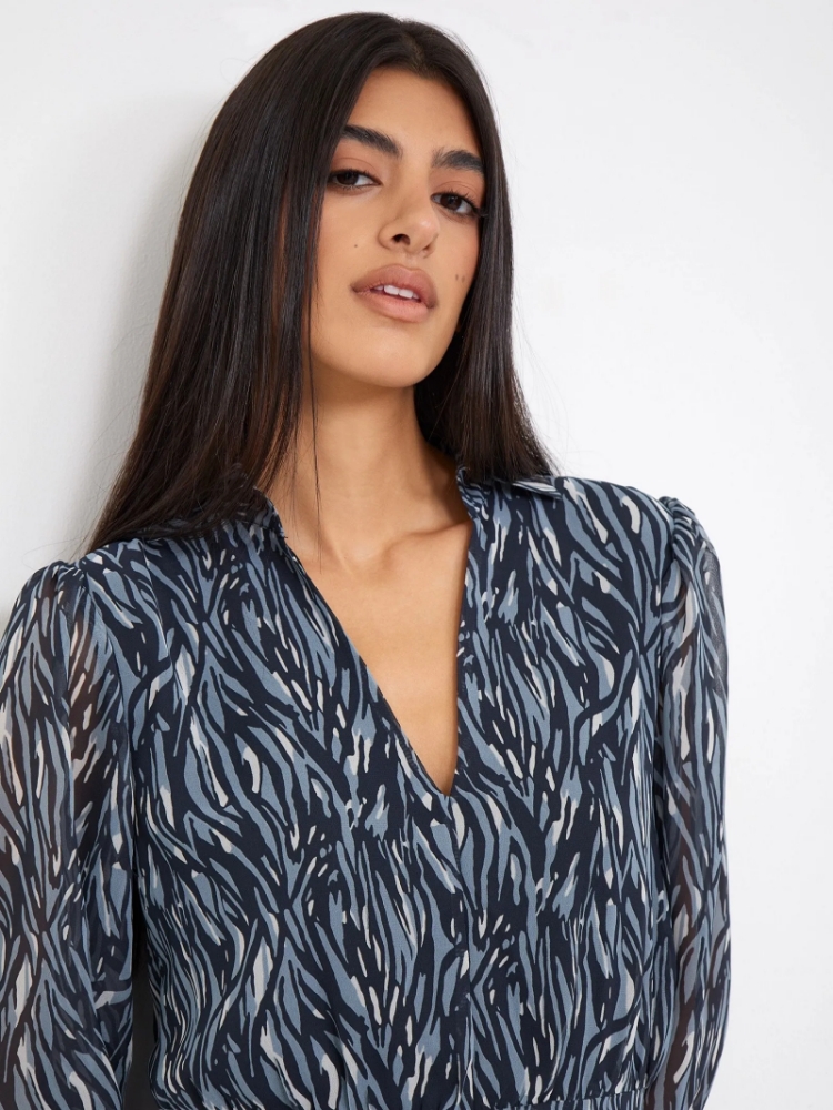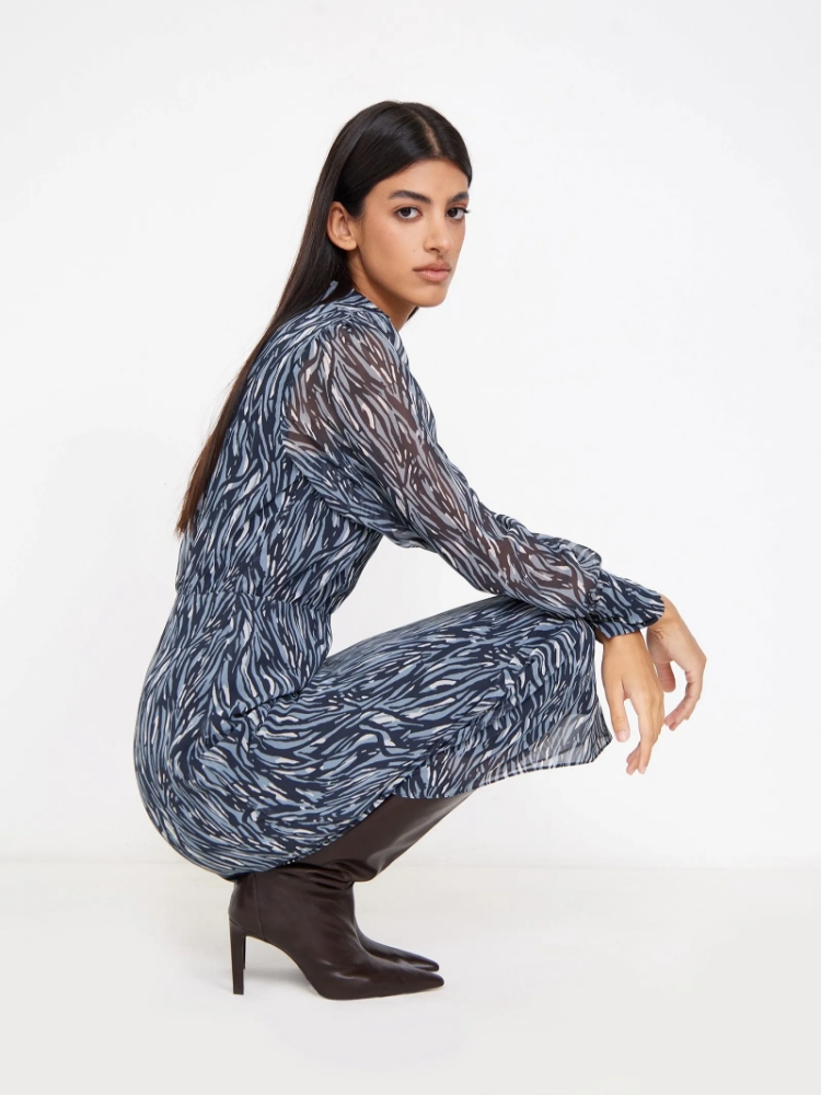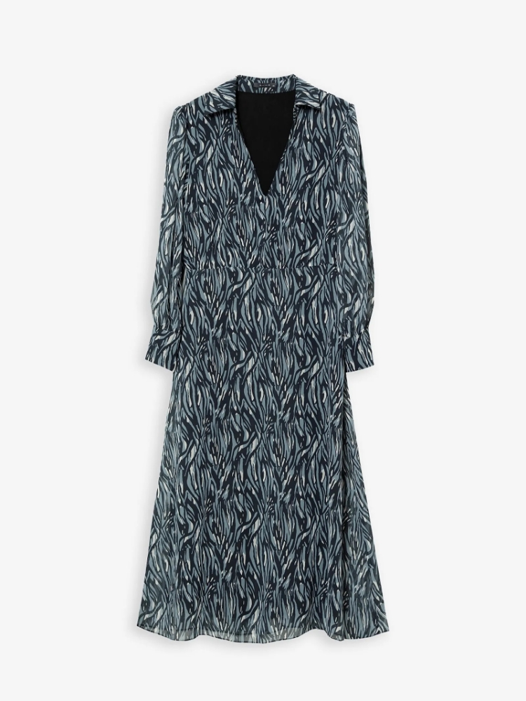 Модное платье с абстрактным принтом. Приталенная модель миди с длинным рукавом универсальна. V-образный вырез сочетается с аккуратным отложным воротником. Изделие выполнено из лёгкого материала, на подкладке из вискозы