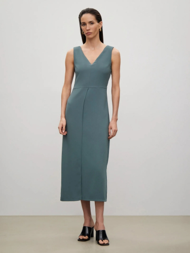 Эффектное платье на каждый день в модном оттенке зелёного. Хорошо подойдёт в качестве первого слоя под базовые жакеты. Модель без рукавов красиво открывает руки, ключицы и спину за счёт V-образного декольте и выреза сзади. Разрез обеспечивает свободу движений. Приталенная модель имеет длину миди. Изделие выполнено из материала с высоким содержанием вискозы, на подкладке