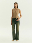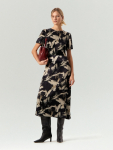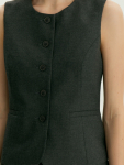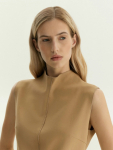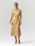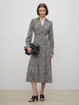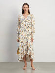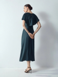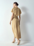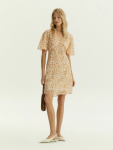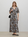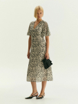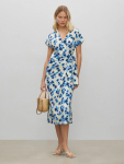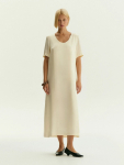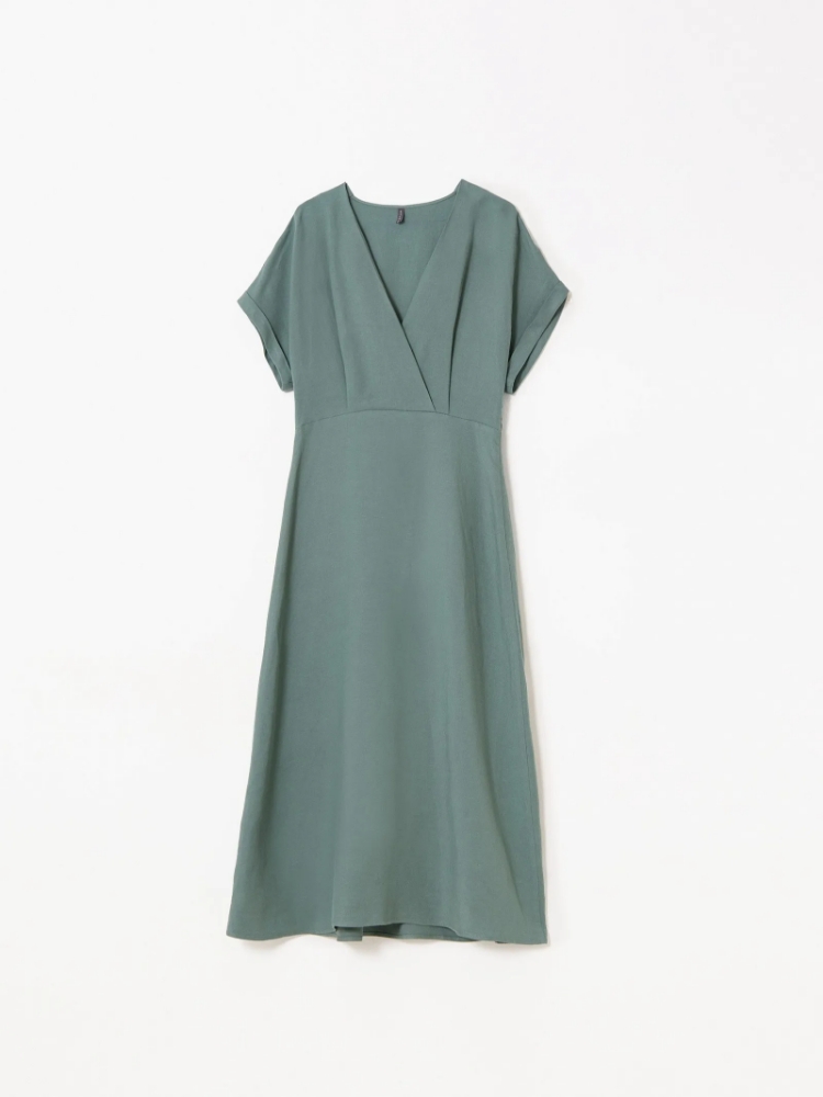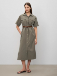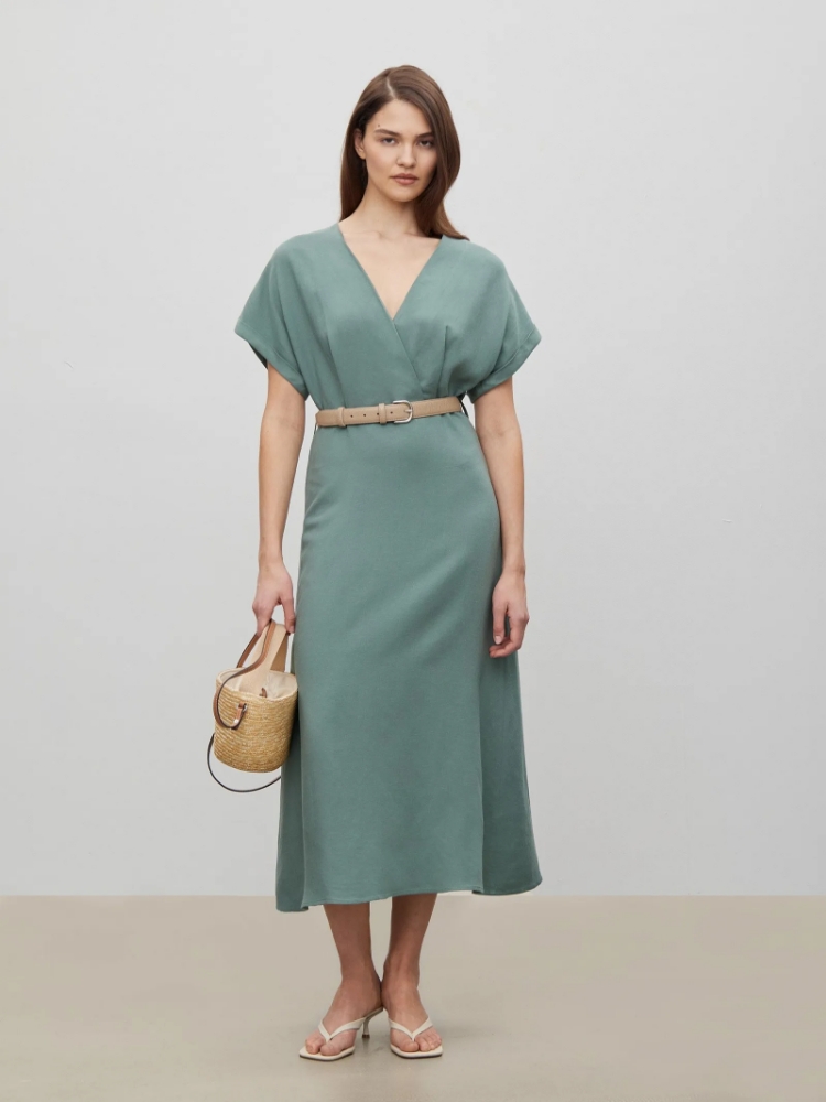Платье в цвете хаки из вискозы и льна. Модель длины миди имеет короткий рукав и V-образный вырез. Верхняя часть с запахом дополнена удобной небольшой пуговицей. Изделие выполнено без подкладки