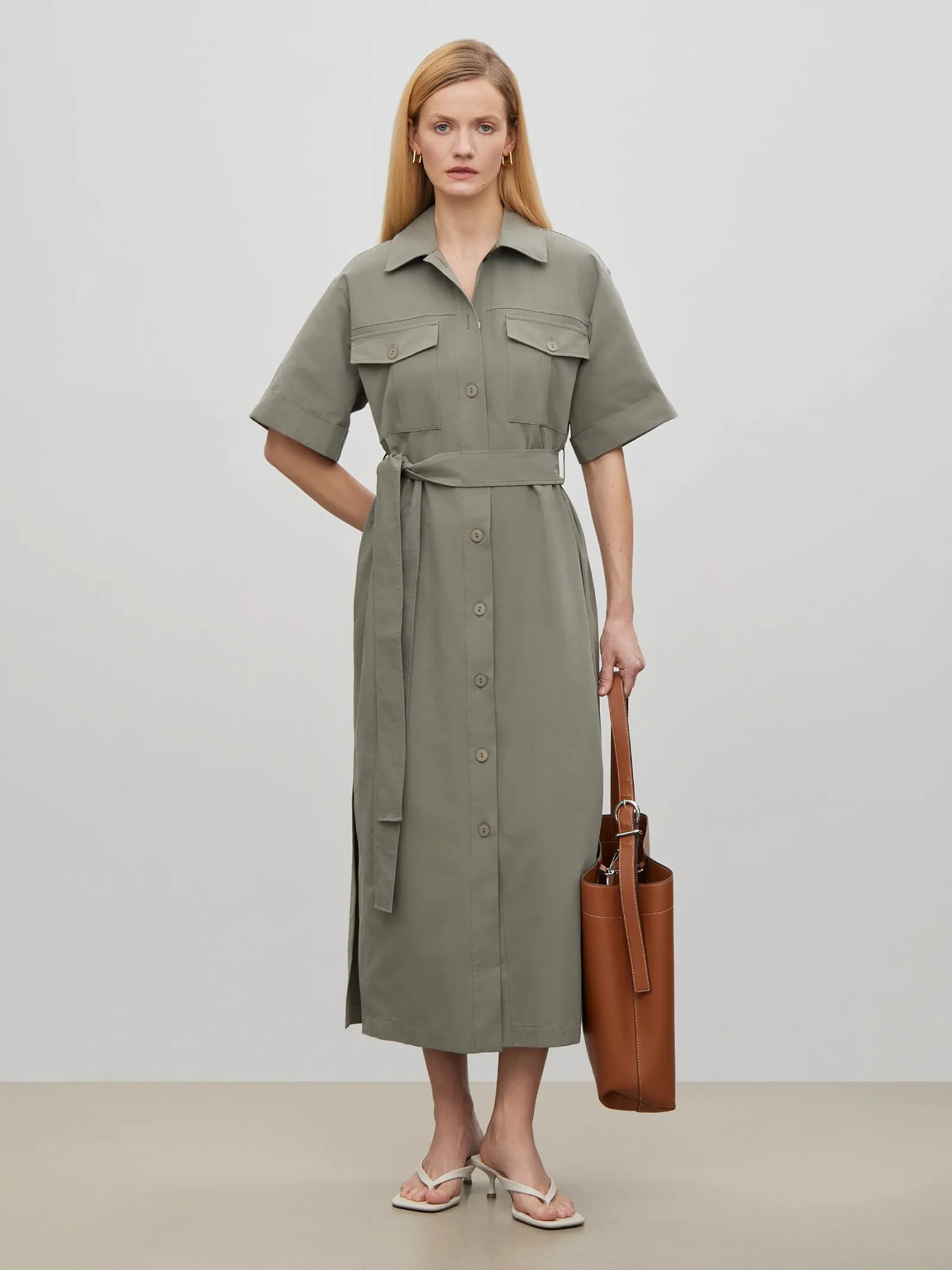 Платье-рубашка цвета хаки подойдёт для повседневных образов в стилях кэжуал, сафари и милитари. Изготовлено из натурального хлопка и комфортно в носке. Дополнено широким поясом в тон. Модель в длине миди с коротким рукавом отличают крупные накладные карманы на груди. На спинке имеется кокетка со складкой. Изделие без подкладки