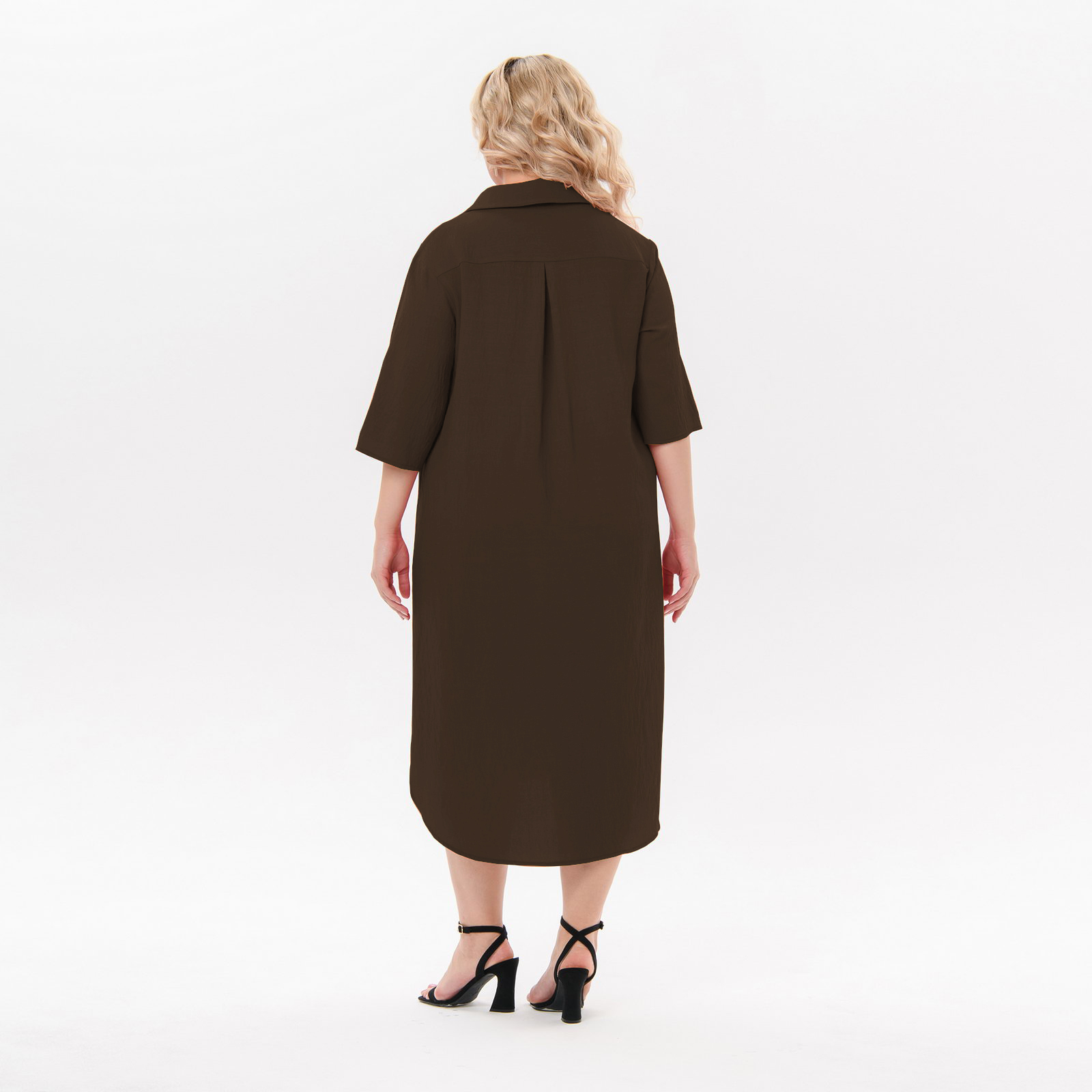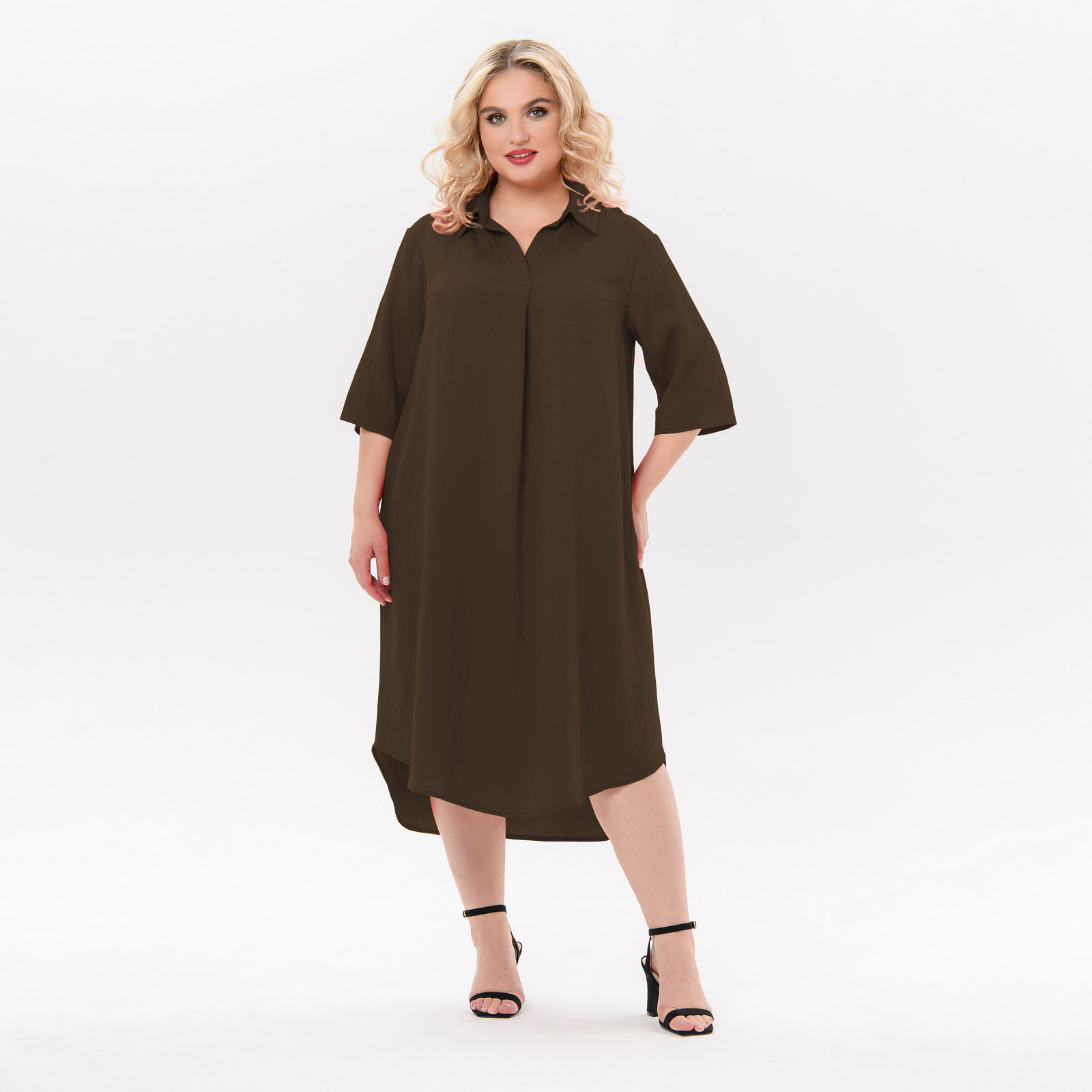 Платье - рубашка свободного А-силуэта из ткани средней плотности. Линия плеча спущена, рукав прямой, свободный. По переду V-вырез, переходящий в складку.