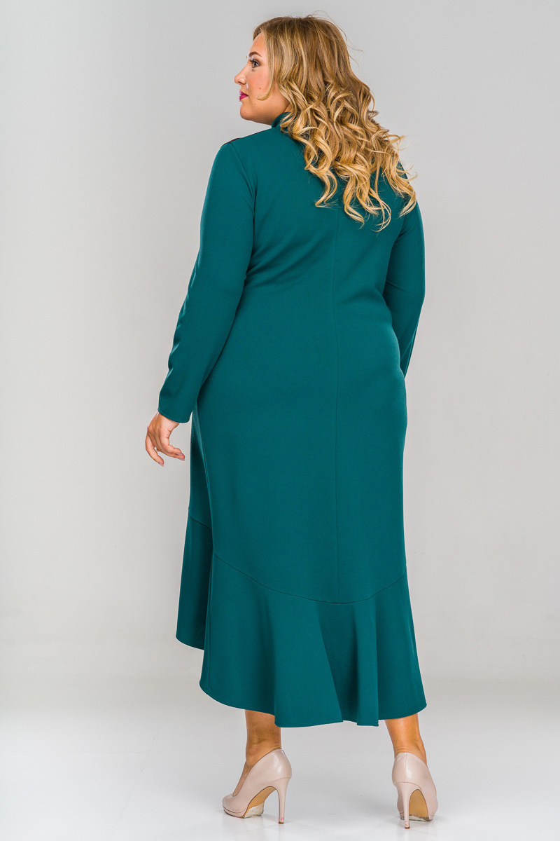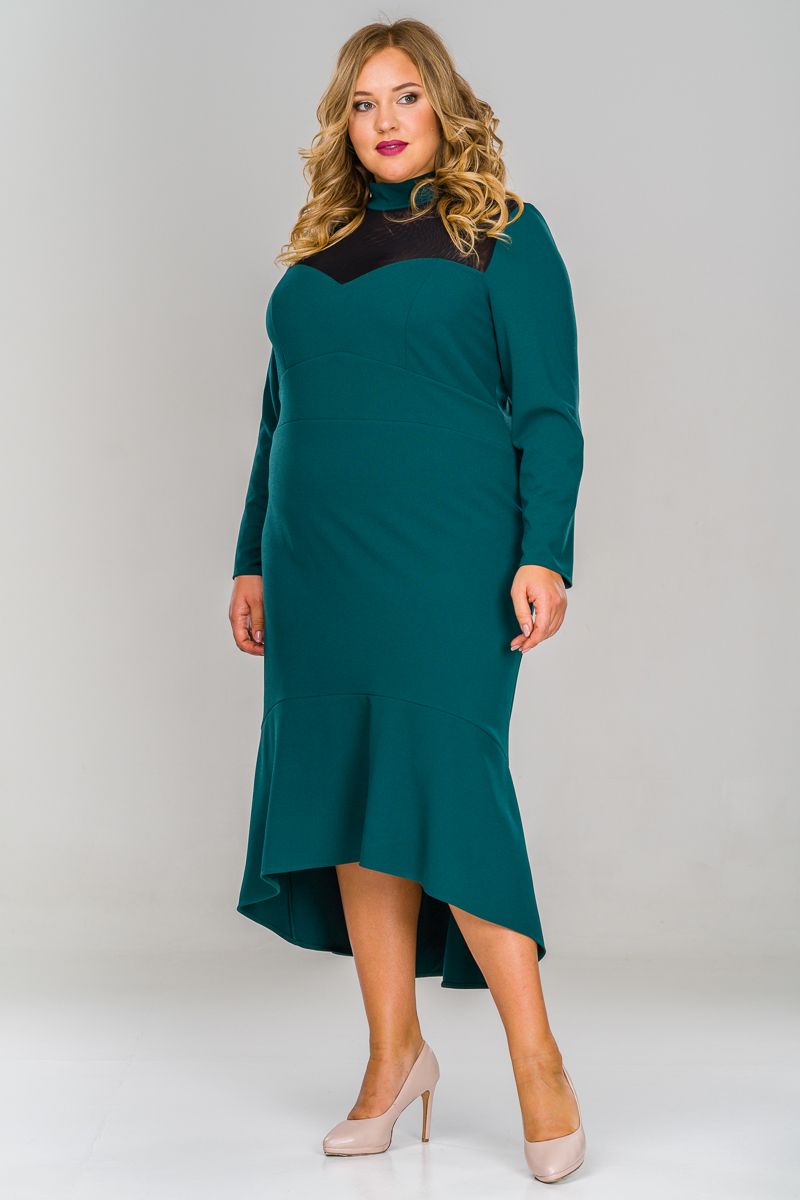 Платье с асимметричным низом и кокеткой из сетки, зеленое