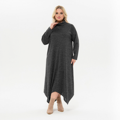 Платье свободного силуэта, слегка расклешенное к низу, из меланжевого джерси. Линия плеча спущена, рукав длинный.