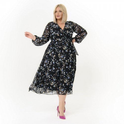 Платье с кокеткой и широкой юбкой, черное, принт "бирюзовые цветы"