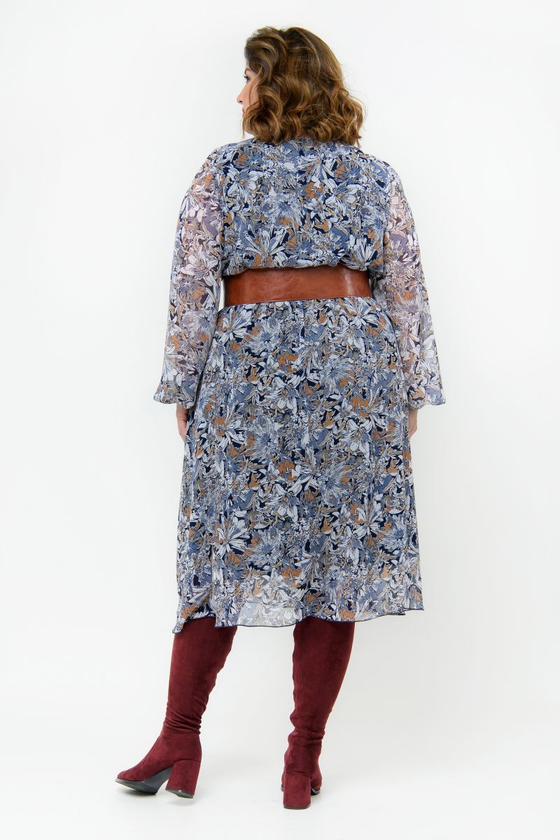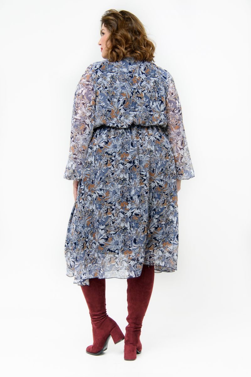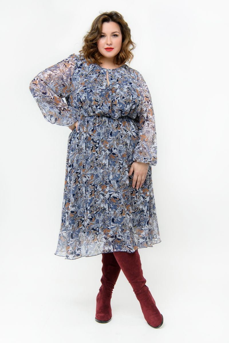 Платье с мягкими защипами по горловине, шифон темно-синий принт.