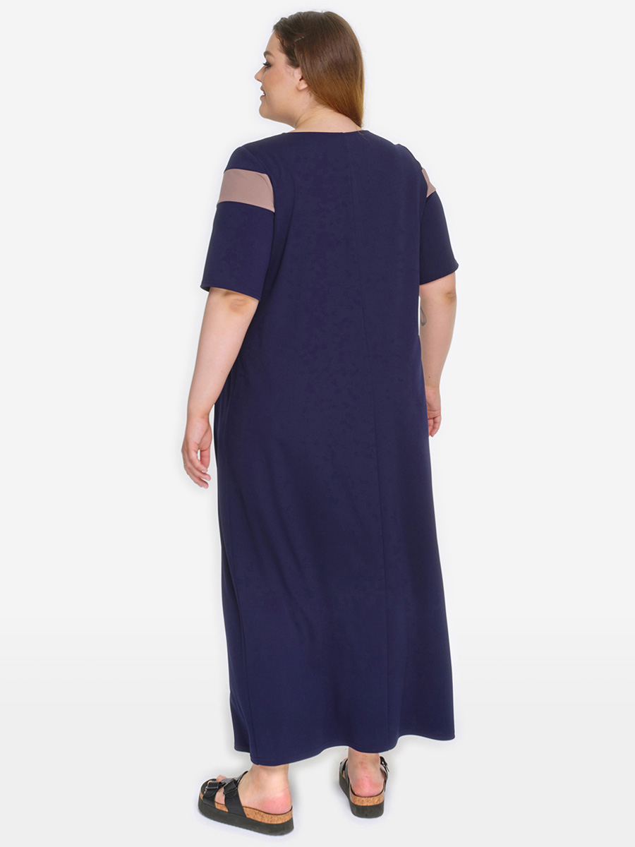 Платье с отделкой по кокетке и рукавам, темно-синее, отделка кофе