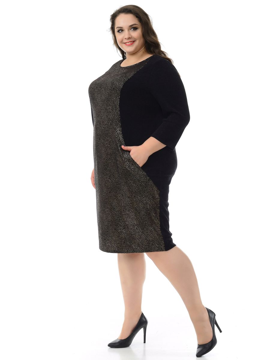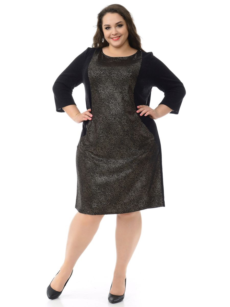 Платье прямого силуэта из искусственной ангоры. Центральная часть переда платья с золотым напылением, отрезные бочки, спинка и рукава из ткани-компаньона. В рельефных швах обработаны карманы. Рукав двухшовный, длиной 3/4.