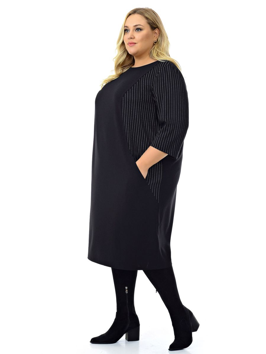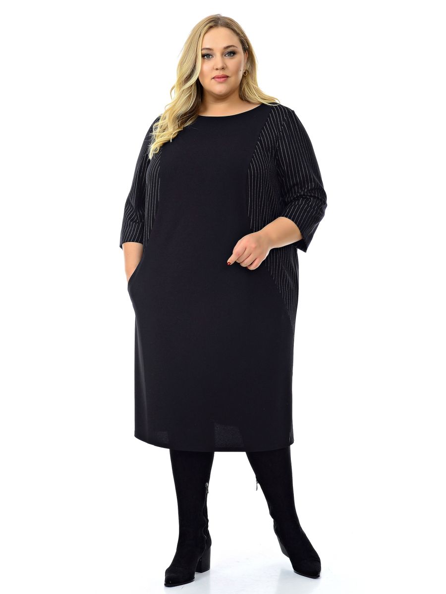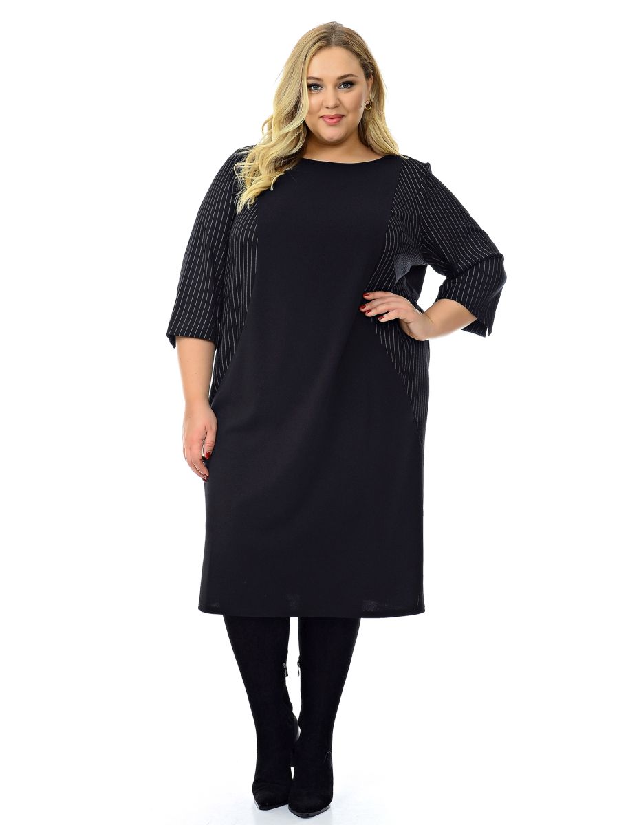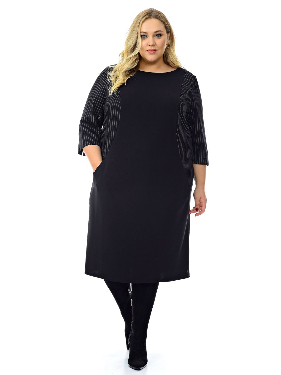 Офисное платье прямошо силуэта. По переду фигурные рельефы, в которых обработаны карманы. Рельефные детали и рукава выполнены из ткани-компаньона в полоску.