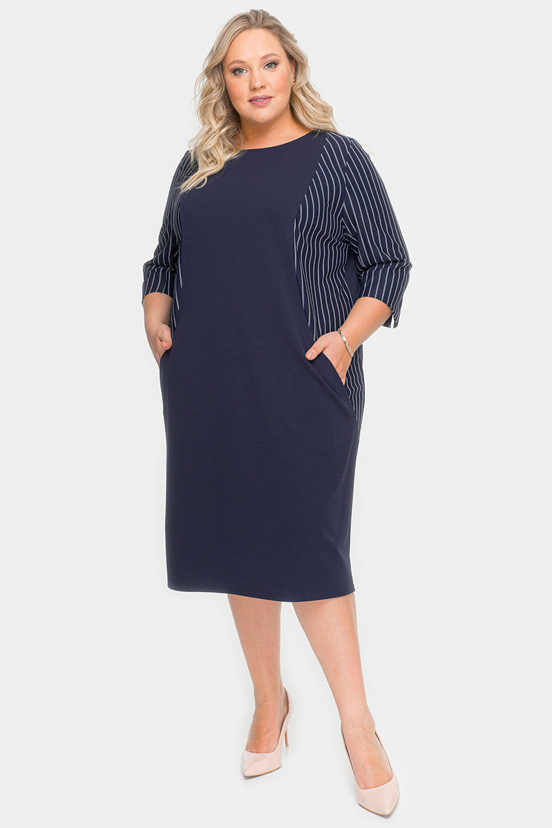 Офисное платье полуприлегающего силуэта. По переду фигурные рельефы, в которых обработаны карманы. Рельефные детали и рукава из ткани-компаньона в полоску.