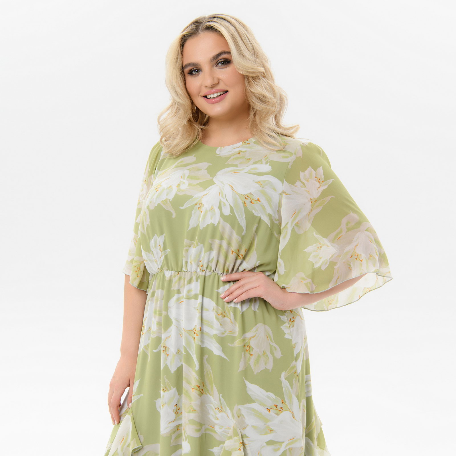 Платье с воланами по юбке из шифона, мятное, принт "лилии"