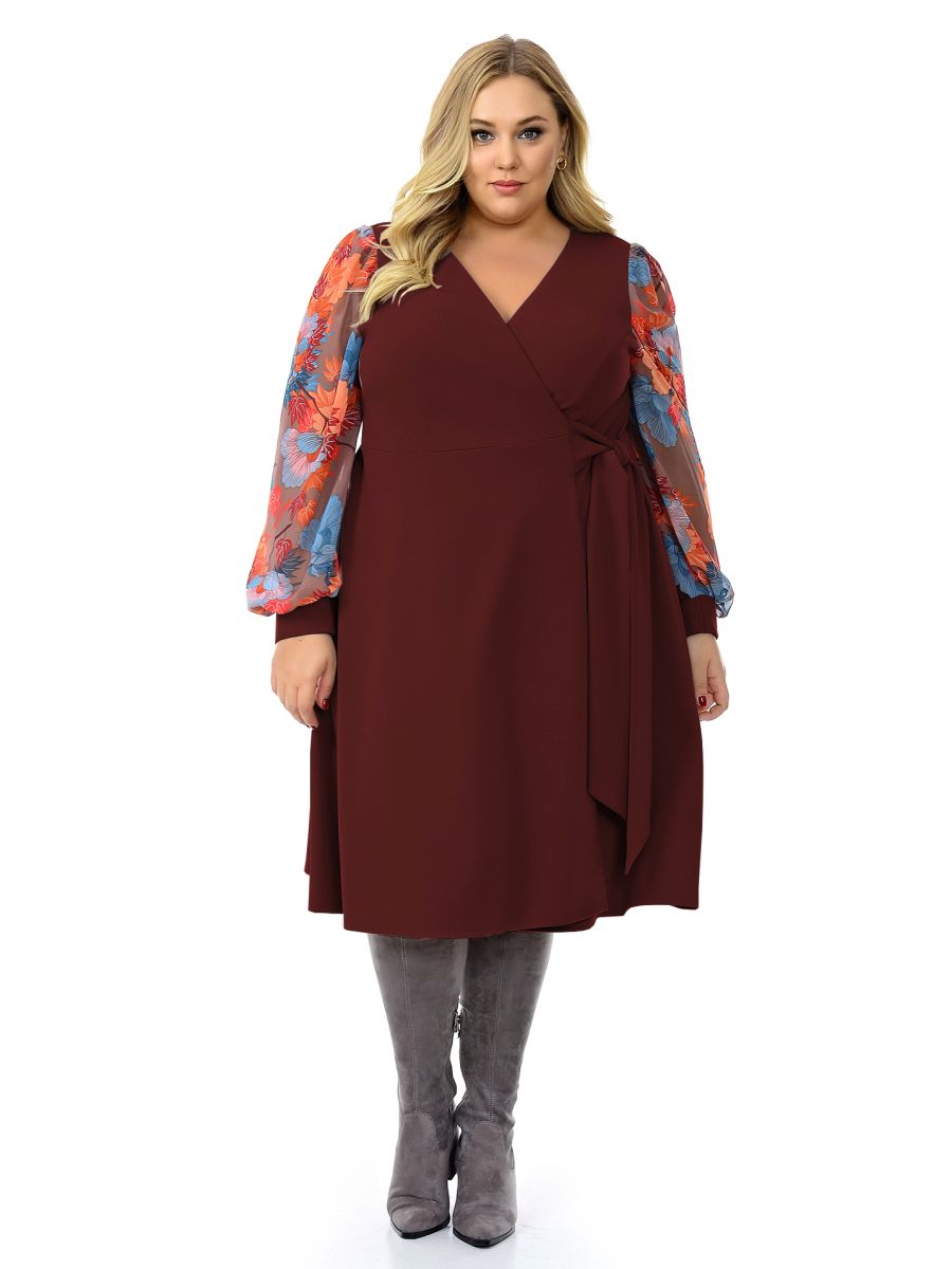Платье выполнено из эластичного крепа. Модель приталенного силуэта, с горизонтальным подрезом по линии талии. Детали запАха переда фиксируются резинкой. Юбка расширенная. Комфортное прилегание платья по линии талии обеспечивает пояс, втачанный в правый борт и левый боковой шов. Воздушный рукав "фонарик" уравновешивает силуэт.