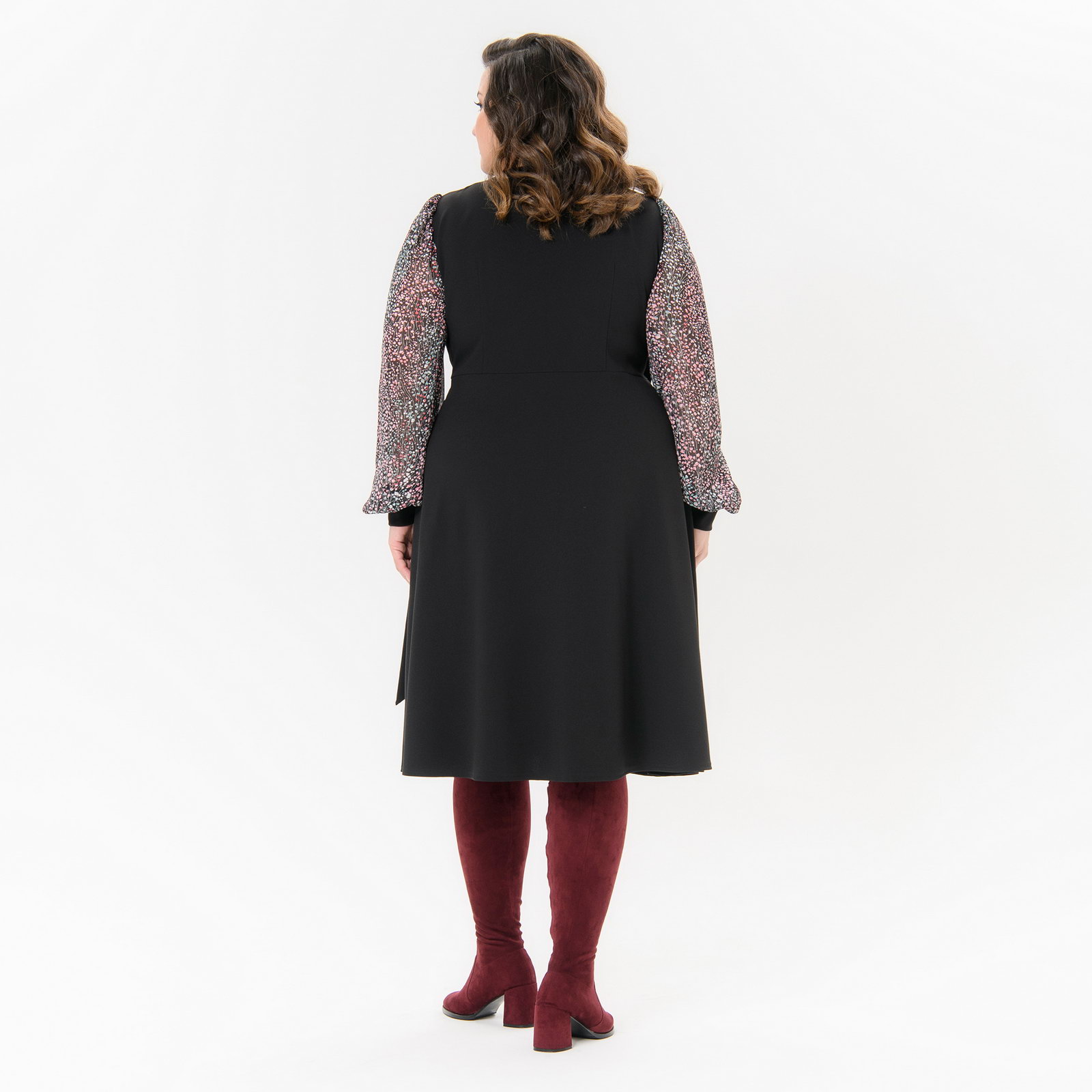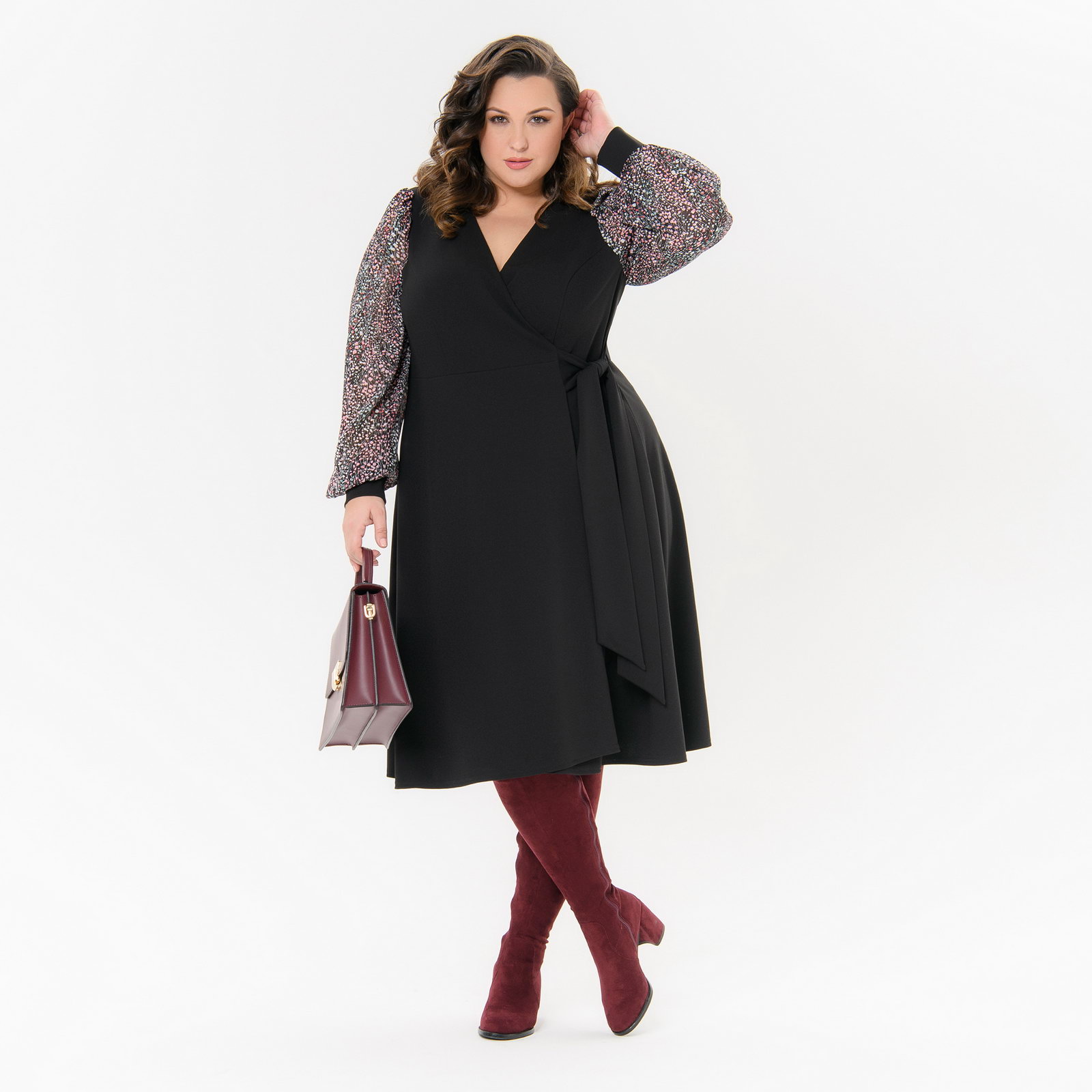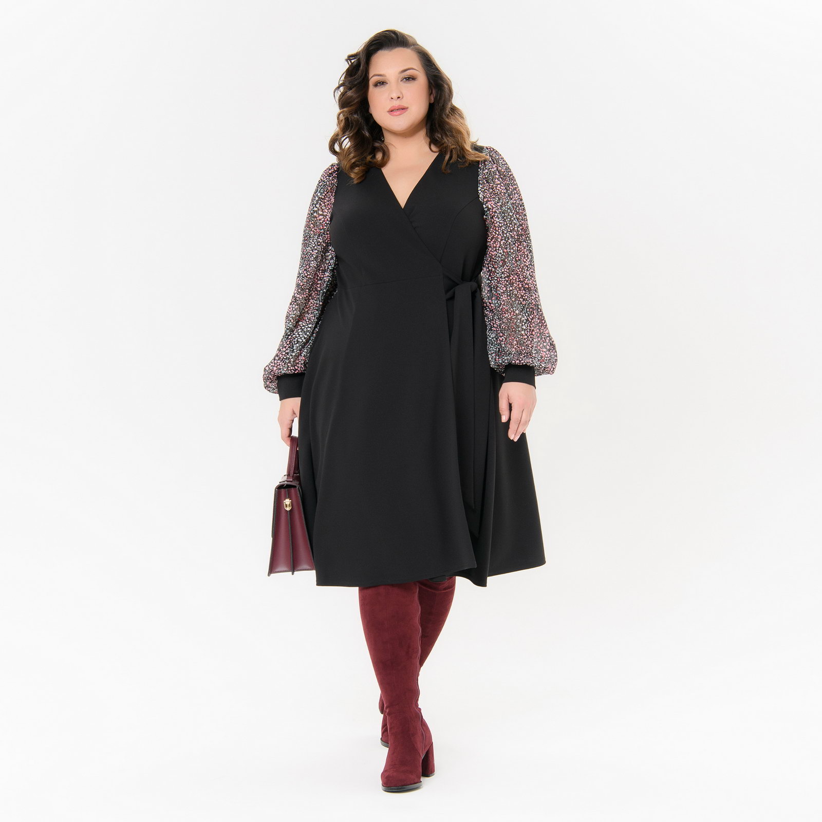 Платье с запАхом из эластичного крепа. Модель приталенного силуэта, с горизонтальным подрезом по линии талии. Внутренняя деталь запАха переда фиксируются резинкой. Юбка расширенная. Комфортное прилегание платья по линии талии обеспечивает пояс, втачанный в правый борт и левый боковой шов. Воздушный рукав "фонарик" уравновешивает силуэт.