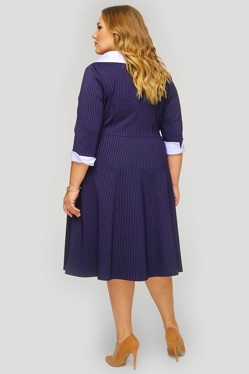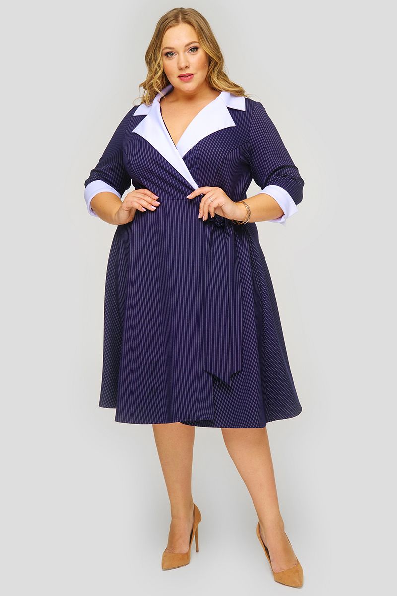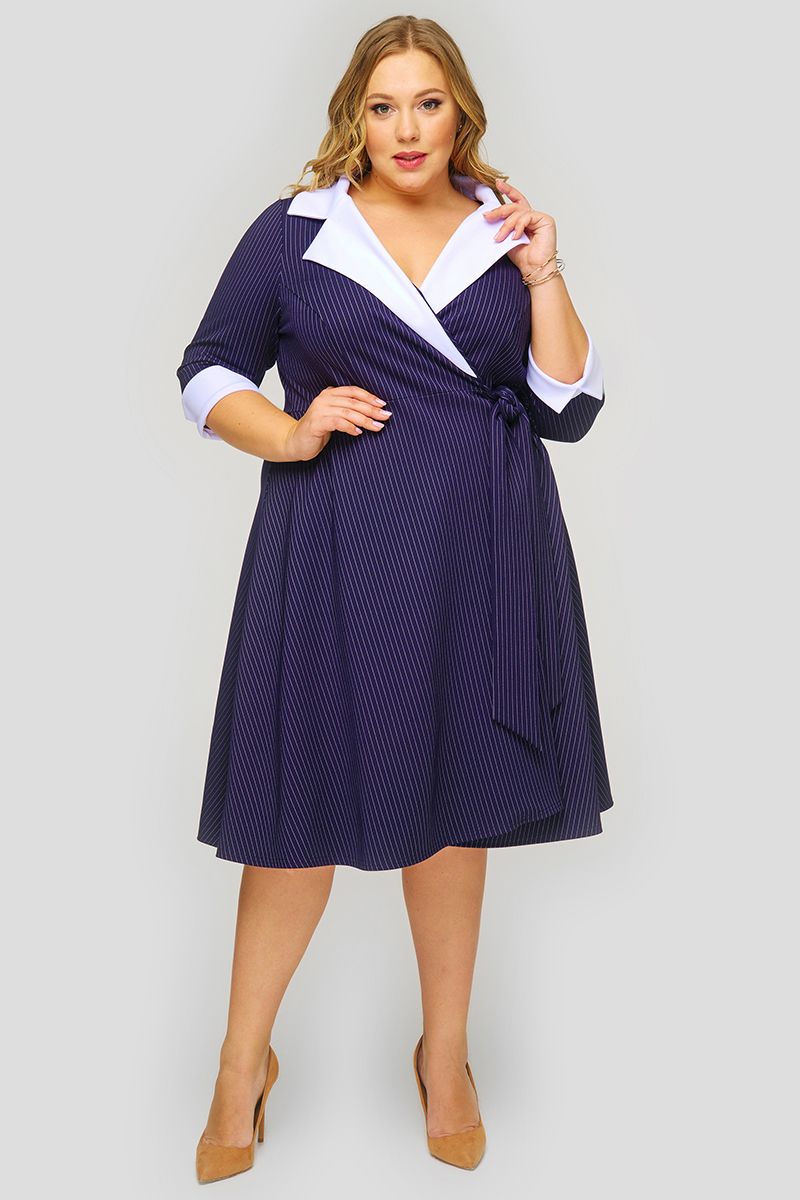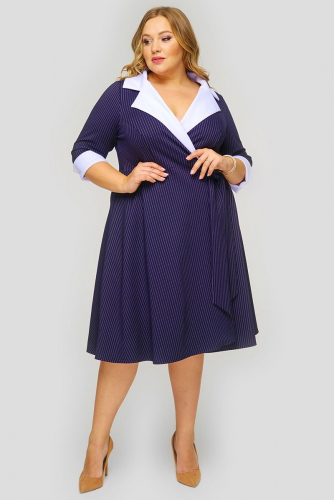 Платье с запАхом, джерси темно-синее в полоску, с белой отделкой