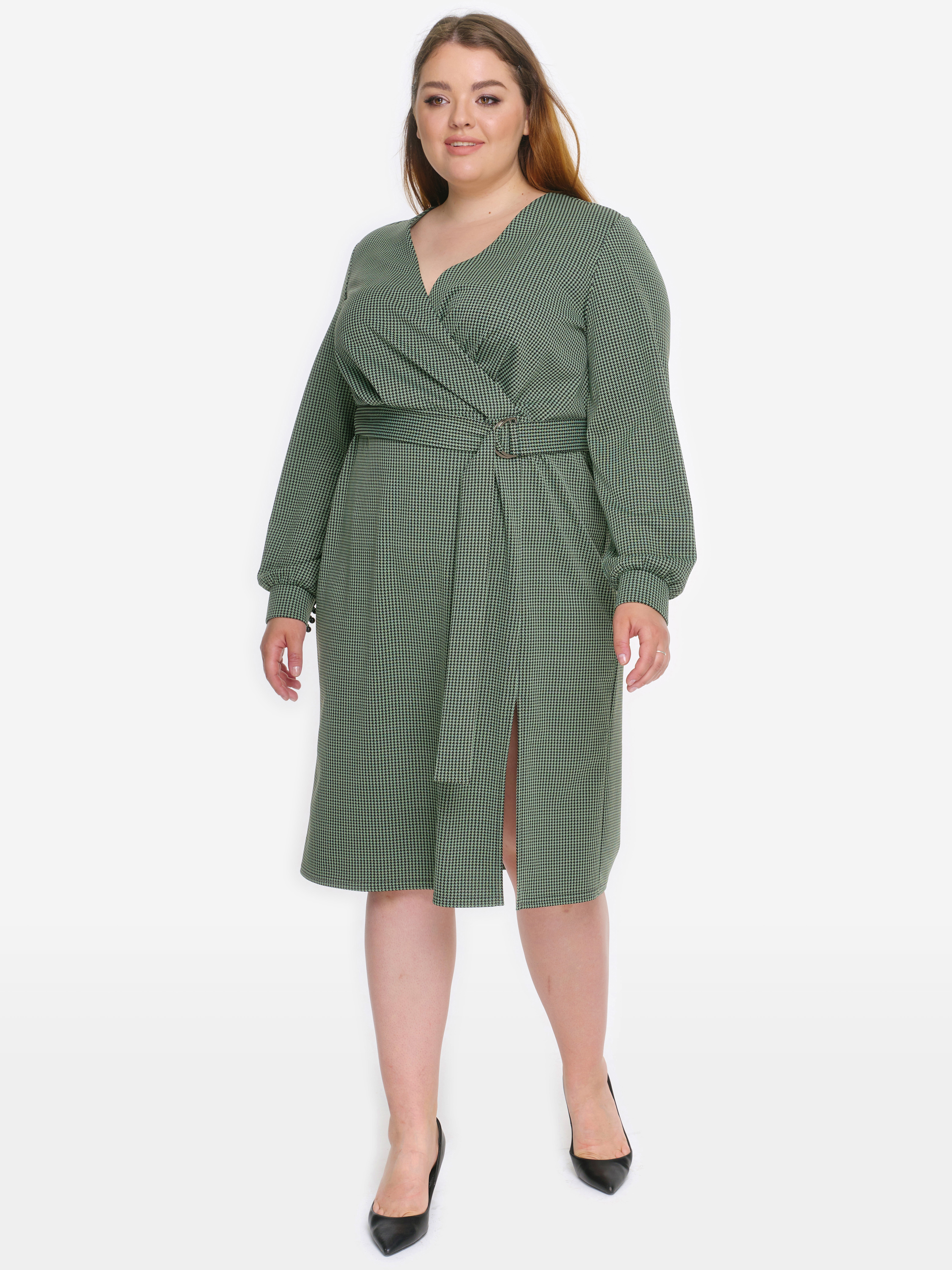 Платье из джерси полуприлегающего силуэта в актуальном принте "гусиная лапка". Верхняя часть переда отрезная на уровне талии, с запАхом. По юбке переда разрез на уровне левого рельефа. Рукав длинный, свободный, со сборкой по нижнему срезу. Рукав заканчивается манжетом, застегивающимся на 3 пуговицы и навесные петли. Пояс фиксируется двумя полукольцами.