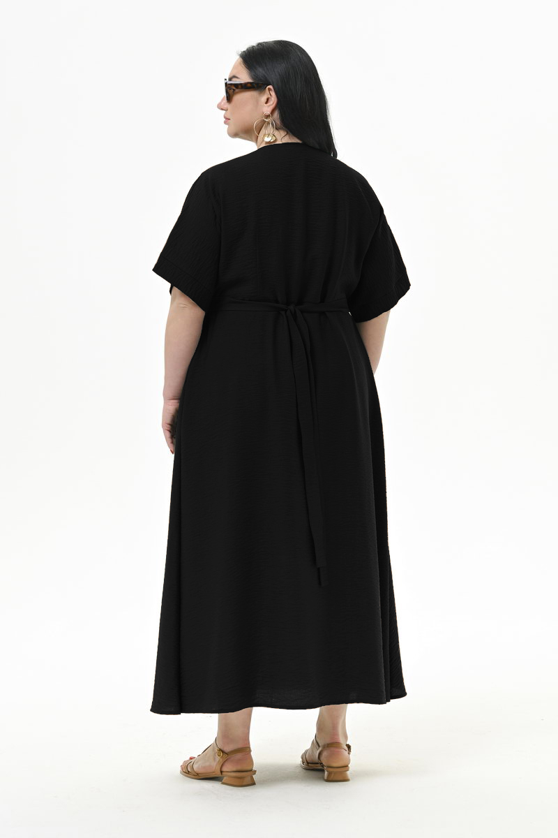 Удлиненное городское платье с запАхом из фактурной вискозы, отрезное по линии талии. Линия плеча спущена и заканчивается планочкой-манжетом.