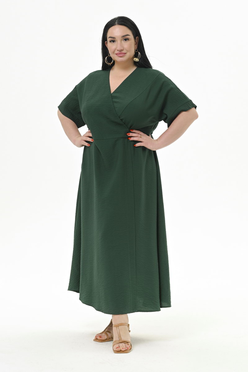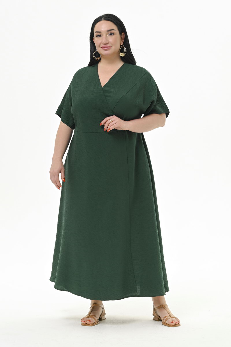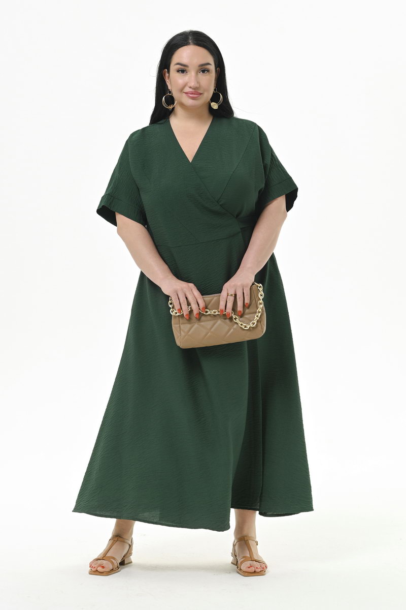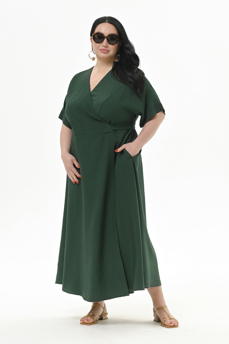 Удлиненное городское платье с запАхом из фактурной вискозы, отрезное по линии талии. Линия плеча спущена и заканчивается планочкой-манжетом.