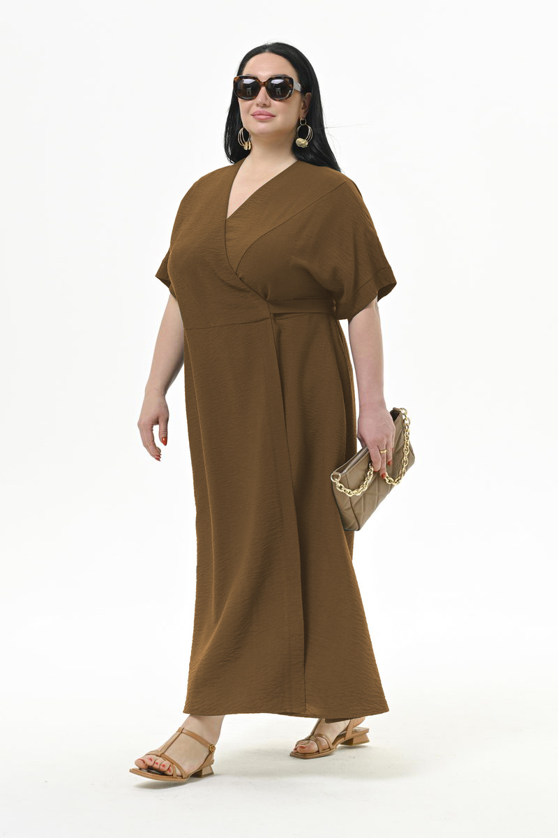 Удлиненное городское платье с запАхом из фактурной вискозы, отрезное по линии талии. Линия плеча спущена и заканчивается планочкой-манжетом.