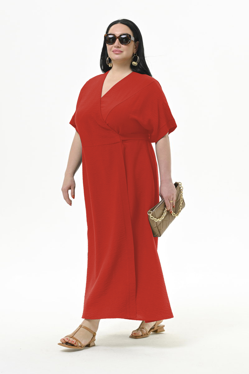 Удлиненное городское платье с запАхом из фактурной вискозы, отрезное по линии талии. Линия плеча спущена и заканчивается планочкой-манжетом.