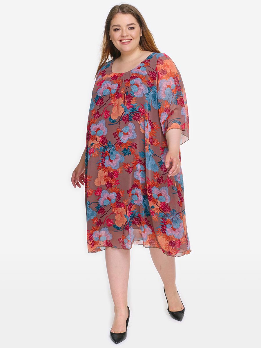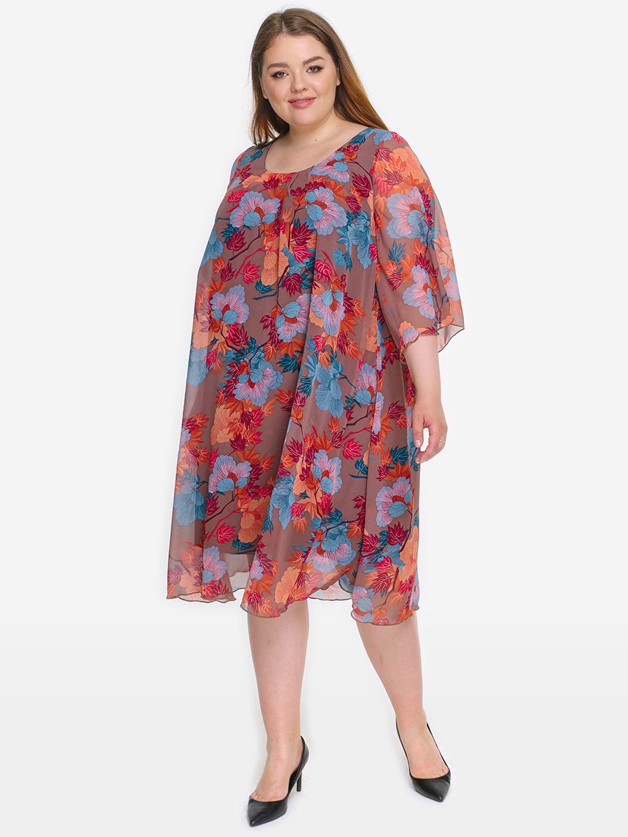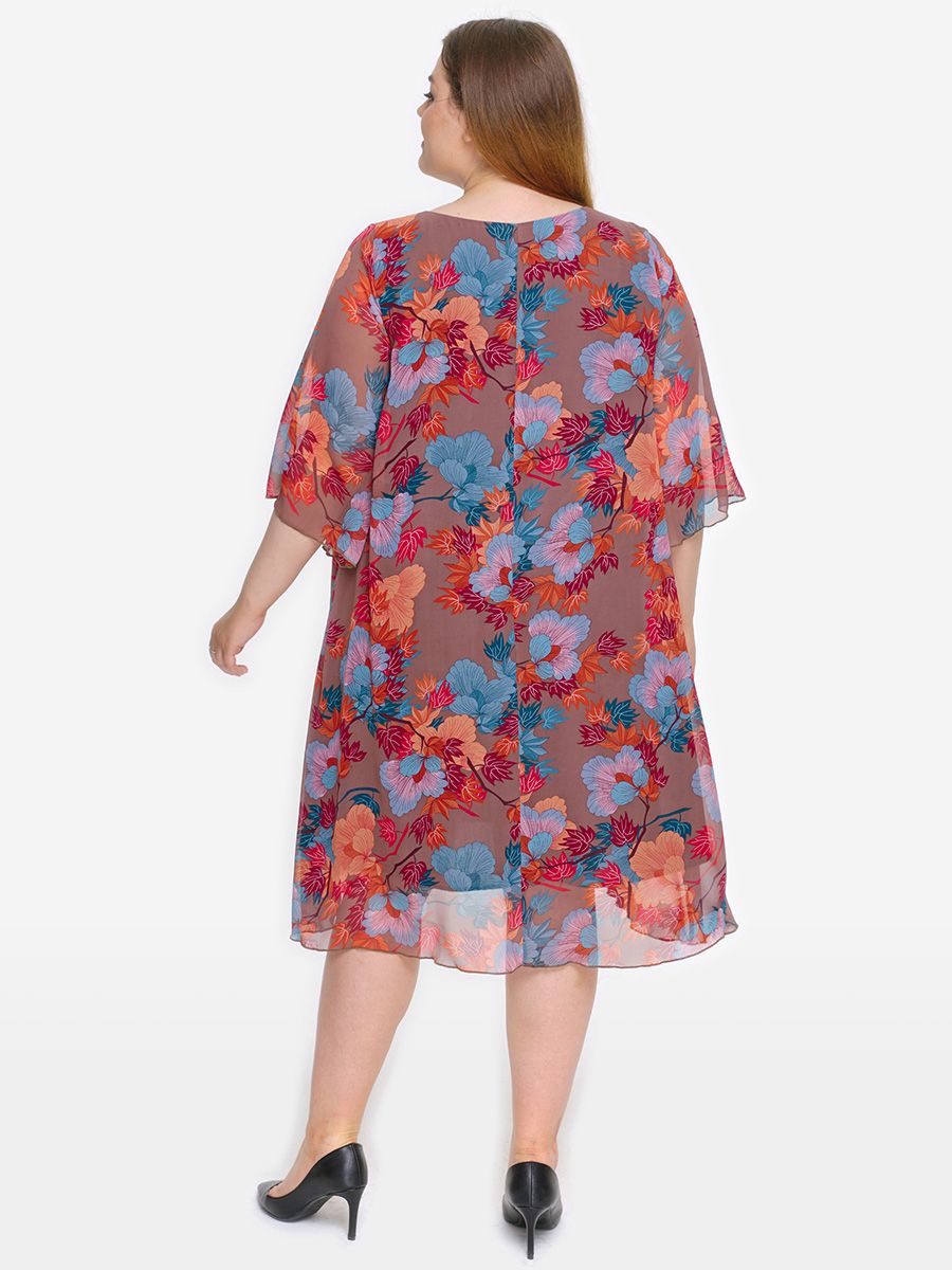 Платье с защипами по горловине, шифон кофейный, принт яркий